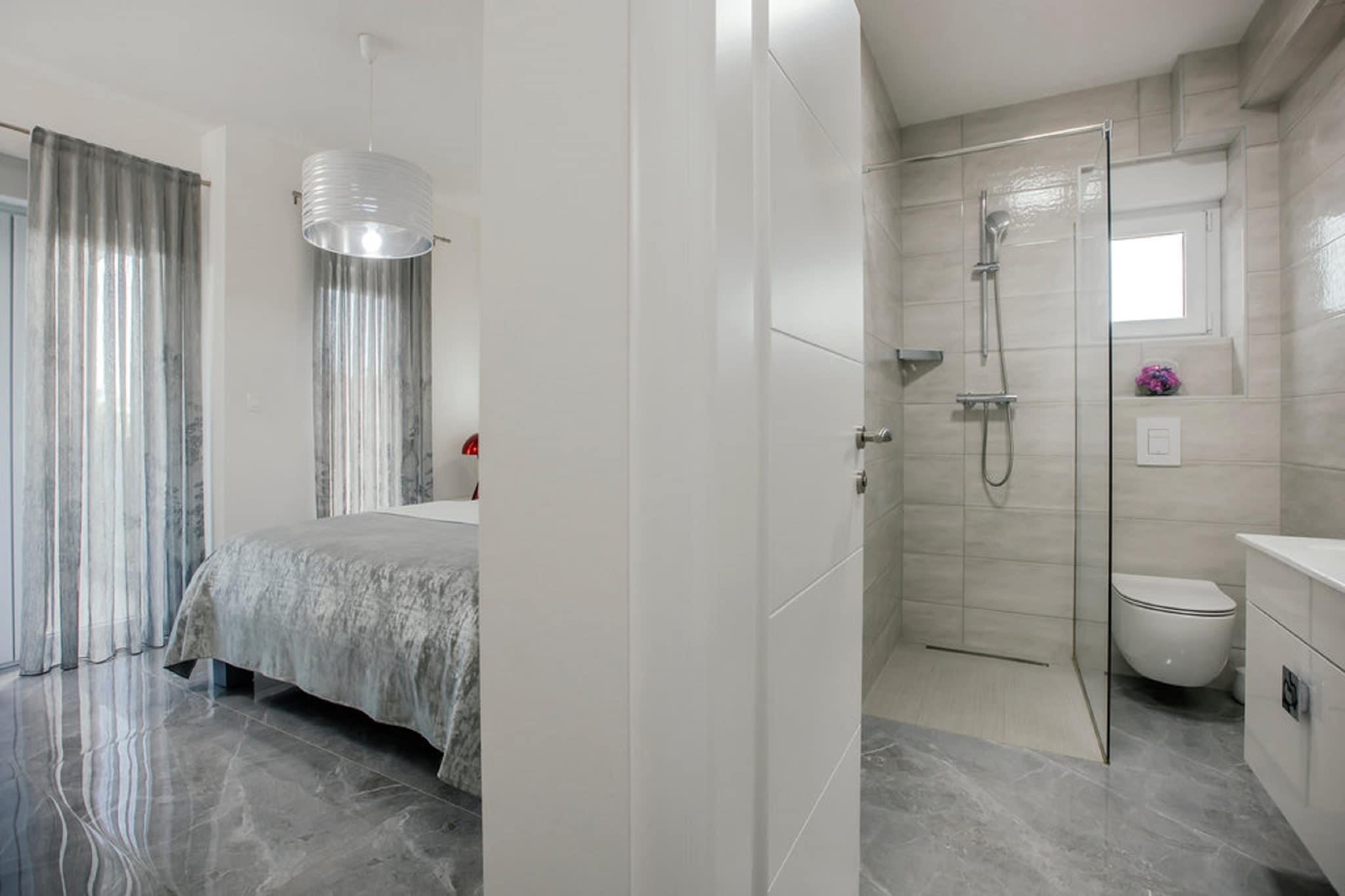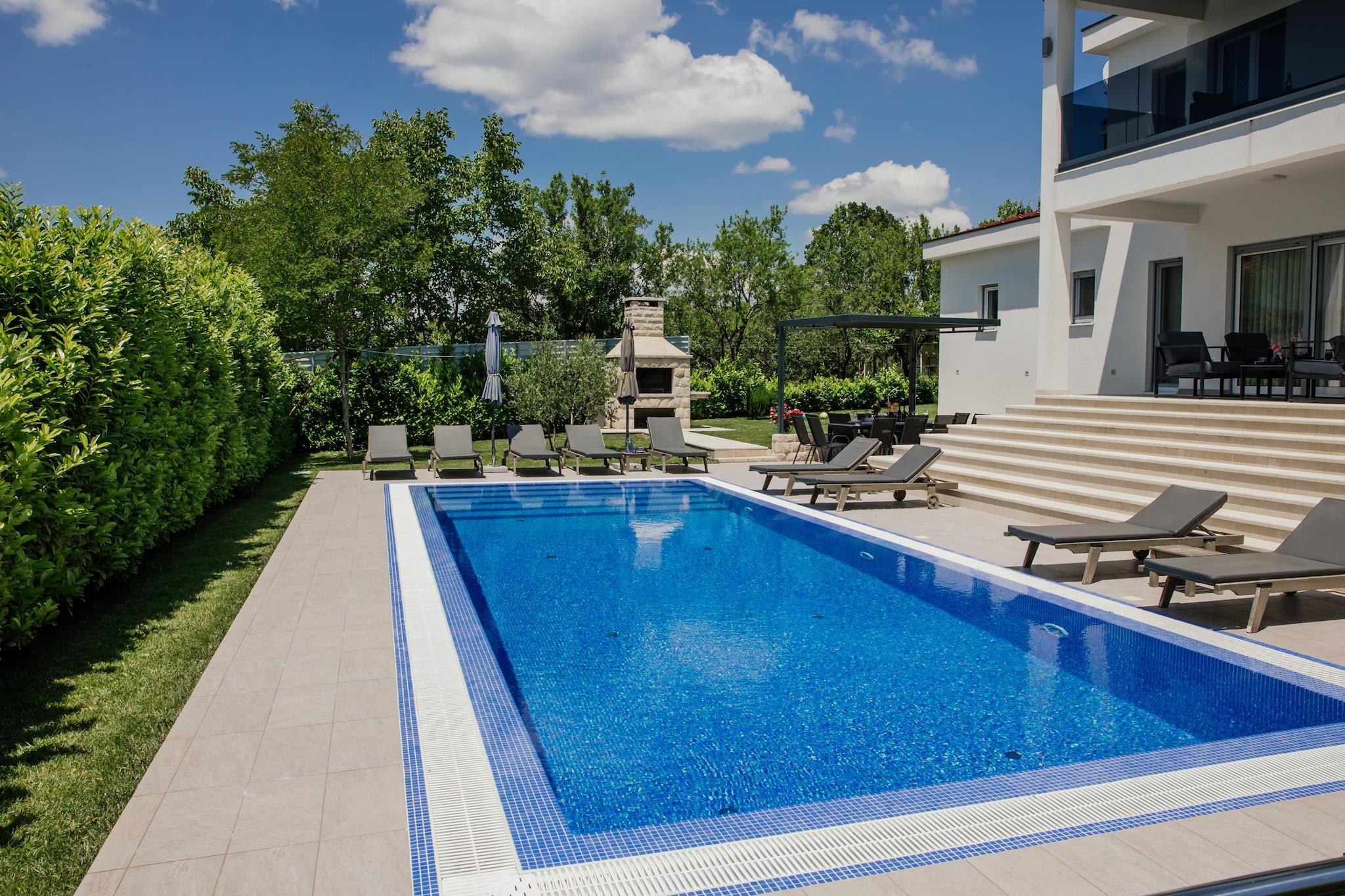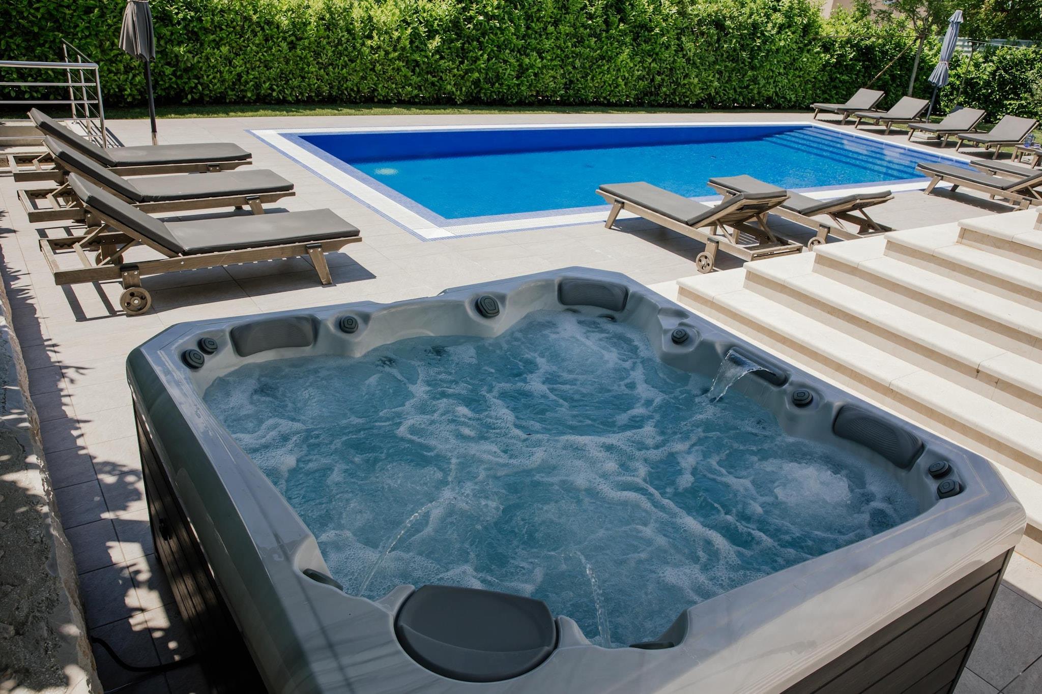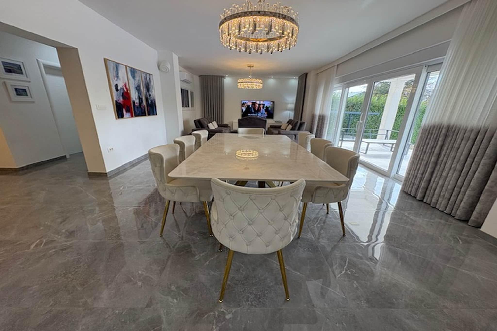 Villa is located in a quiet part of the town of Imotski and is 4.5 km from the town center. The house is stylishly decorated and is located on a completely fenced green plot, which includes a swimming pool, parking lot and children's playground, as well as an area for fun and enjoyment. The house is entered through a spacious hall from which stairs lead to the first floor. On the ground floor there is a room, a large bathroom and an "open space" kitchen-dining room-living room from which there is direct access to a covered terrace and a large infinity pool. Next to the pool there is another covered terrace, a hot tub for 5 people and 12 deckchairs for sunbathing and a brick grill. On the ground floor there is also an entertainment room with billiards, table tennis, table football and darts. Upstairs there are 4 rooms and three bathrooms and another large covered terrace and covered balcony. About 100 m from the house there is a public multifunctional football and basketball court and a children's park, which are free to use. The house is 50 m from the bike path and about 5 km from the Blue and Red Lakes.