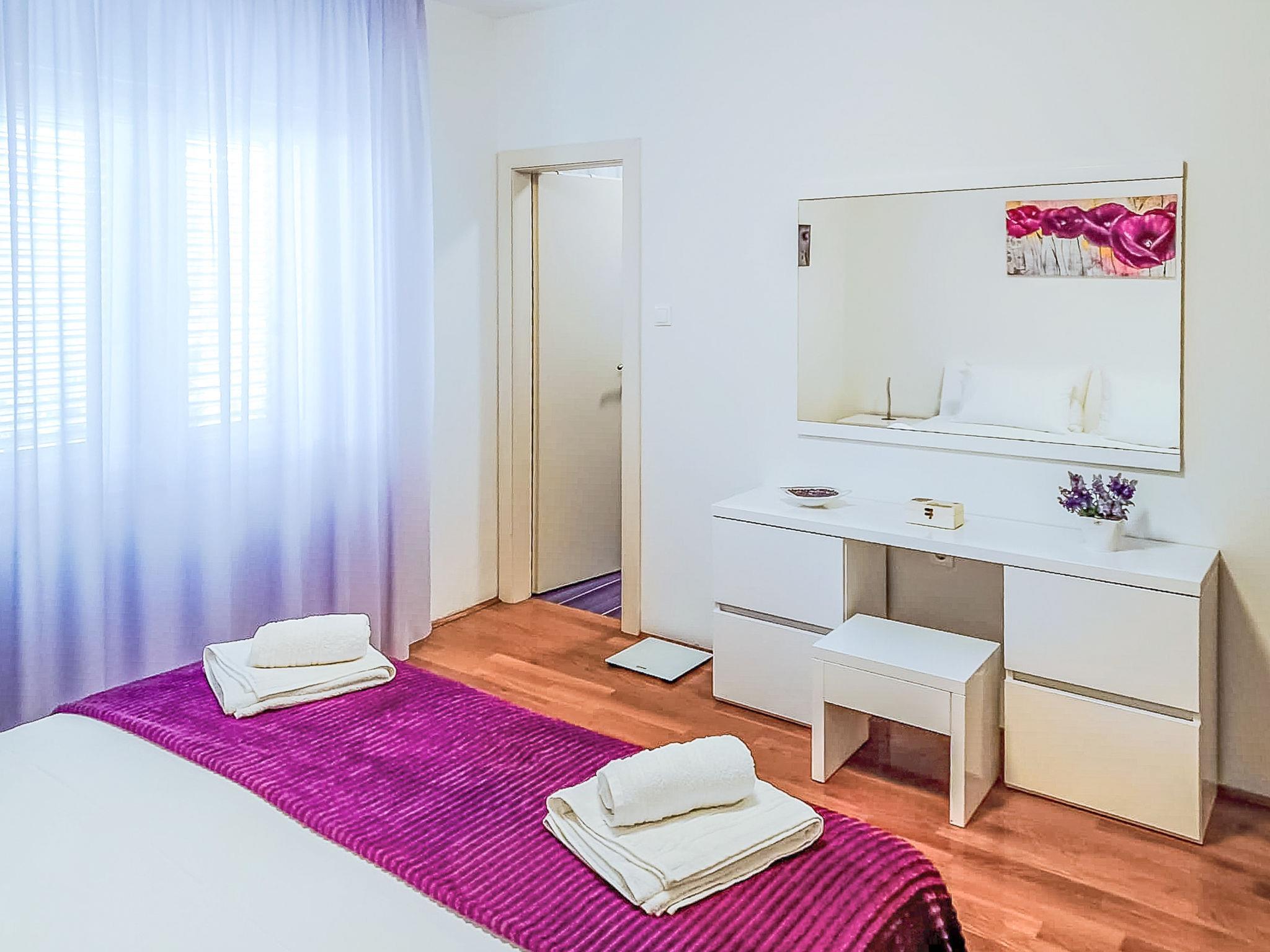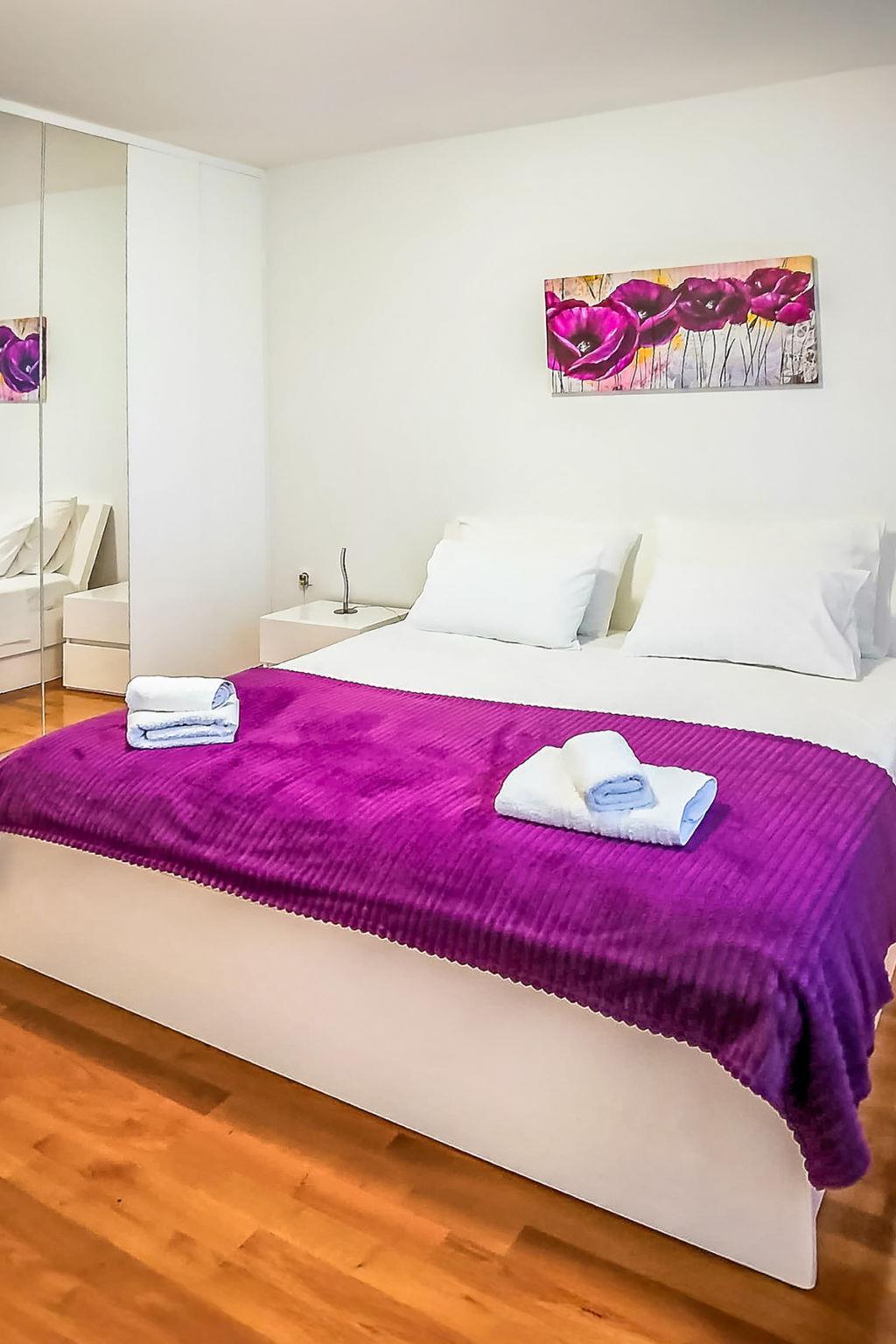 3-room apartment 140 m2 on 1st floor. Beautiful and tasteful furnishings: living/dining room with 1 sofabed (150 cm, length 200 cm), satellite TV and air conditioning. Exit to the balcony. 2 rooms, each room with 1 french bed (160 cm, length 200 cm). 1 room with 1 french bed (140 cm, length 200 cm), shower/WC. Open kitchen (oven, dishwasher, 4 ceramic glass hob hotplates, freezer, electric coffee machine). Shower/WC. Terrace furniture. Beautiful view of the sea.