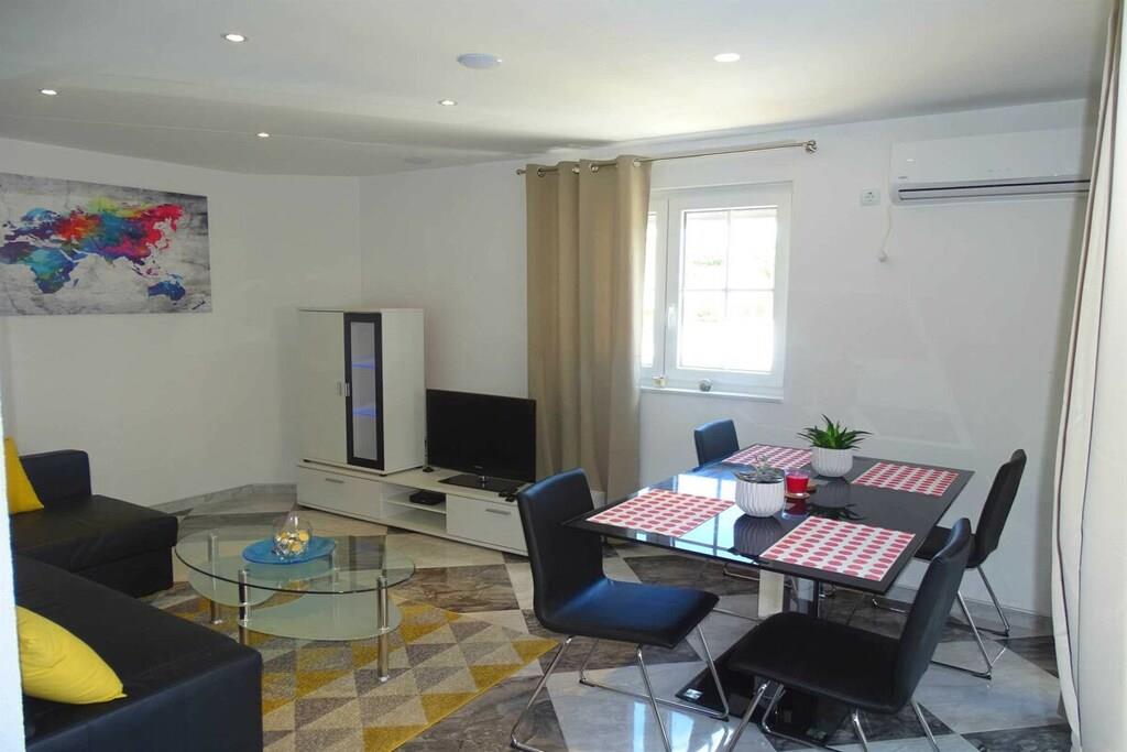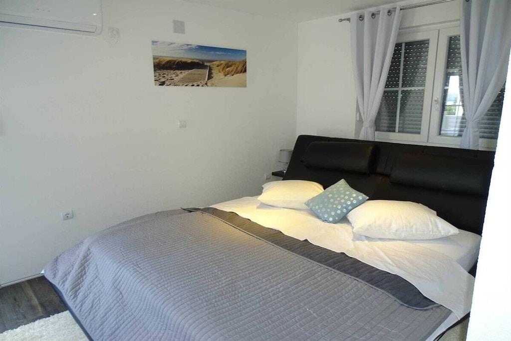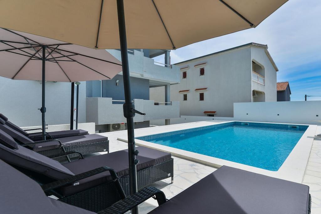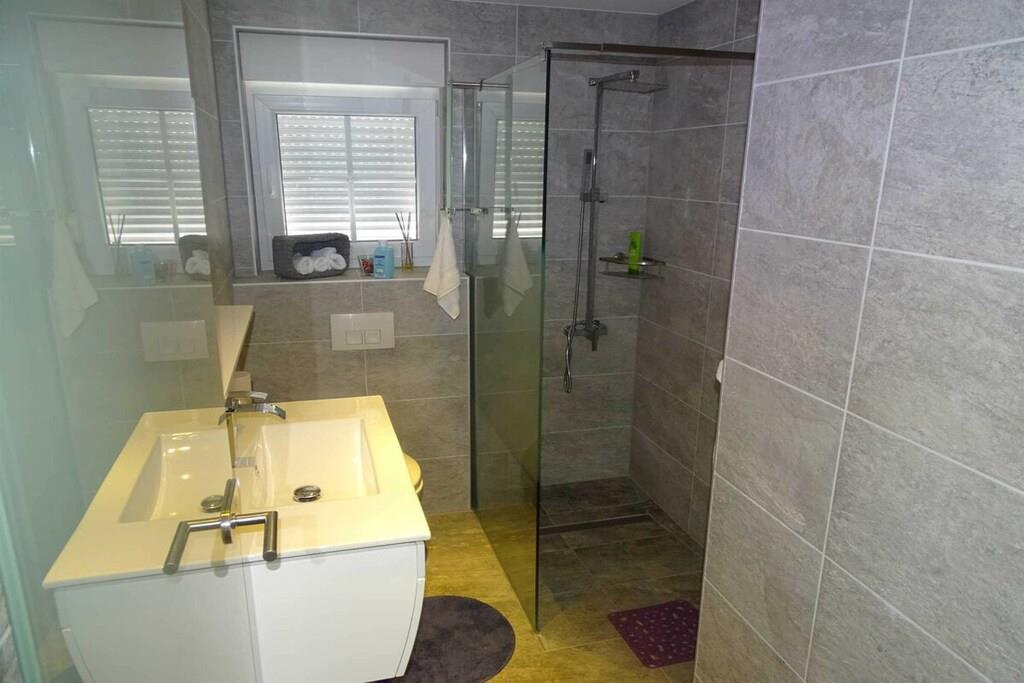 Das geräumige moderne Ferienhaus in perfekter Lage, nur 400 m vom Strand entfernt, mit privatem Pool bietet Privatsphäre und Zugang zu allem, was Sie für einen perfekten Urlaub benötigen. Das Haus besteht aus zwei Wohnungen mit zwei Schlafzimmern und einer Wohnung mit einem Schlafzimmer. Insgesamt gibt es also fünf Schlafzimmer und fünf Bäder. Zwei Wohnungen haben einen Balkon mit herrlichem Meerblick. Die Küchen in den Appartements sind komplett mit neuen Geräten ausgestattet und sofort einsatzbereit. Die Esszimmer, Wohnzimmer und Balkone sind geschmackvoll eingerichtet. Das Ferienhaus bietet 4 kostenlose Privatparkplätze, einen 32 m2 großen Swimmingpool, einen Steingrill, einen Aufenthaltsraum im Freien und einen Essbereich im Freien.