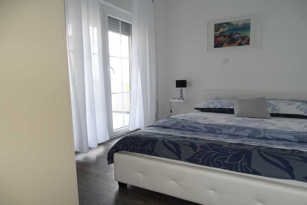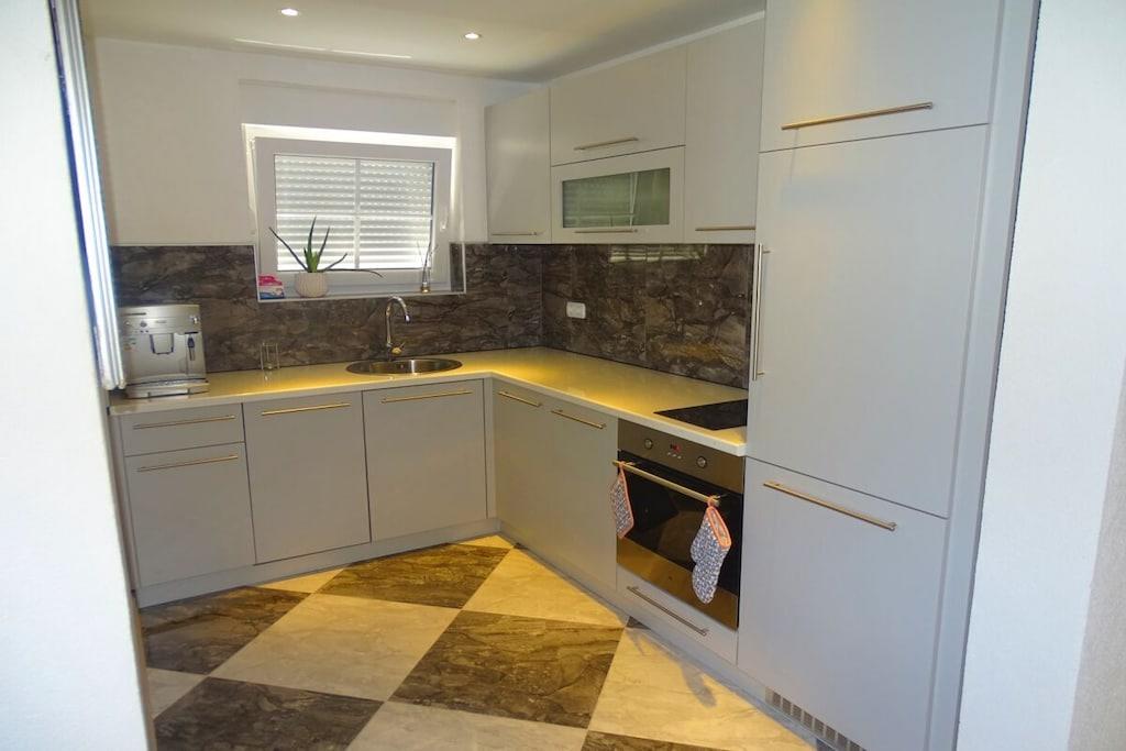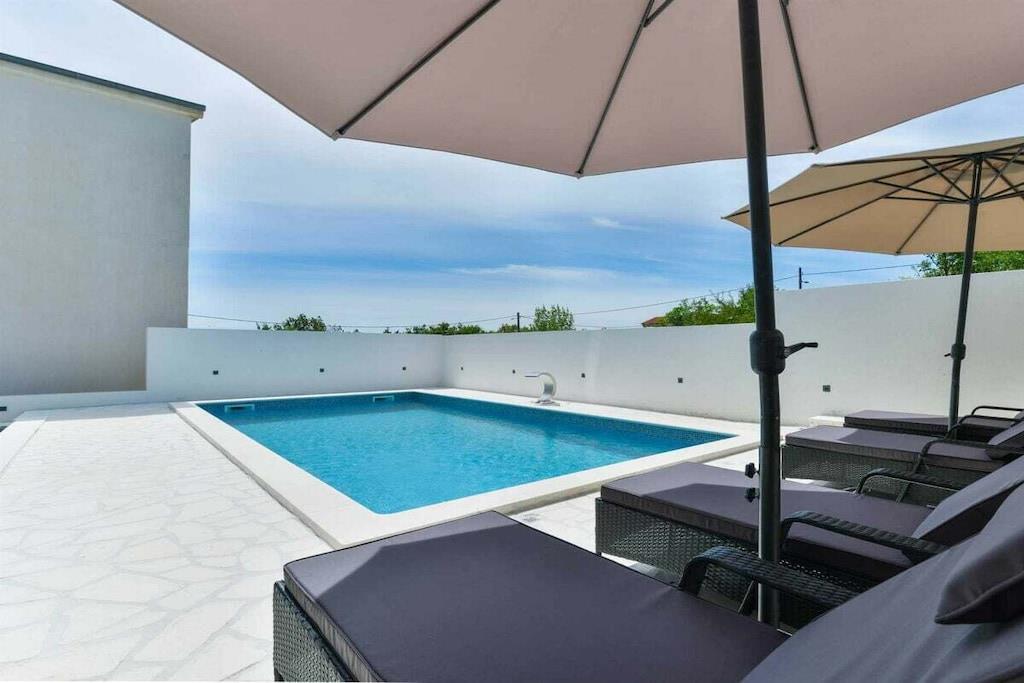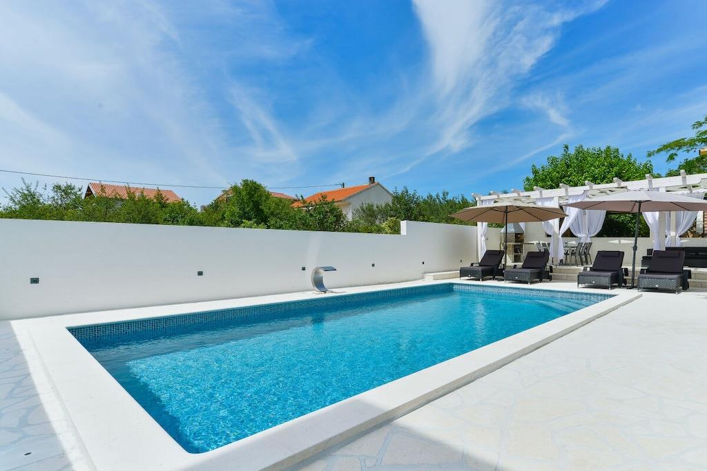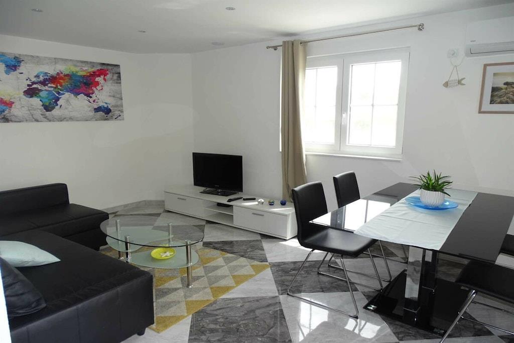 Das geräumige moderne Ferienhaus in perfekter Lage, nur 400 m vom Strand entfernt, mit privatem Pool bietet Privatsphäre und Zugang zu allem, was Sie für einen perfekten Urlaub benötigen. Das Haus besteht aus zwei Wohnungen mit zwei Schlafzimmern und einer Wohnung mit einem Schlafzimmer. Insgesamt gibt es also fünf Schlafzimmer und fünf Bäder. Zwei Wohnungen haben einen Balkon mit herrlichem Meerblick. Die Küchen in den Appartements sind komplett mit neuen Geräten ausgestattet und sofort einsatzbereit. Die Esszimmer, Wohnzimmer und Balkone sind geschmackvoll eingerichtet. Das Ferienhaus bietet 4 kostenlose Privatparkplätze, einen 32 m2 großen Swimmingpool, einen Steingrill, einen Aufenthaltsraum im Freien und einen Essbereich im Freien.