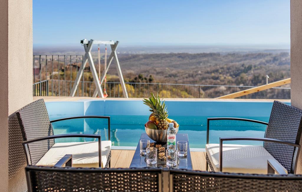 Lassen Sie sich auf den Terrassen vom fantastischen Blick auf die Landschaft verzaubern. Genießen Sie in vollen Zügen die Sonne und erfrischen Sie sich nach Belieben im Pool.