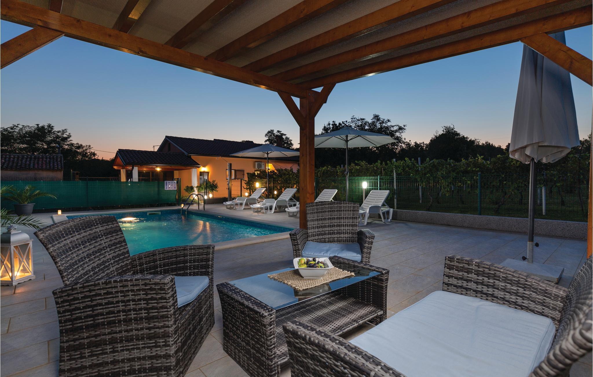 Dieses schöne Ferienhaus mit Pool befindet sich in dem Dorf Topid, nur etwa 20 Autominuten von wunderschönen Stränden entfernt. Es ist hell und freundlich eingerichtet und verfügt über eine Terrasse und einen Grill, an dem Sie köstliche Gerichte zubereiten können. Eingebettet zwischen der Dorfstraße und den Weinbergen sowie einer Wiese bietet das Haus viel Platz für Ruhe und Entspannung. An heißen Sommertagen erfrischen Sie sich im Pool, während die jüngeren Familienmitglieder unbeschwert spielen. Labin liegt nicht weit entfernt und bietet mit seiner historischen Altstadt viele Möglichkeiten zum Einkaufen, Flanieren oder Essen gehen. Besuchen Sie auch die Kunstgalerien und das Museum. Während Ihres Aufenthaltes empfehlen wir Ihnen die Stadt Pula zu besuchen, die für ihr Amphitheater Arena bekannt ist, in dem Open-Air Konzerte weltberühmter Künstler, das Pula Film Festival und viele andere Veranstaltungen in unglaublichem Ambiente stattfinden.