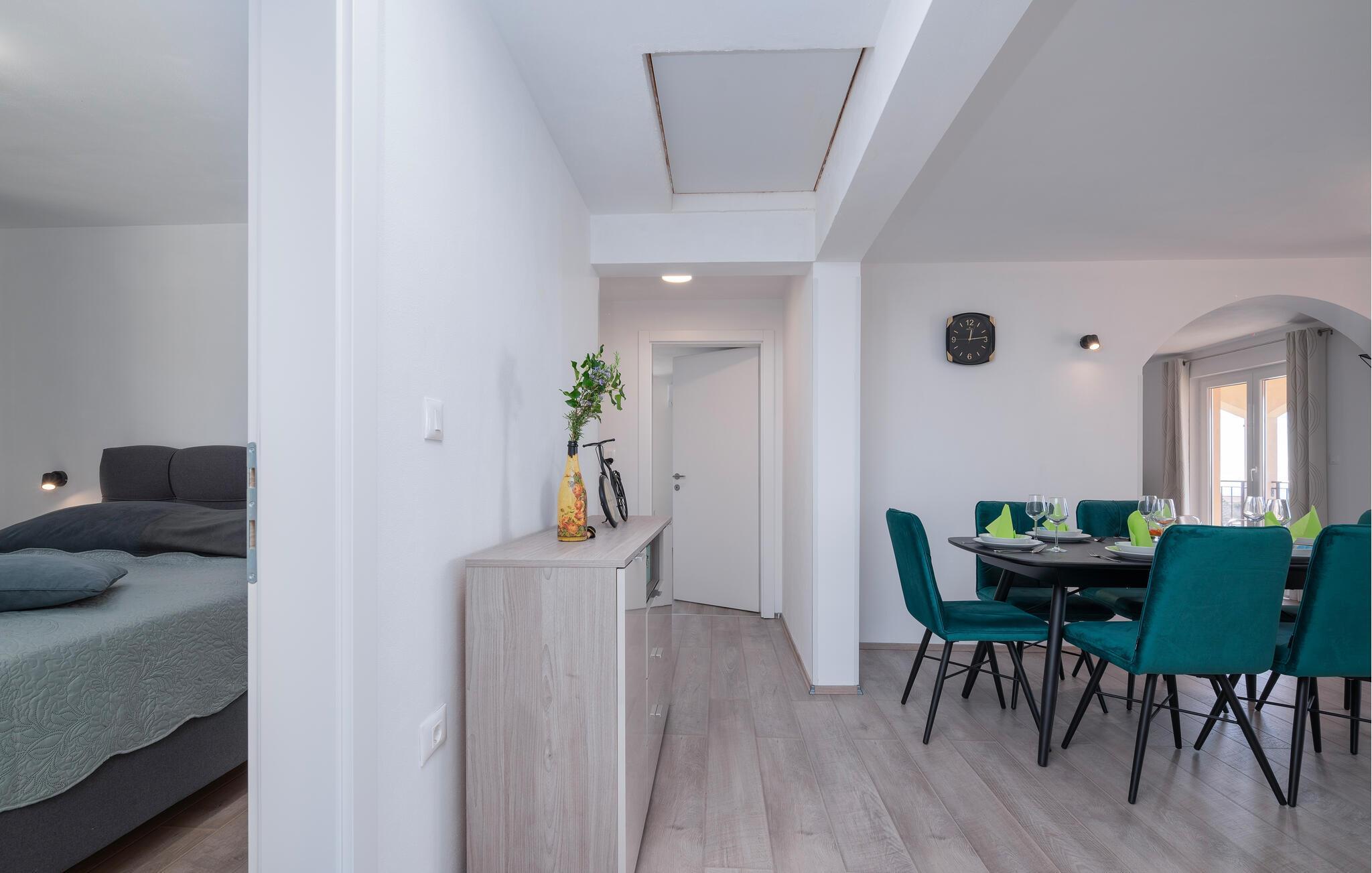 Entspannen Sie in dieser hellen und modern dekorierten Ferienwohnung, die Ihnen mit farblichen Möbelakzenten ein schönes Wohnambiente bietet. Genießen Sie vom Sofa den Ausblick auf die Landschaft und sogar auf das Meer und zaubern in der Küche leckere Mahlzeiten, die Sie auf der großzügig überdachten Terrasse mit Blick auf das Meer genießen und dort auch entspannen können. Nach einer ruhigen Nacht bietet Ihnen eines der Schlafzimmer einen Balkon mit Blick ins Grüne, wachen Sie hier entspannt auf und trinken Ihren ersten Kaffe.