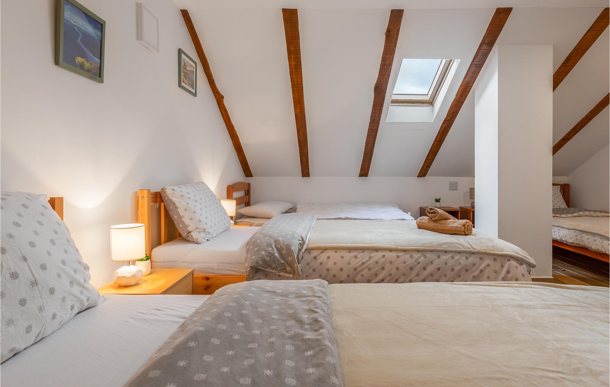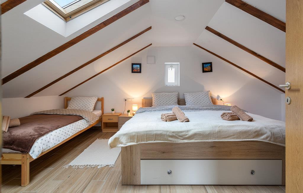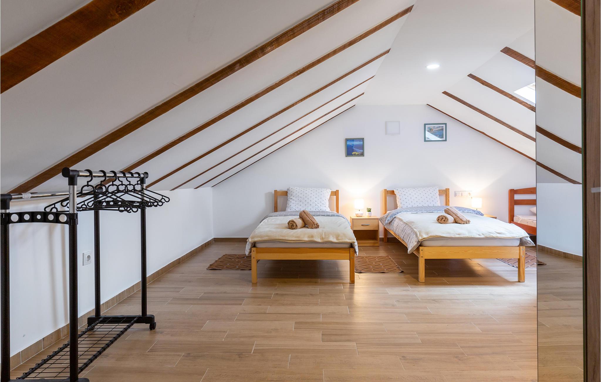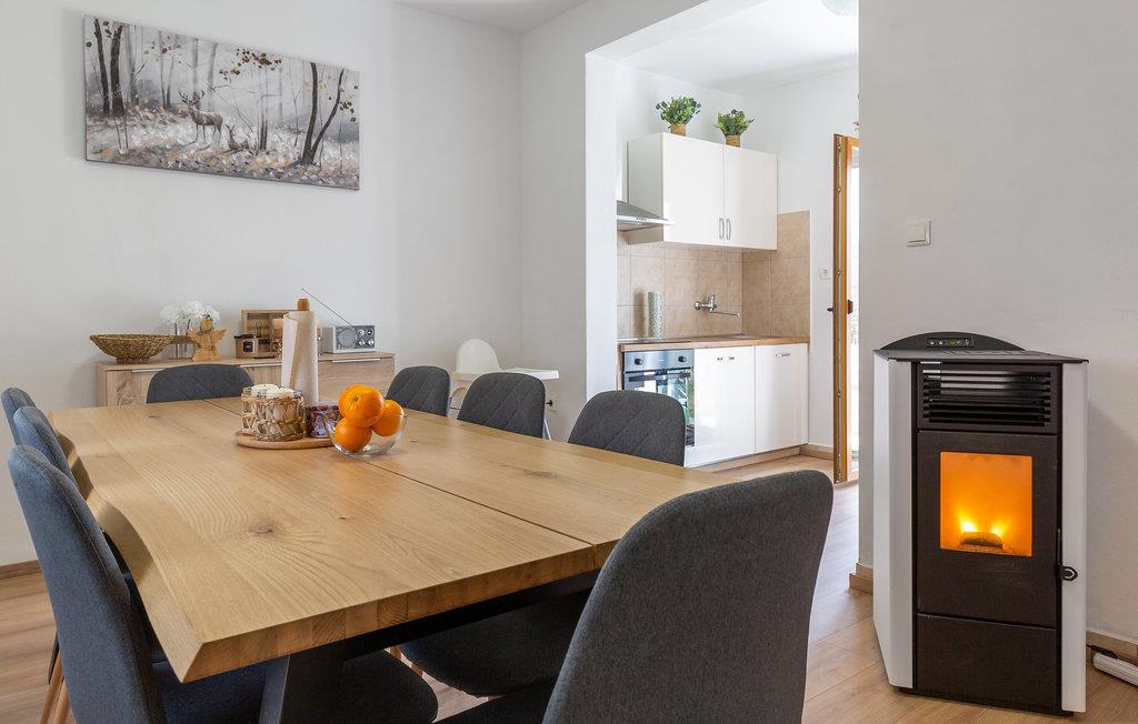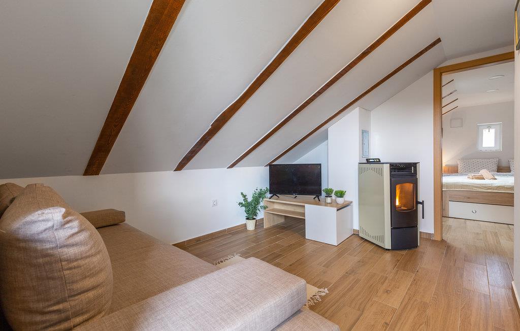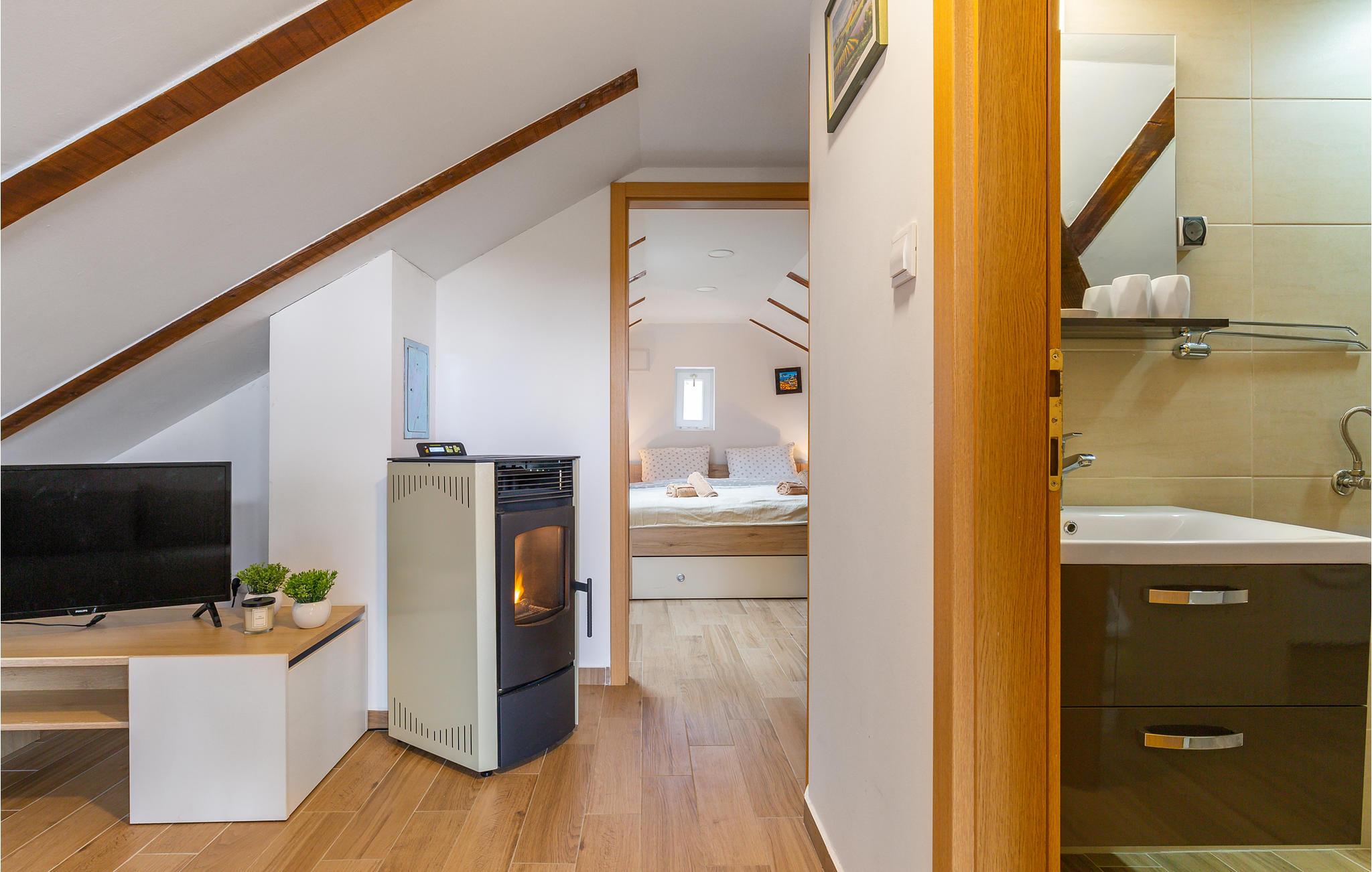 Dieses vielseitige Ferienhaus ist umgeben von herrlicher Natur und liegt auf einem Grundstück mit etwa 30.000 m². Es besteht aus zwei Etagen, die mit Außentreppen verbunden sind. Auf der überdachten Terrasse im Hof, die mit Glaswänden geschlossen ist, finden Sie auch einen Wellnessbereich mit Holzbadetonne und Sauna für 6 Personen, wo Sie Ihrem Körper Entspannung schenken können. Daneben ist auch der Grill mit Gartenmöbeln, der im Urlaub nicht fehlen darf. Auf diesem Anwesen gibt es auch zahlreiche unterhaltsame Freizeitmöglichkeiten für Kinder und Erwachsene. Von der Hauptstraße bis zum Haus sind 300 m nicht asphaltiert. Besuchen Sie das Museum von Nikola Tesla in Gospic, den Nationalpark Plitwitzer Seen, die längste Zip-Line in Europa, das Bärenrefugium in Kuterevo und die Höhlen in Cerovac.