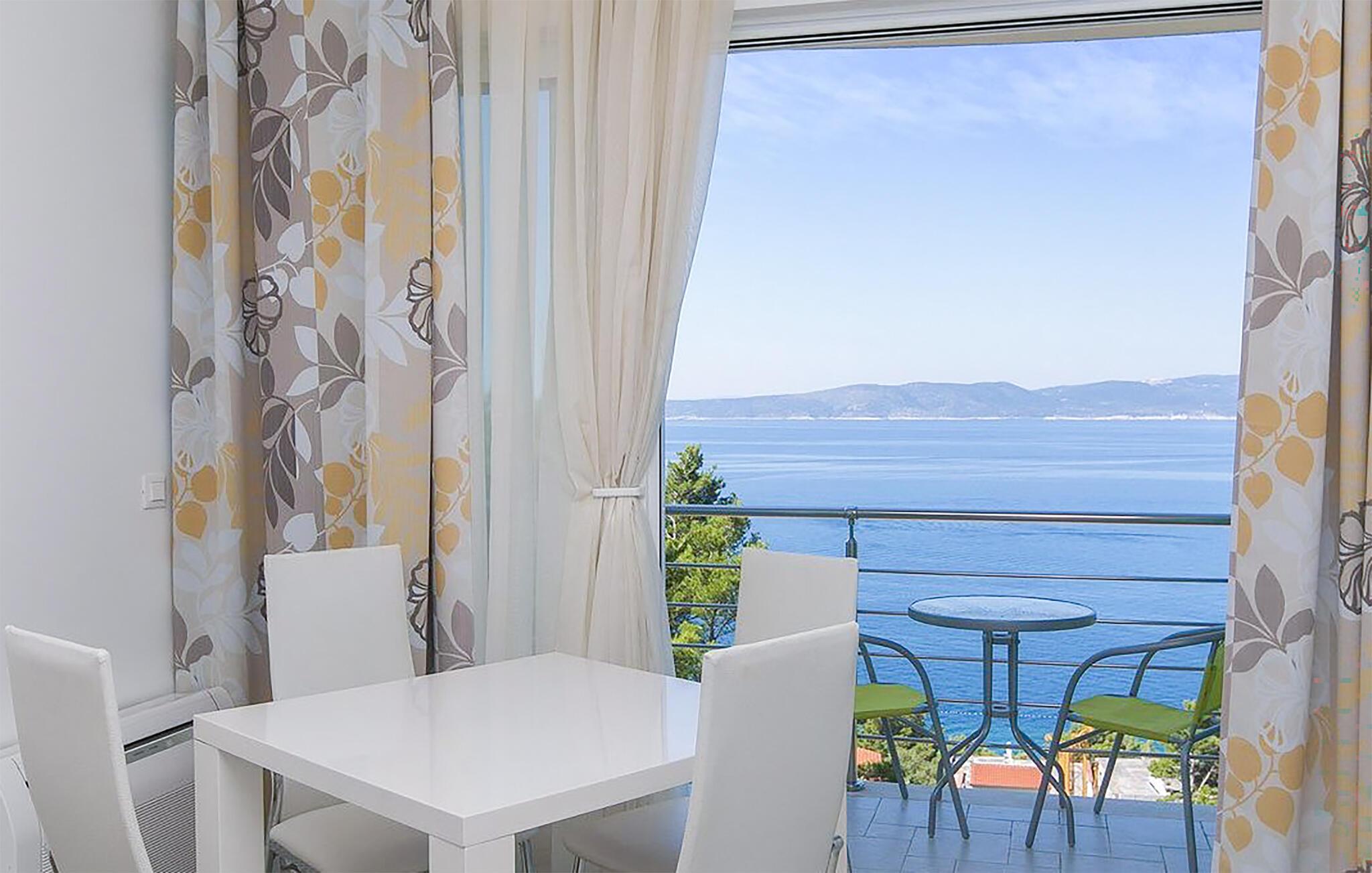 Treten Sie hinaus auf den großzügigen Balkon und lassen Sie Ihren Blick über die Küste, die vorgelagerten Inseln und das tiefblaue Wasser schweifen. Nehmen Sie am Balkontisch Platz und genießen Sie hier Ihren Morgenkaffee. Beobachten Sie die vorbeiziehenden Boote und erleben Sie stimmungsvolle Sonnenuntergänge über der Adria.