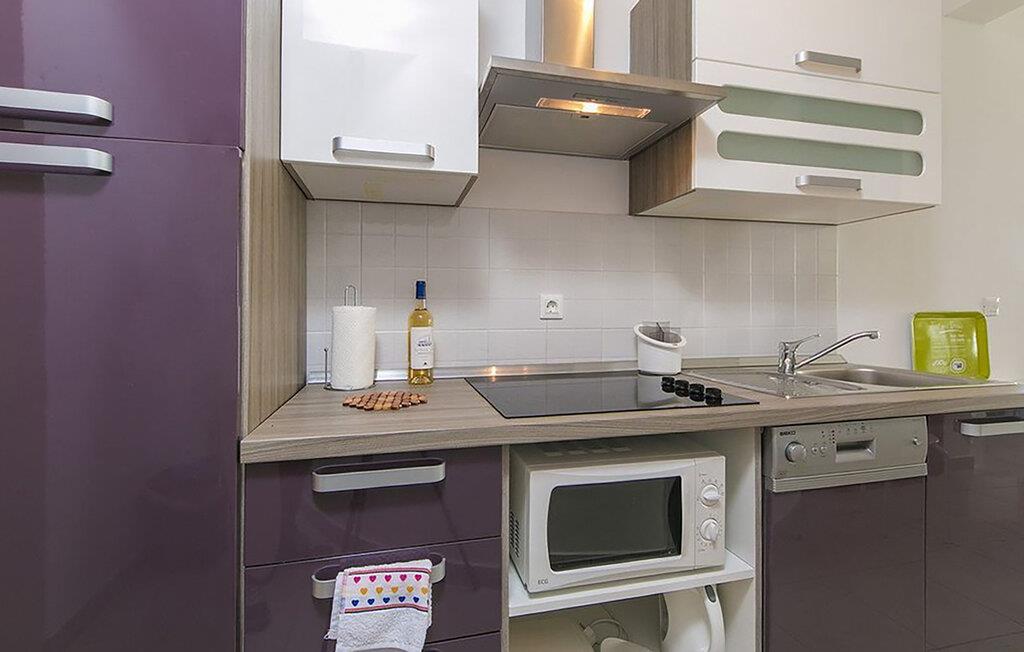 Lassen Sie sich beim Betreten Ihrer hellen Ferienwohnung sofort vom weiten Blick auf die Adria begeistern. Nehmen Sie im Wohnbereich auf dem Sofa Platz und genießen Sie das eindrucksvolle Panorama durch die großen Fenstertüren. Der offen gestaltete Raum verbindet Wohnen, Essen und Kochen auf harmonische Weise. Bereiten Sie in der kompakten, funktionalen Küche Ihre Mahlzeiten zu und decken Sie den Esstisch am Fenster, um mit direktem Meerblick zu speisen. Ziehen Sie sich abends in das Schlafzimmer zurück, öffnen Sie die Balkontür und lassen Sie die frische Meeresluft herein. Morgens wachen Sie mit dem wundervollen Meerblick auf.