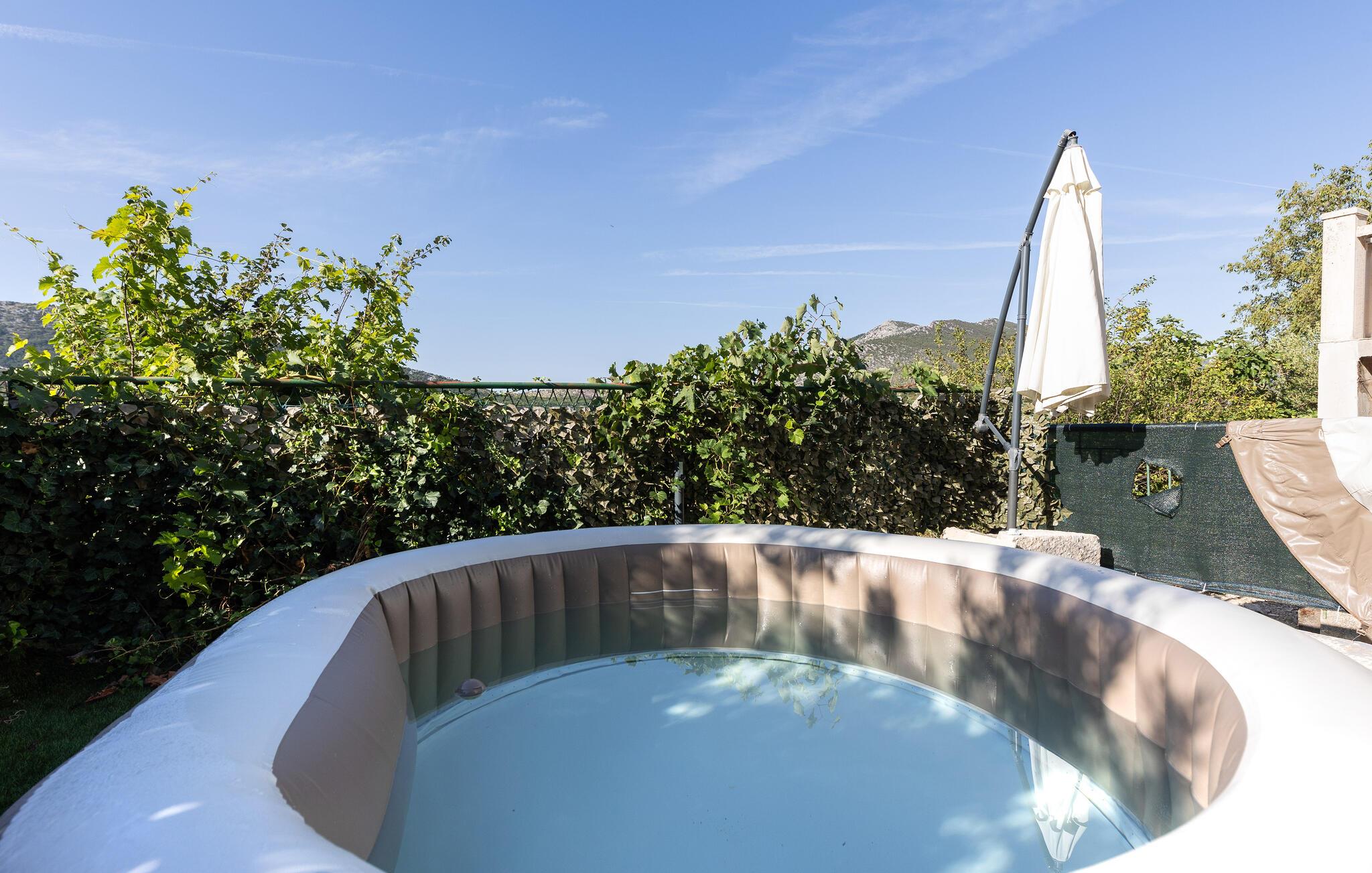 Starten Sie mit einem duftenden Kaffee auf der Terrasse in Ihren Tag und genießen Sie den Blick in die mediterrane Landschaft. Springen Sie für eine Erfrischung jederzeit in den Whirlpool und lehnen Sie sich anschließend entspannt auf der Sonnenliege zurück. Abends lädt die Terrasse dazu ein, den Tag bei einem guten Glas kroatischem Wein ausklingen zu lassen.
