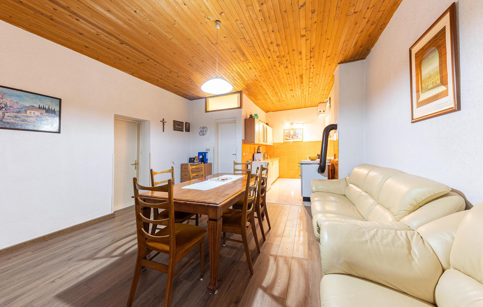 Dieses malerisch gelegene Haus ist wie geschaffen für eine erholsame Auszeit vom Alltag, in der Sie schnell zur Ruhe kommen. Ein gemütlicher Wohnraum mit naturfarbener Holzdecke, ein bequemes Sofa und eine praktische Küche laden zu entspannten Stunden im Kreise Ihrer Lieben ein. Egal ob Sie einen Podcast hören oder gemeinsam kochen, hier tanken Sie schnell neue Energie.