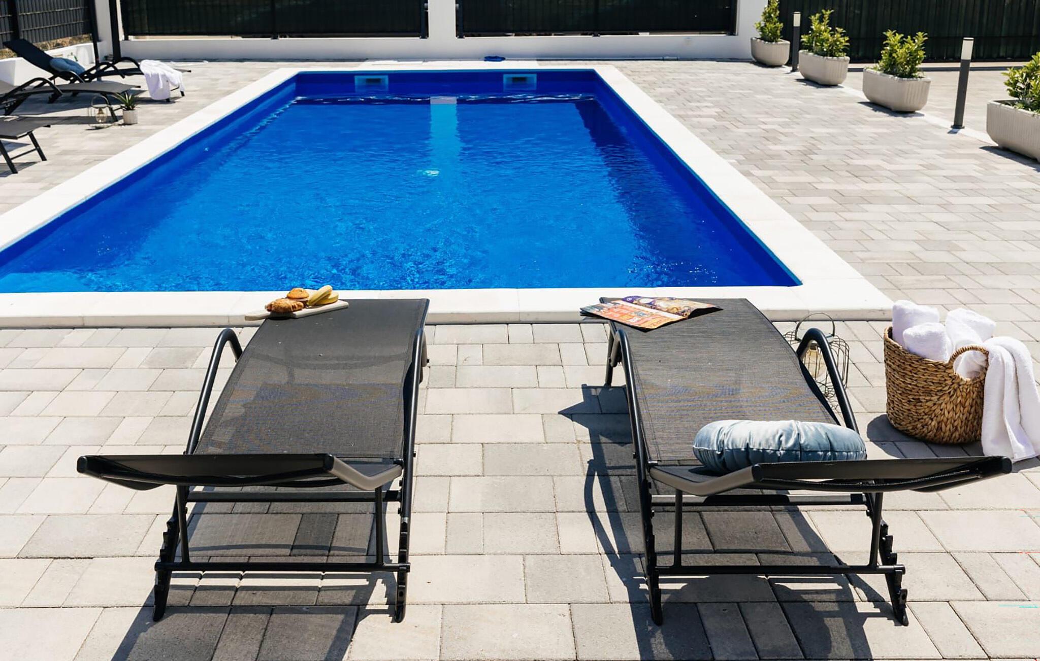 Spazieren Sie barfuß auf Ihre großzügige Terrasse, tauchen Sie in den glitzernden Pool ein und servieren Sie ein köstliches Frühstück auf der Terrasse. Tanken Sie neue Energie auf der Sonnenliege, spielen Sie eine Runde Tischtennis und plaudern Sie bei einem Glas Wein bis in die lauen Sommernächte hinein.