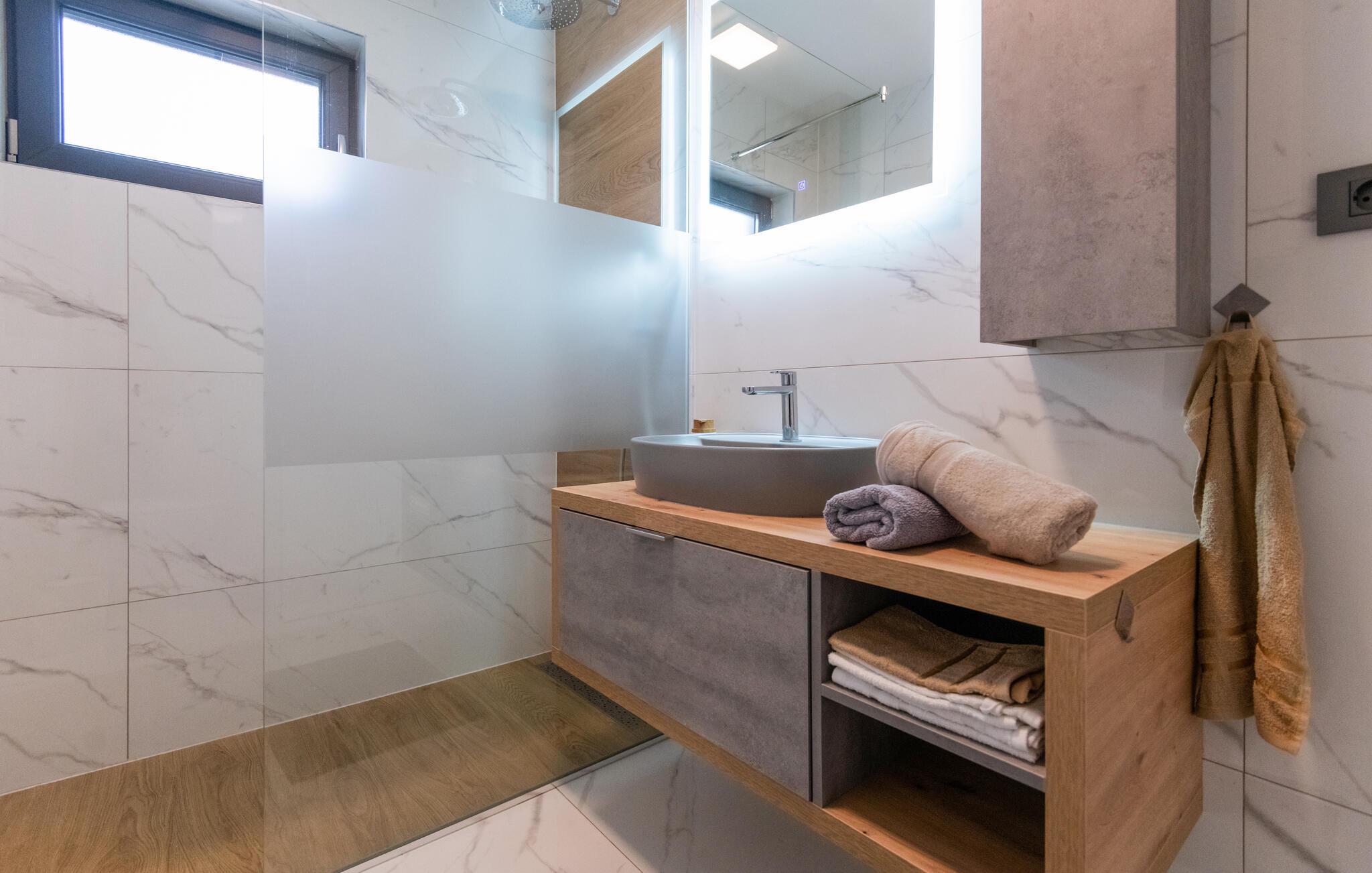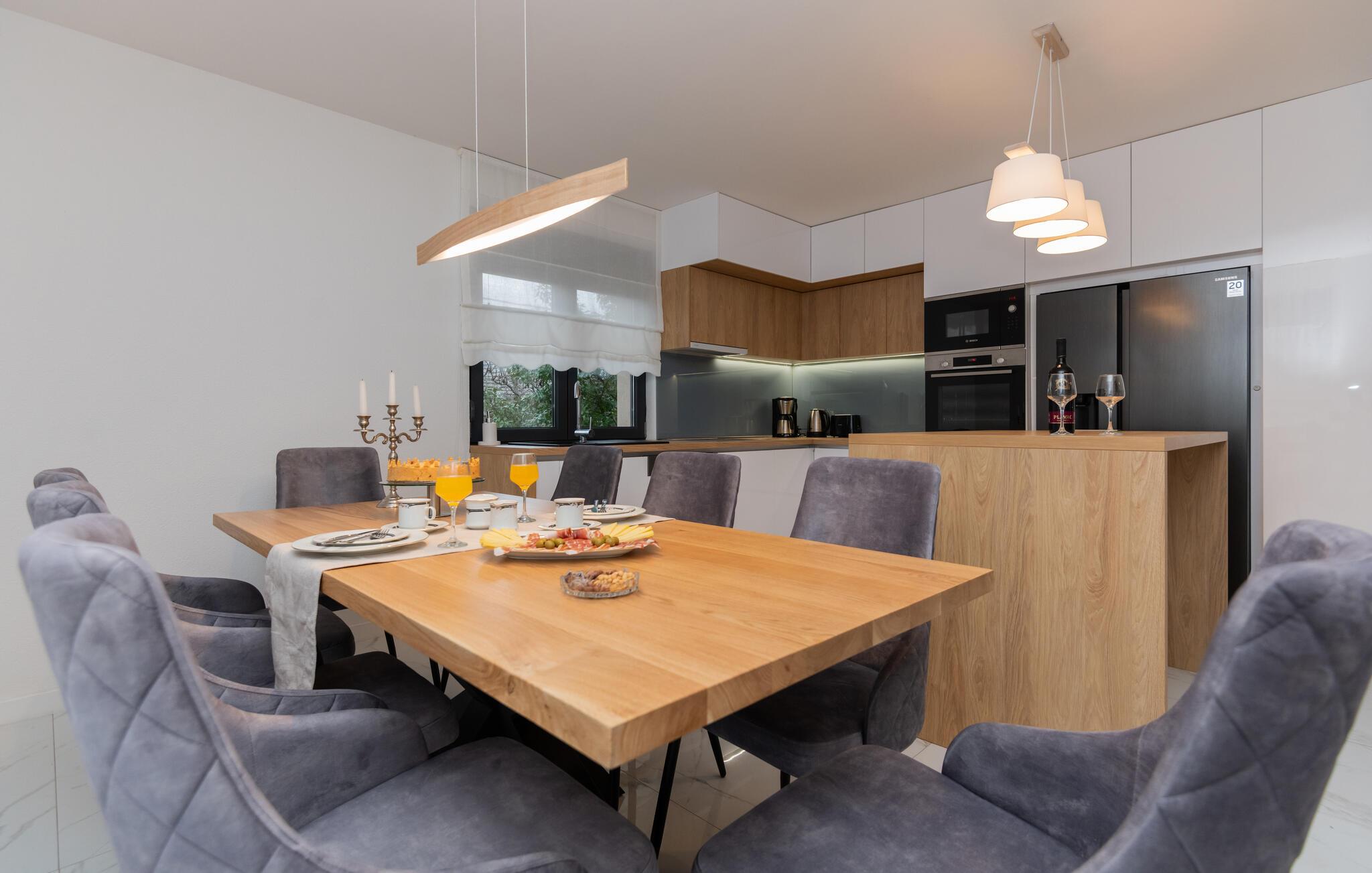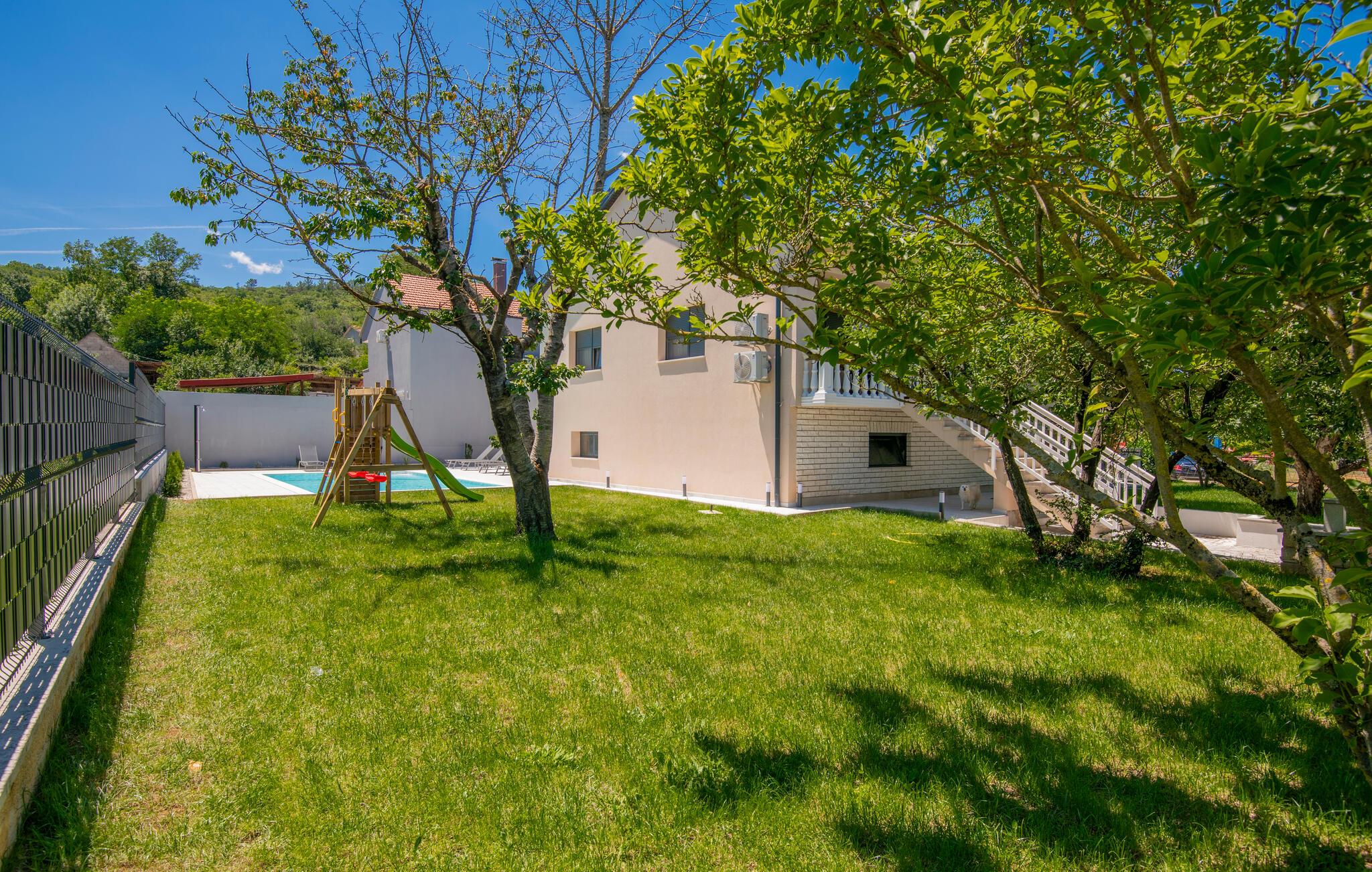 Verbringen Sie Ihren Urlaub in diesem einladenden Ferienhaus in Makarska-Kamenmost. Das Ambiente vereint modernen Komfort mit traditionellem Charme, ideal für erholsame Tage. Die geschmackvolle Einrichtung bietet Ihnen alles, was Sie brauchen, denn geräumige Schlafzimmer bis hin zum stilvollen Wohnbereich lassen Sie zur Ruhe kommen. Genießen Sie Mahlzeiten in der voll ausgestatteten Küche oder entspannen Sie auf der großzügigen Terrasse mit Blick auf den Pool. Der Außenbereich mit Pool lädt zu familiären Momenten und Erholung ein. Sehen Sie Ihren Kindern beim Toben auf dem privaten Spielplatz zu, während Sie auf der Sonnenliege faulenzen.