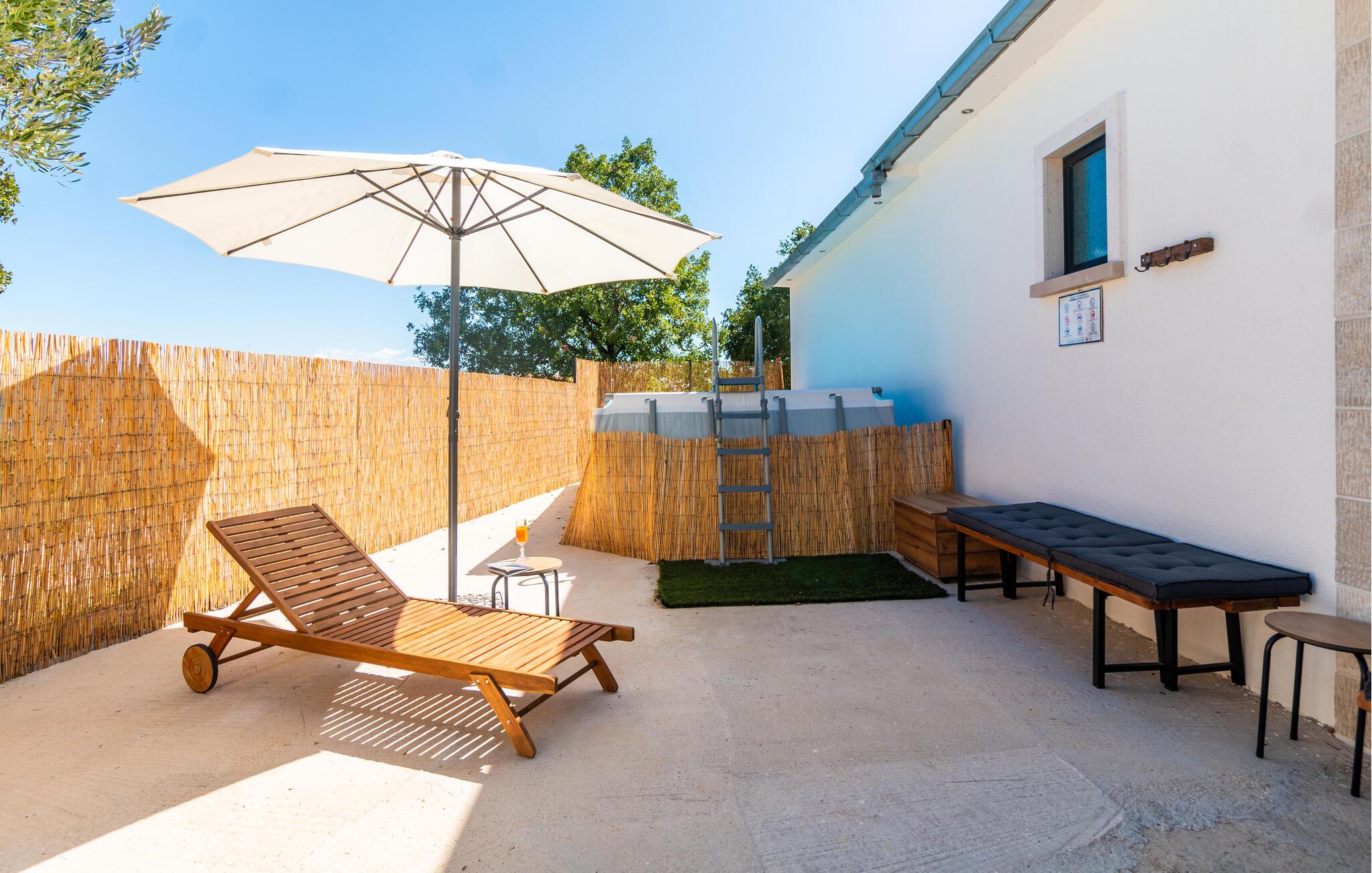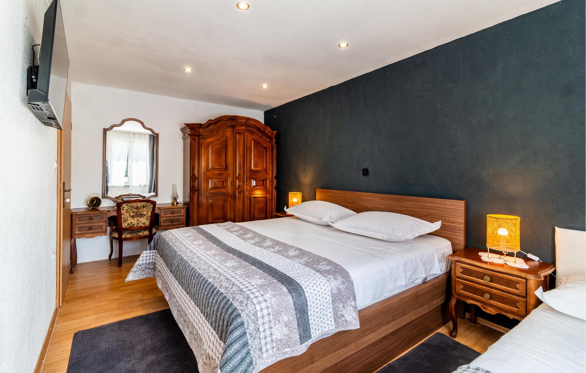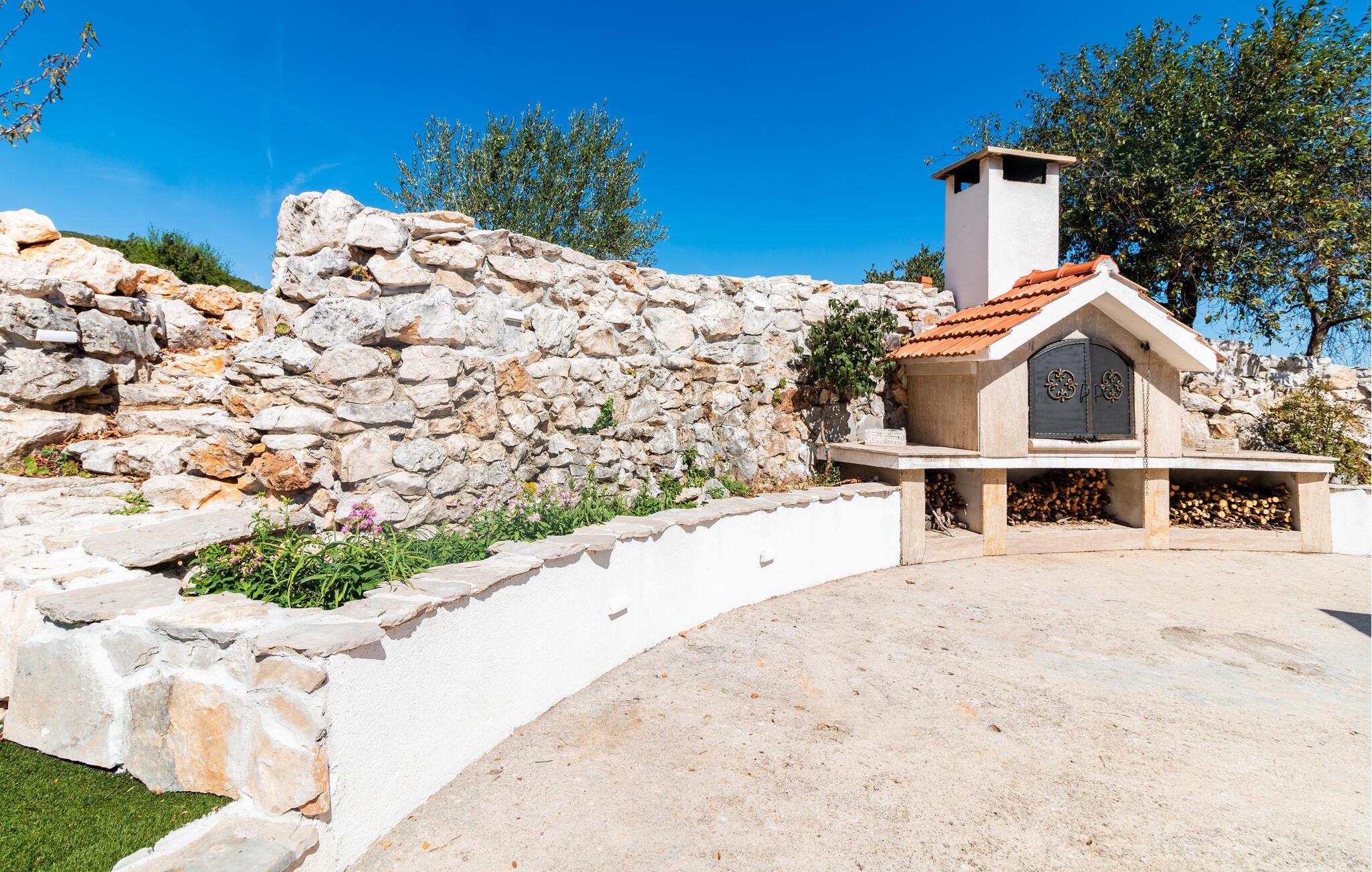 In Lokvicici empfängt Sie dieses schöne Ferienhaus, das das ideale zuhause für Sie und Ihre Familie und Ihren Vierbeiner ist. Die authentische Einrichtung mit dunklem Holz trägt zum charmanten Flair des Hauses bei uns lässt Sie darin gerne verweilen. Im Haus können Sie auf dem Stepper schwitzen oder auch Darts spielen. Im Außenbereich des Hauses können Sie entspannen, den gemauerten Ofen zum Zubereiten Ihrer Mahlzeiten nutzen und im gemütlichen Ambiente Ihre Abendessen im Kreise der Familie einnehmen. Erfrischen können Sie sich jederzeit im großen Pool, von dem Sie auch eine schöne Aussicht auf die Landschaft haben.