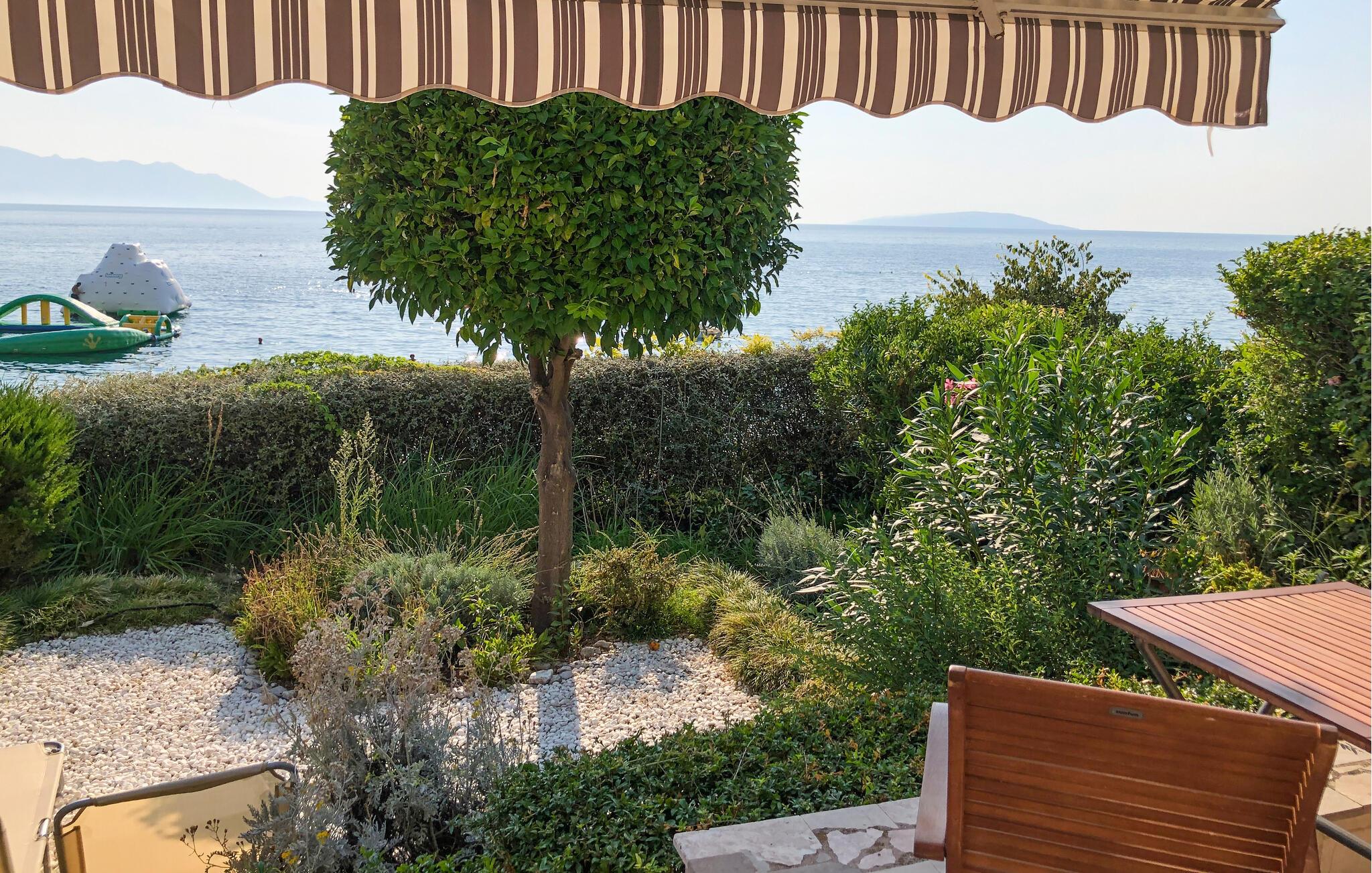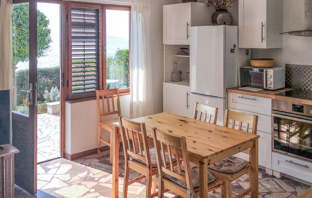 In Ihrem familienfreundlichen Ferienhaus trifft traditioneller Charme auf moderne Annehmlichkeiten. Die helle und freundliche Küche bietet den idealen Rahmen für die Zubereitung und das Genießen von Mahlzeiten. Frühstücken Sie mit der ganzen Familie am Holztisch, während das Morgenlicht durch die Fenster strömt. Der Wohnbereich besticht durch eine gemütliche Ausstattung, die zu entspannten Tagen und Abenden einlädt. Öffnen Sie die Fenster und lassen Sie die frische, salzige Meeresbrise hereinwehen. Draußen erwartet Sie eine großzügige Terrasse mit derselben attraktiven Steinoptik wie auf dem Fußboden im Wohnbereich. Genießen Sie den Blick auf die blaue Adria und den gepflegten Garten. Das sprudelnde Wasser des Whirlpools bietet die ideale Gelegenheit, einen ereignisreichen Tag voll entspannt ausklingen zu lassen.