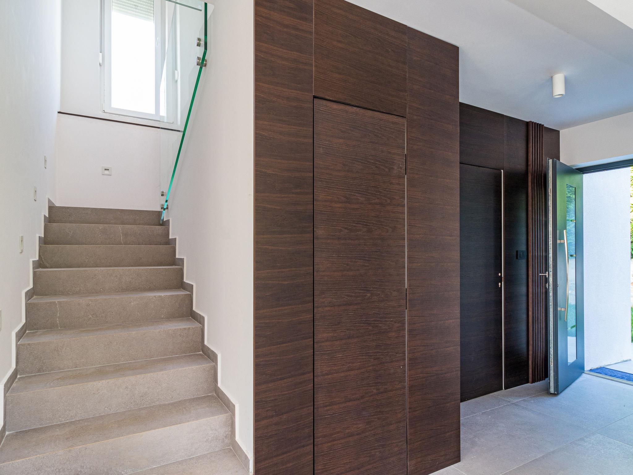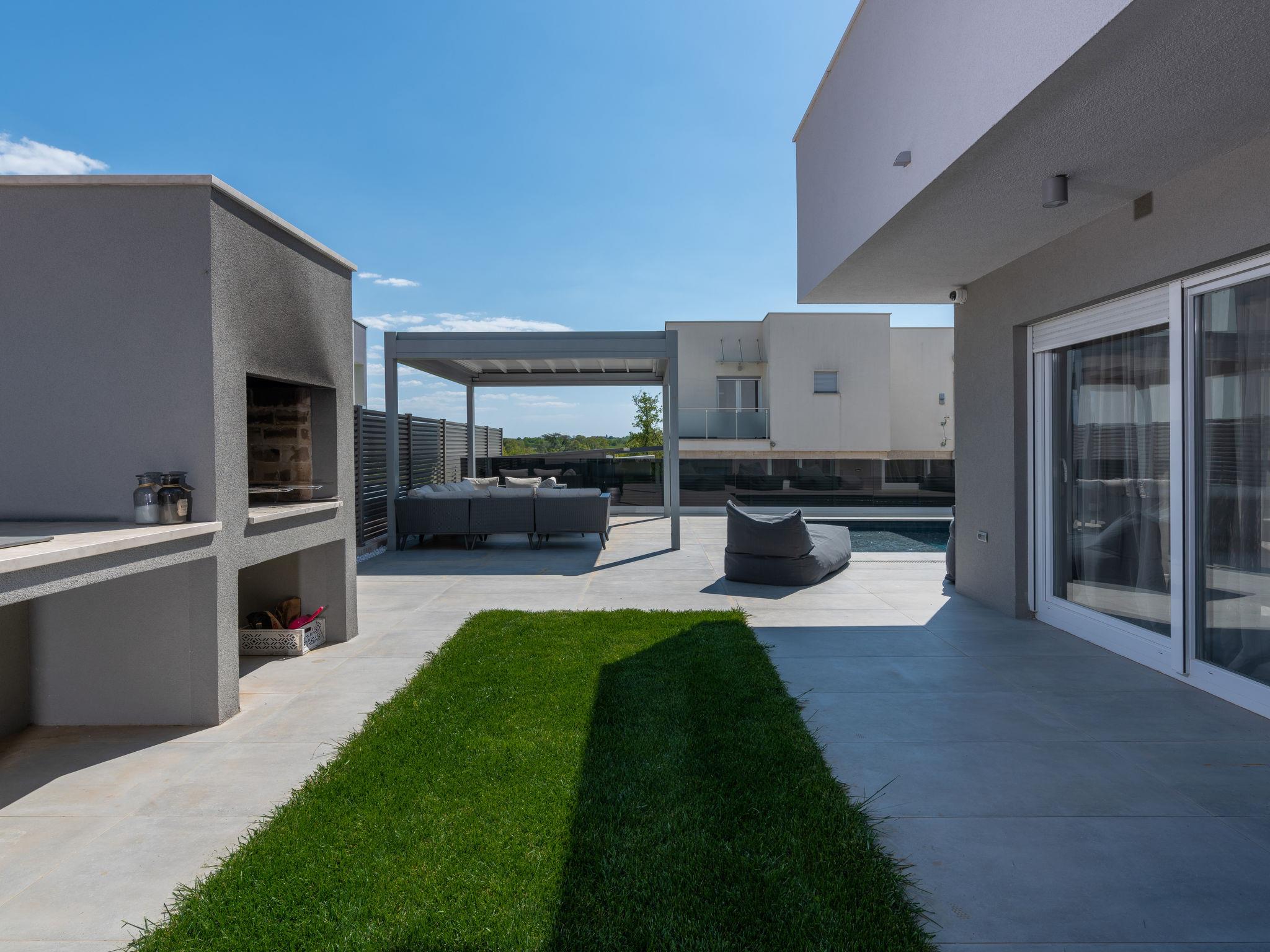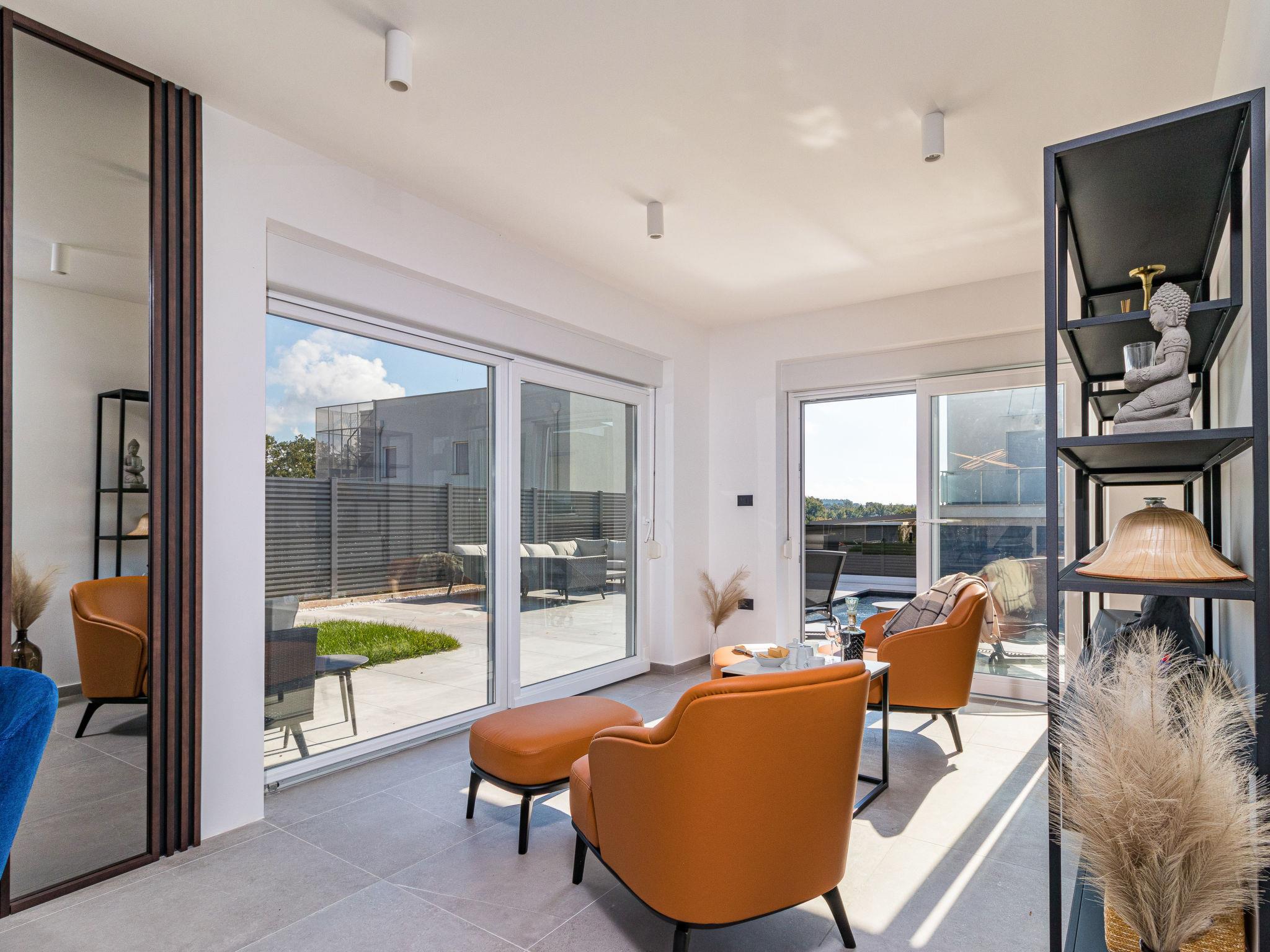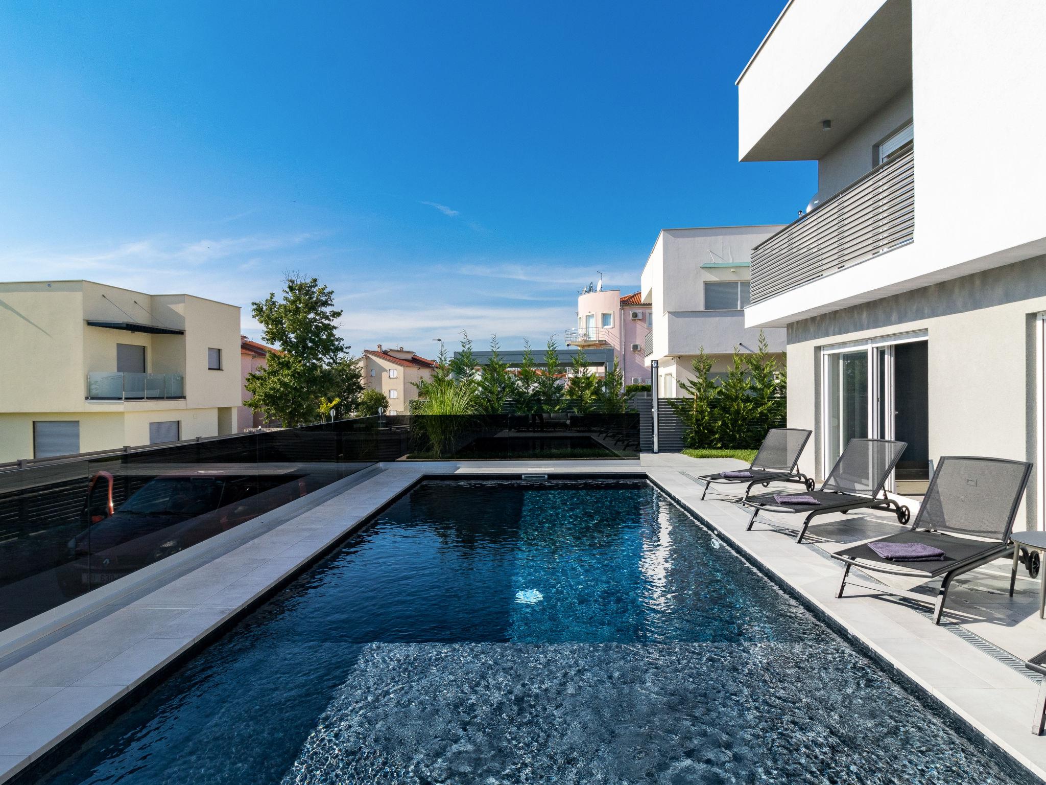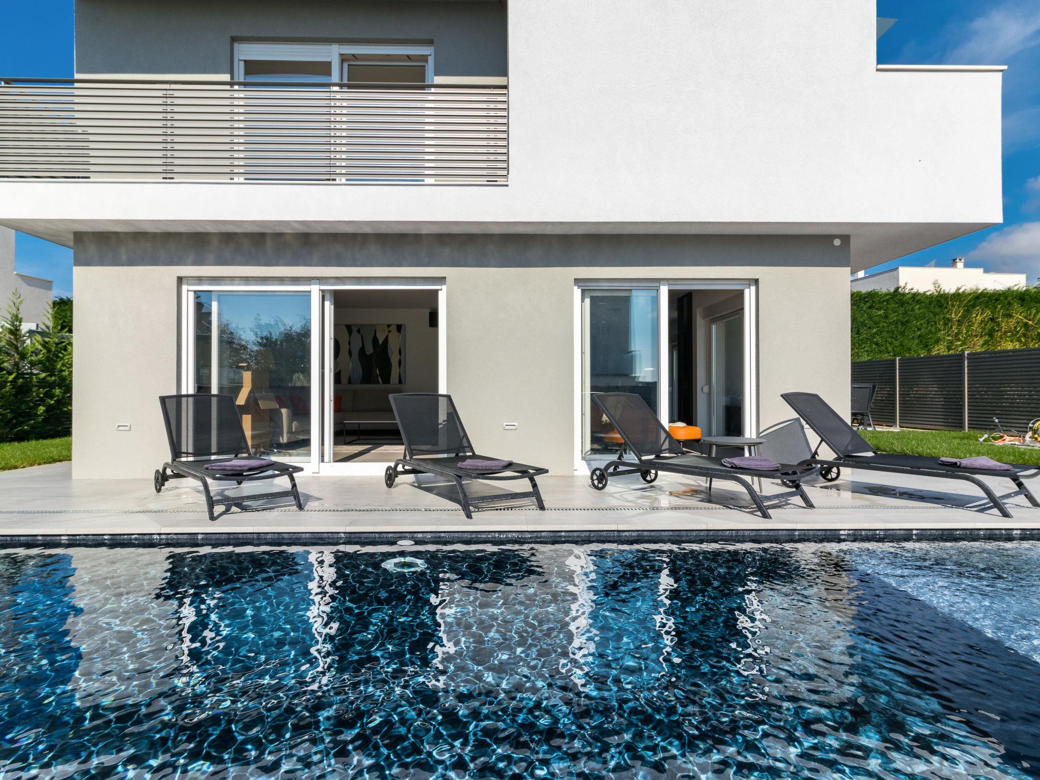 Modern, beautiful villa "Athos", 2 storeys, built in 2020. In the hamlet Karigador 4 km from the centre of Novigrad, in a quiet, sunny position, from the sea, 200 m from the beach. Private: property 550 m2 (fenced), lawn 300 m2, swimming pool angular, heated (8 x 4 m, depth 150 cm, seasonal availability: 01.Jan. - 31.Dec.) with internal staircase. Outdoor shower, arbour (16 m2), pergola (16 m2), garden furniture, barbecue. In the house: internet access, hot tub, roof terrace, burglar alarm system, washing machine. Airport transfer (extra). Parking (for 2 cars) at the house on the premises. Shop 100 m, supermarket 4 km, restaurant, café 100 m, bus stop 400 m, sandy beach, rocky beach 200 m. Children's playground 100 m. Please note: suitable for families. The owner does not accept any youth groups. Swimming pool with hydromassage. It is necessary to announce 7 days in advance if the pool heating is required. Hot tub for 5 persons, garden furniture are situated on the roof terrace (80 m2, exterior staircase).