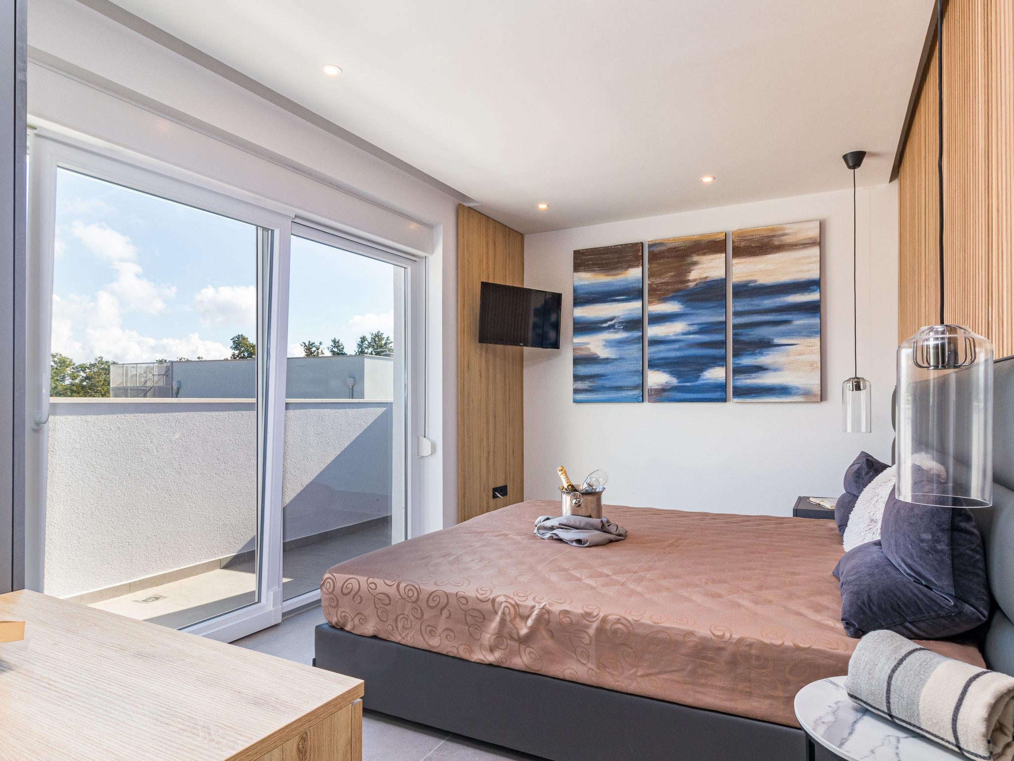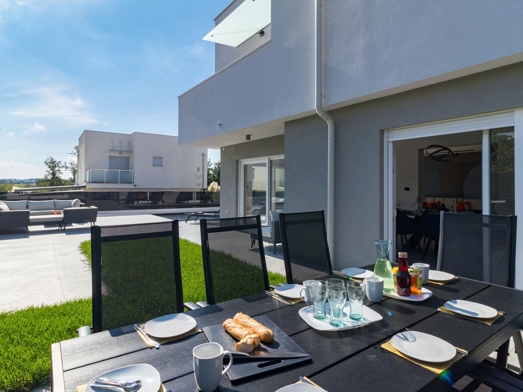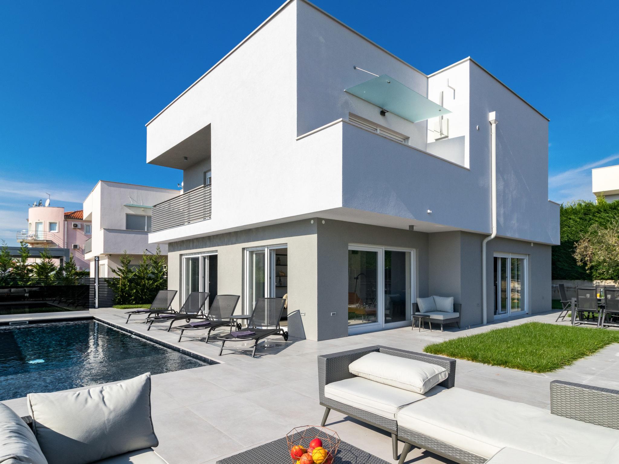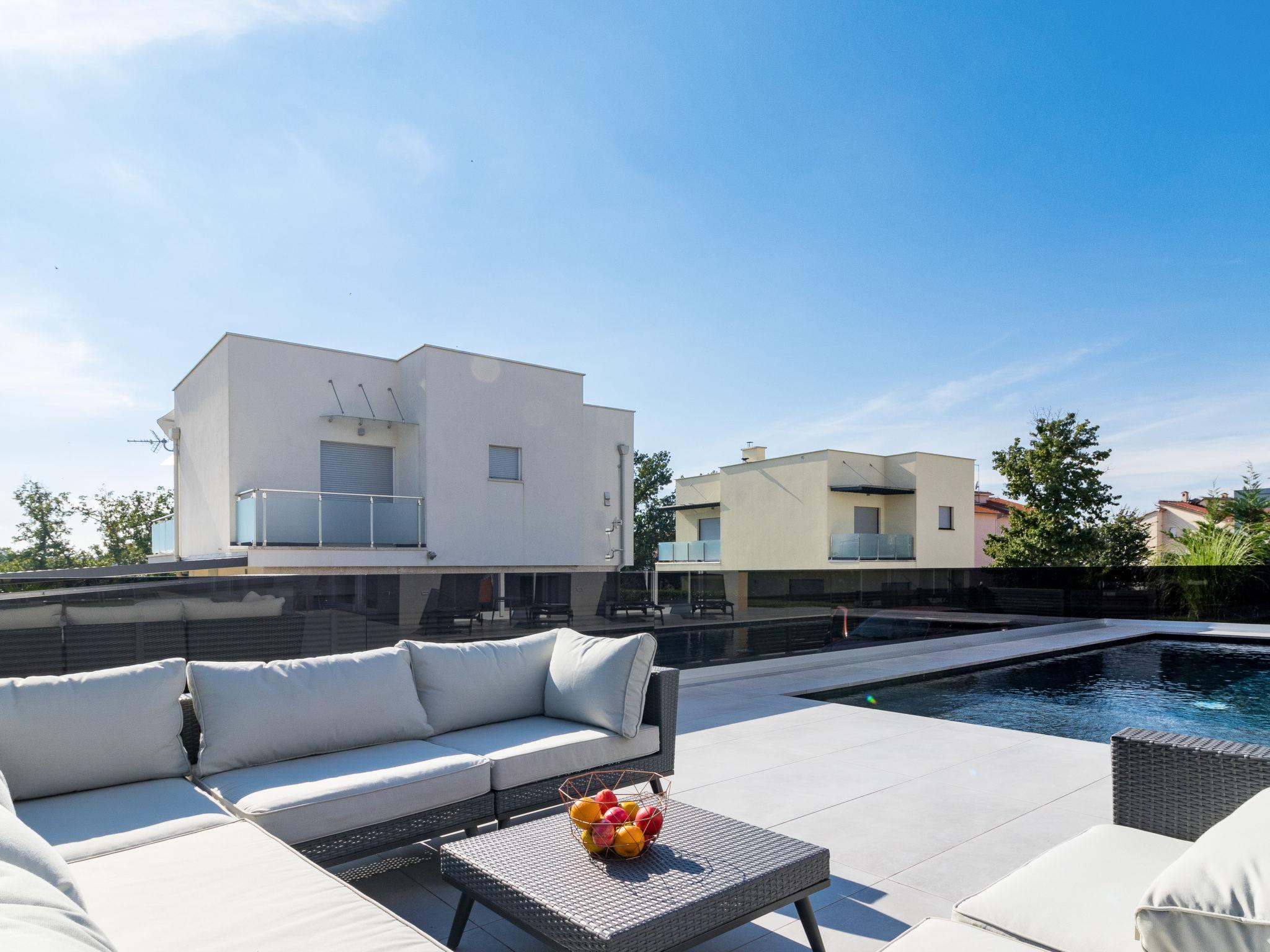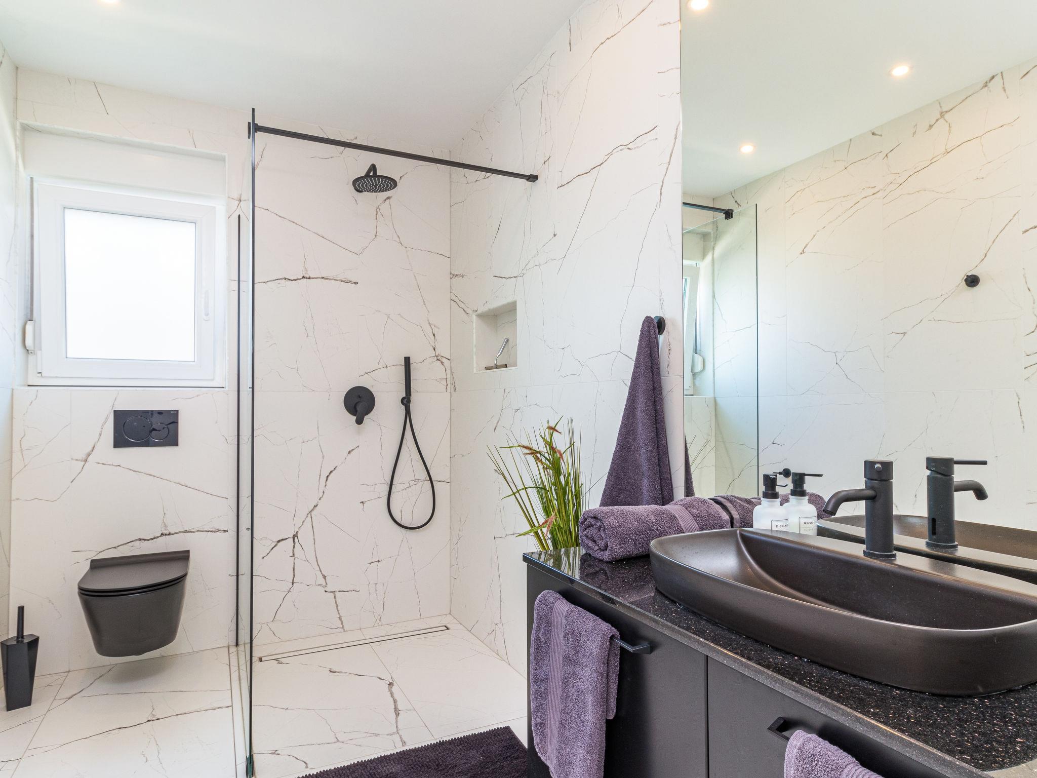 Modern, beautiful villa "Athos", 2 storeys, built in 2020. In the hamlet Karigador 4 km from the centre of Novigrad, in a quiet, sunny position, from the sea, 200 m from the beach. Private: property 550 m2 (fenced), lawn 300 m2, swimming pool angular, heated (8 x 4 m, depth 150 cm, seasonal availability: 01.Jan. - 31.Dec.) with internal staircase. Outdoor shower, arbour (16 m2), pergola (16 m2), garden furniture, barbecue. In the house: internet access, hot tub, roof terrace, burglar alarm system, washing machine. Airport transfer (extra). Parking (for 2 cars) at the house on the premises. Shop 100 m, supermarket 4 km, restaurant, café 100 m, bus stop 400 m, sandy beach, rocky beach 200 m. Children's playground 100 m. Please note: suitable for families. The owner does not accept any youth groups. Swimming pool with hydromassage. It is necessary to announce 7 days in advance if the pool heating is required. Hot tub for 5 persons, garden furniture are situated on the roof terrace (80 m2, exterior staircase).