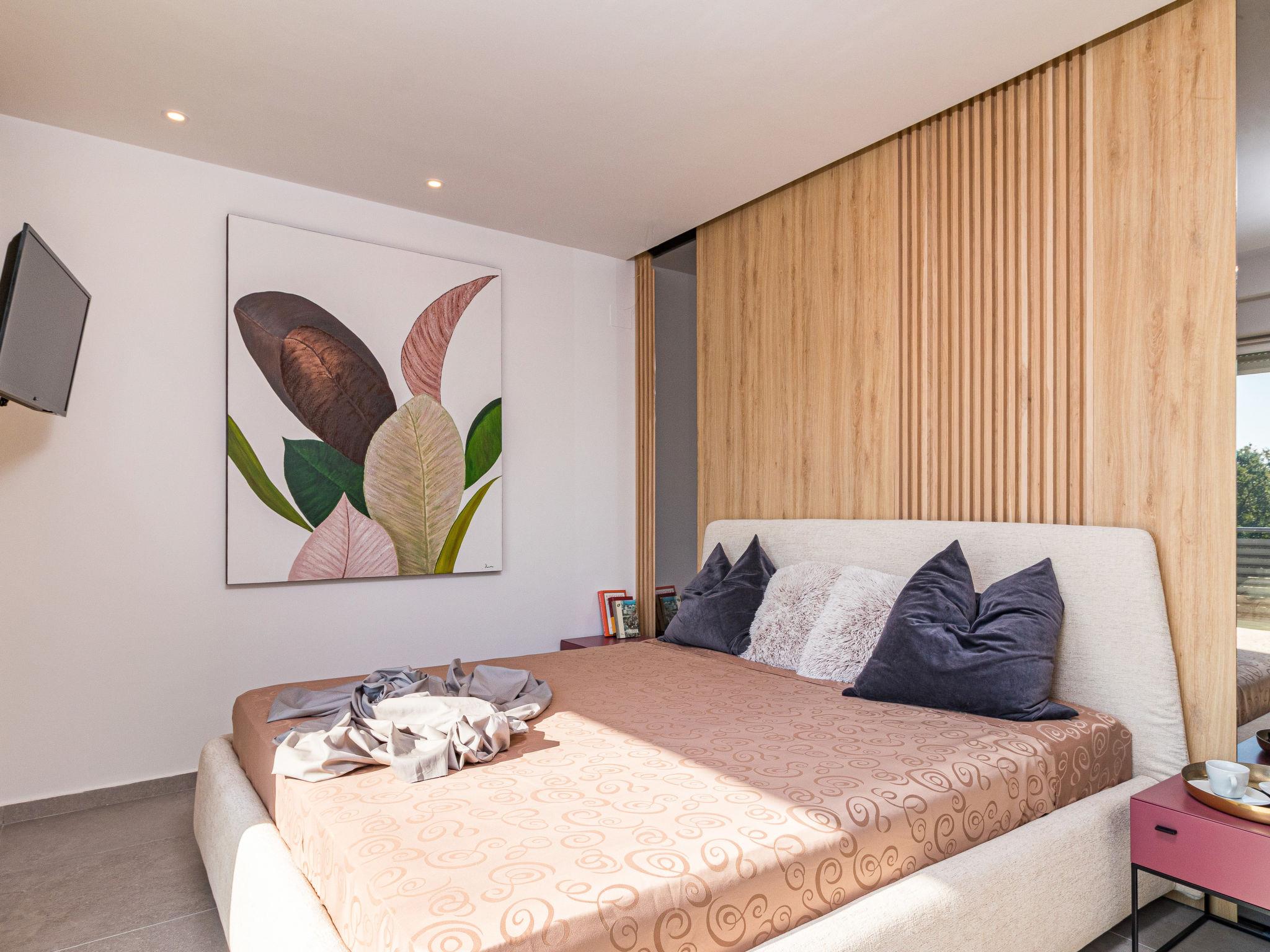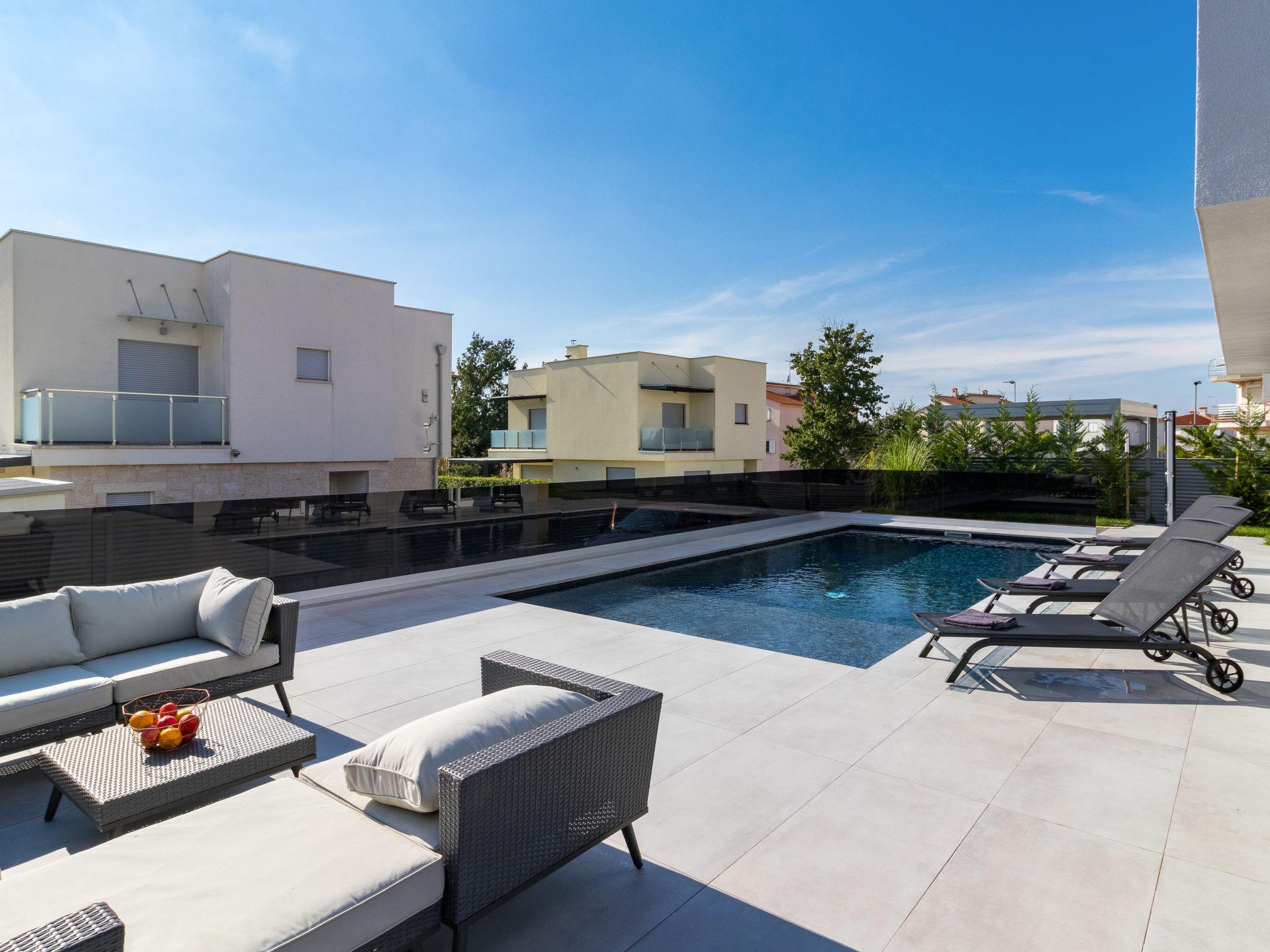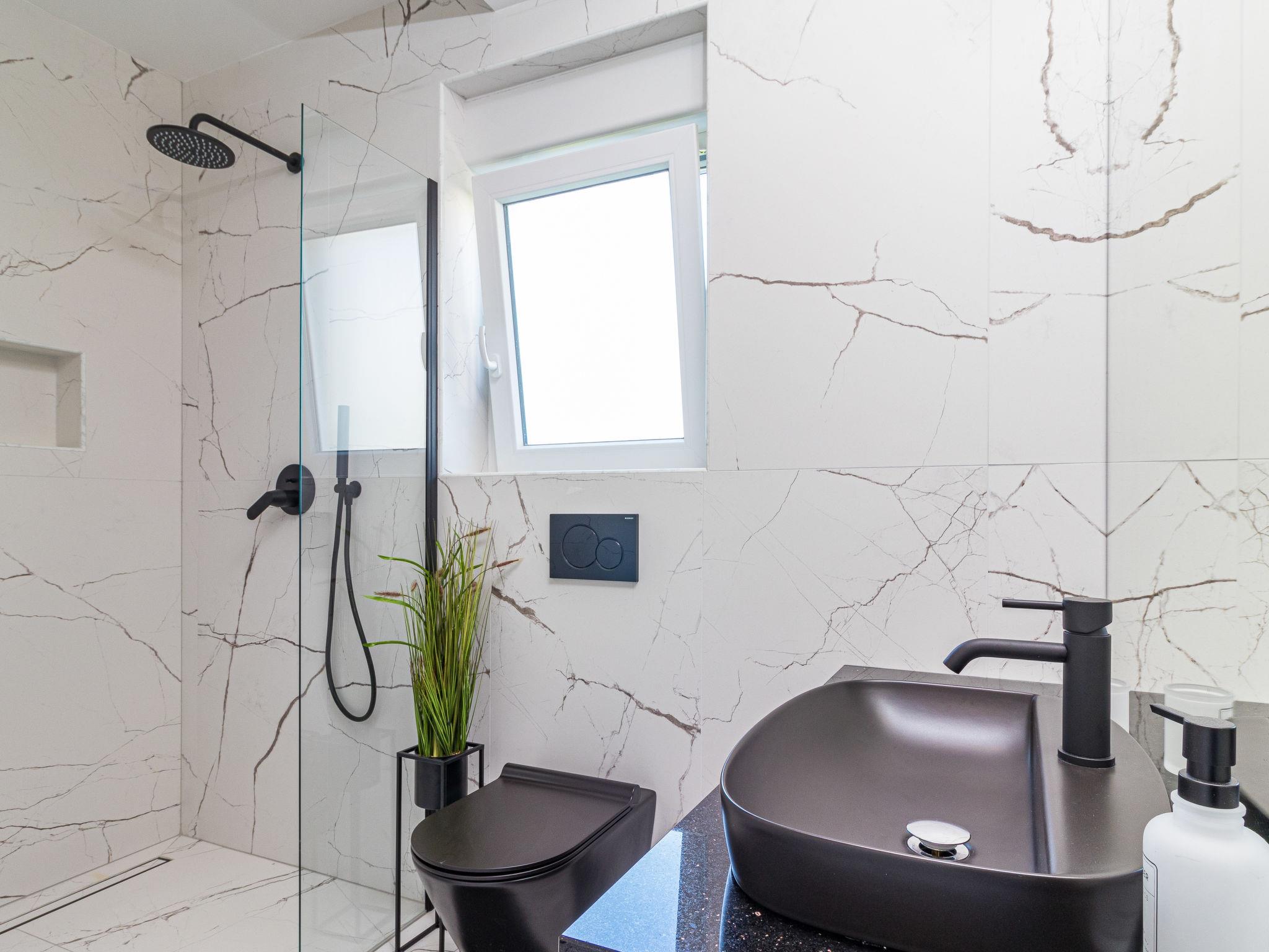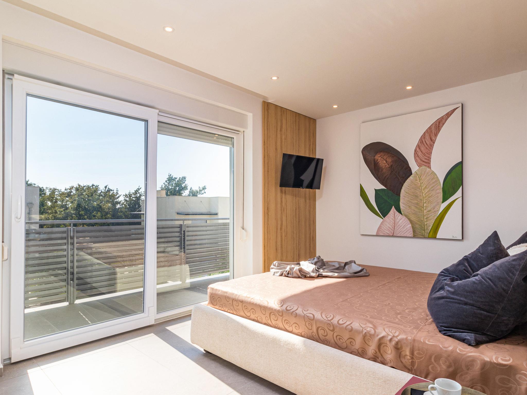 Modern, beautiful villa "Athos", 2 storeys, built in 2020. In the hamlet Karigador 4 km from the centre of Novigrad, in a quiet, sunny position, from the sea, 200 m from the beach. Private: property 550 m2 (fenced), lawn 300 m2, swimming pool angular, heated (8 x 4 m, depth 150 cm, seasonal availability: 01.Jan. - 31.Dec.) with internal staircase. Outdoor shower, arbour (16 m2), pergola (16 m2), garden furniture, barbecue. In the house: internet access, hot tub, roof terrace, burglar alarm system, washing machine. Airport transfer (extra). Parking (for 2 cars) at the house on the premises. Shop 100 m, supermarket 4 km, restaurant, café 100 m, bus stop 400 m, sandy beach, rocky beach 200 m. Children's playground 100 m. Please note: suitable for families. The owner does not accept any youth groups. Swimming pool with hydromassage. It is necessary to announce 7 days in advance if the pool heating is required. Hot tub for 5 persons, garden furniture are situated on the roof terrace (80 m2, exterior staircase).