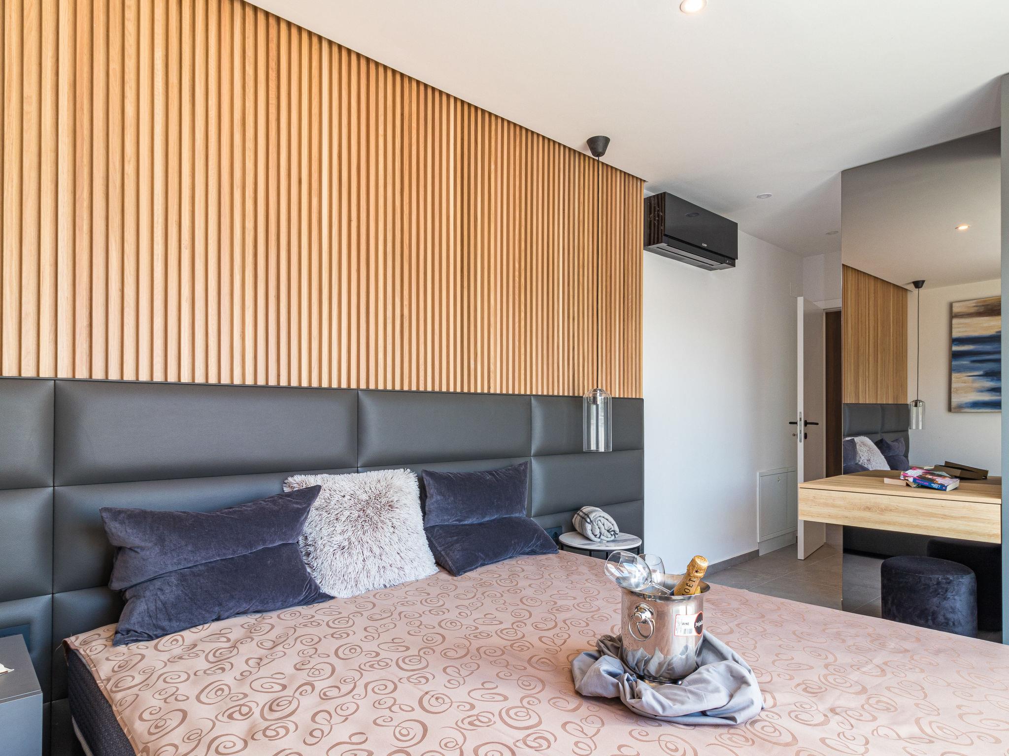 4-room villa 160 m2 on 2 levels, south-west facing position. Beautiful and tasteful furnishings: living/dining room 80 m2 with cable TV and international TV channels (flat screen), air conditioning. Exit to the terrace, to the swimming pool. Open kitchen (oven, dishwasher, 4 induction hot plates, toaster, kettle, microwave, freezer, electric coffee machine, cooking island). Sep. WC. Upper floor: 2 rooms 15 m2, each room with 1 french bed (180 cm, length 200 cm), shower/WC and TV (flat screen), air conditioning. Exit to the balcony. 1 room 15 m2 with 1 french bed (140 cm, length 190 cm), shower/WC and air conditioning. Exit to the balcony. Floor heating, forced-air heating. 3 balconies 6 m2, terrace 16 m2 partly roofed. Terrace furniture, deck chairs, box-room. Beautiful view of the sea and the countryside. Facilities: safe, iron, children's high chair, baby cot. Internet (WiFi, free). Please note: non-smoking house. Fire extinguisher. Available: playstation (included).