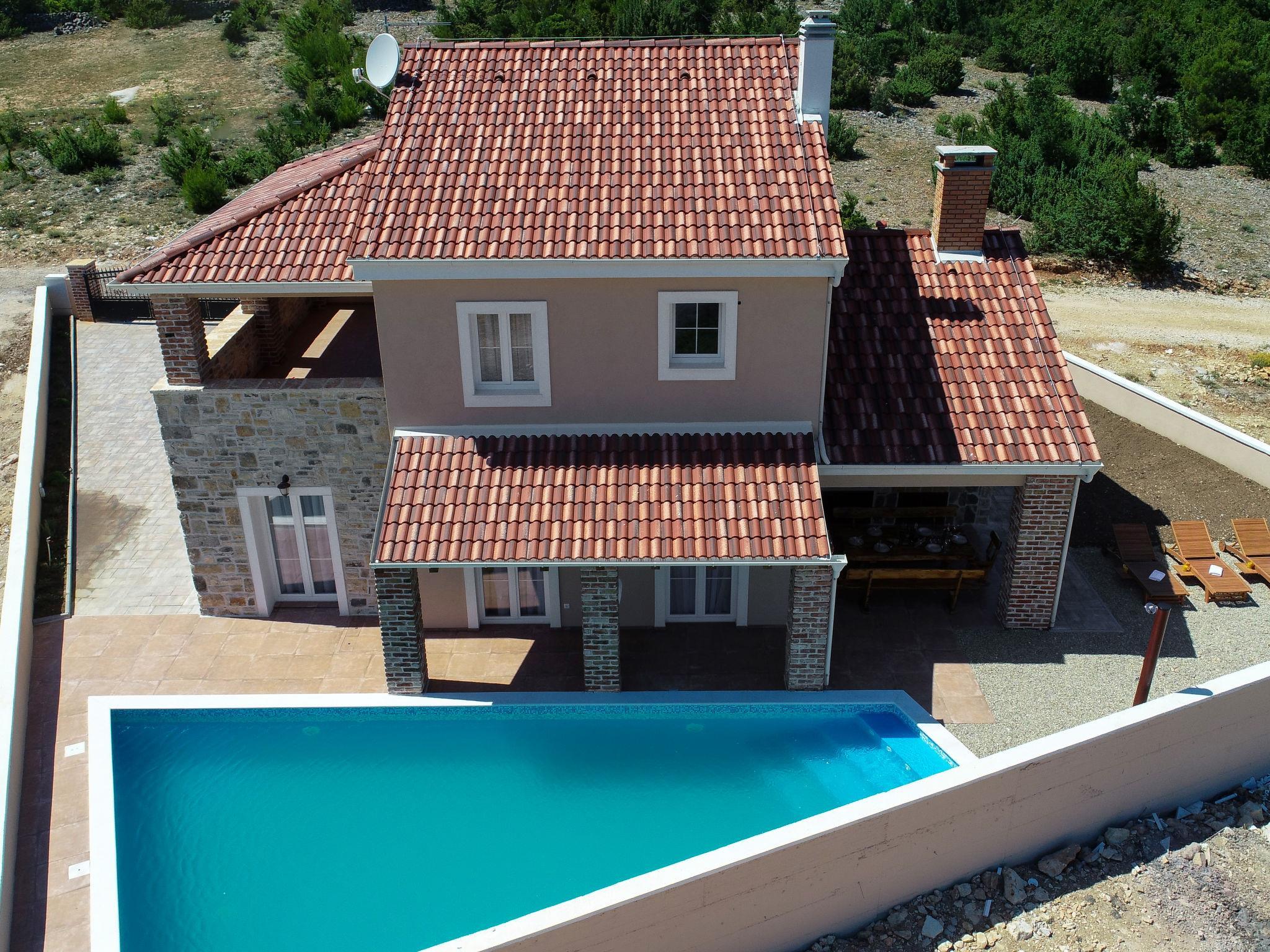 Pridraga 9 km from Novigrad: Single-family house "Imperia", 2 storeys, built in 2019. 2 km from the centre of Pridraga, in a quiet, sunny, elevated position, 800 m from the sea, 800 m from the beach. Private: property 500 m2 (fenced), swimming pool heated (44 m2, depth 140 cm, seasonal availability: 01.Jan. - 31.Dec.) with internal staircase. Unconventional pool shape. Outdoor shower, garden furniture, barbecue. In the house: internet access, washing machine, tumble dryer. Motor access to the house (20 m via unmade road). Parking (for 3 cars) at the house on the premises. Shop 2 km, restaurant 9 km, bus stop 15.8 km, pebble beach, concrete beach 800 m. By groups of young people double deposit is requested on arrival. Swimming pool heated (extra).