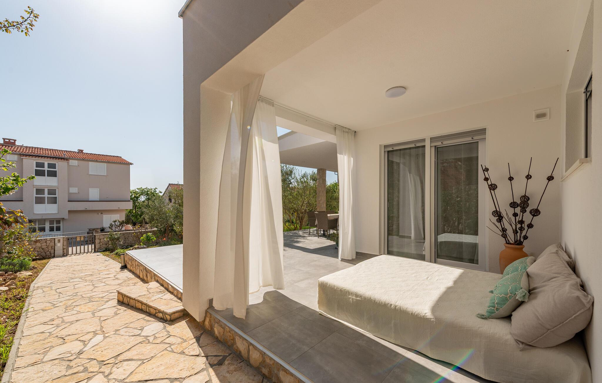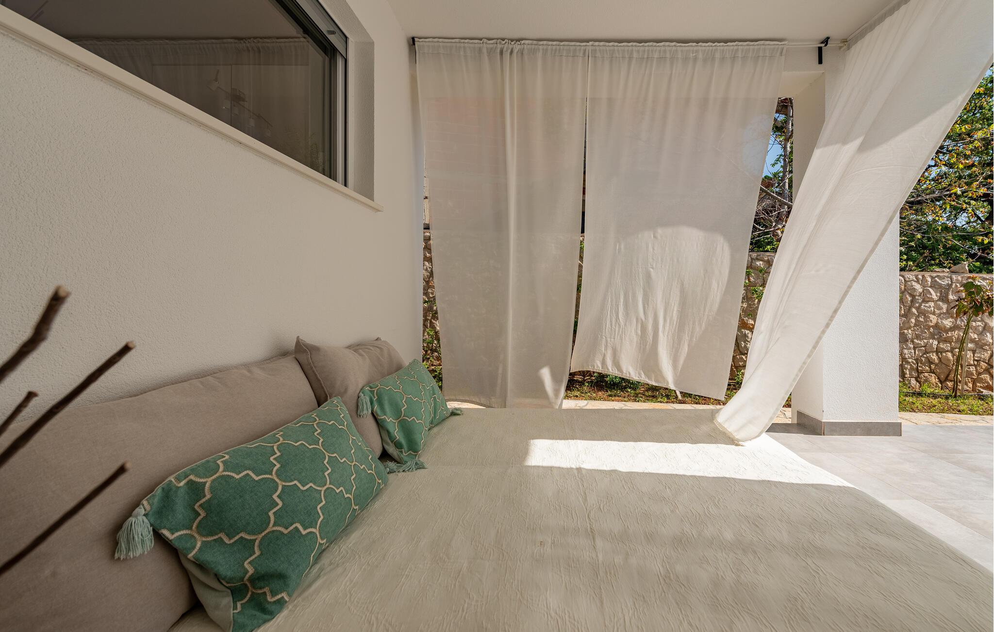 Draußen entfaltet sich ein wunderschönes mediterranes Flair. Suchen Sie im Garten den Schatten unter den Olivenbäumen und wechseln Sie auf der Terrasse zwischen sonnigen und überdachten Plätzen. Legen Sie sich auf eine Sonnenliege für ein ruhiges Nickerchen oder ein Sonnenbad und genießen Sie ein langes Abendessen unter freiem Himmel. Lounge-Ecken verteilen sich rund ums Haus und bieten Ihnen zahlreiche Möglichkeiten, um sich zurückzuziehen. Hier können Sie Ihren Urlaub mit Freunden, Familie oder zu zweit in aller Ruhe genießen.