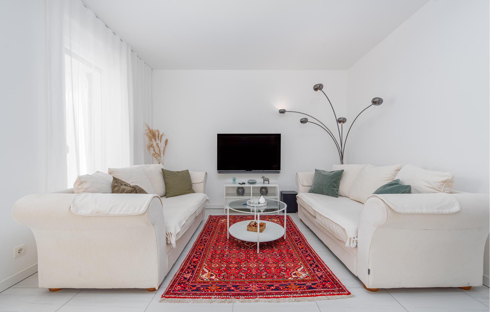 Dieses Ferienhaus lädt mit mehreren Sofas zu langen Filmabenden, lockeren Gesprächen oder entspannten Stunden nach einem aktiven Tag ein. Die moderne Küche liegt offen im Essbereich und wird schnell zum Treffpunkt für gemeinsames Kochen, Brettspiele, Pläne schmieden oder zum Genießen dessen, was der Tag gebracht hat.