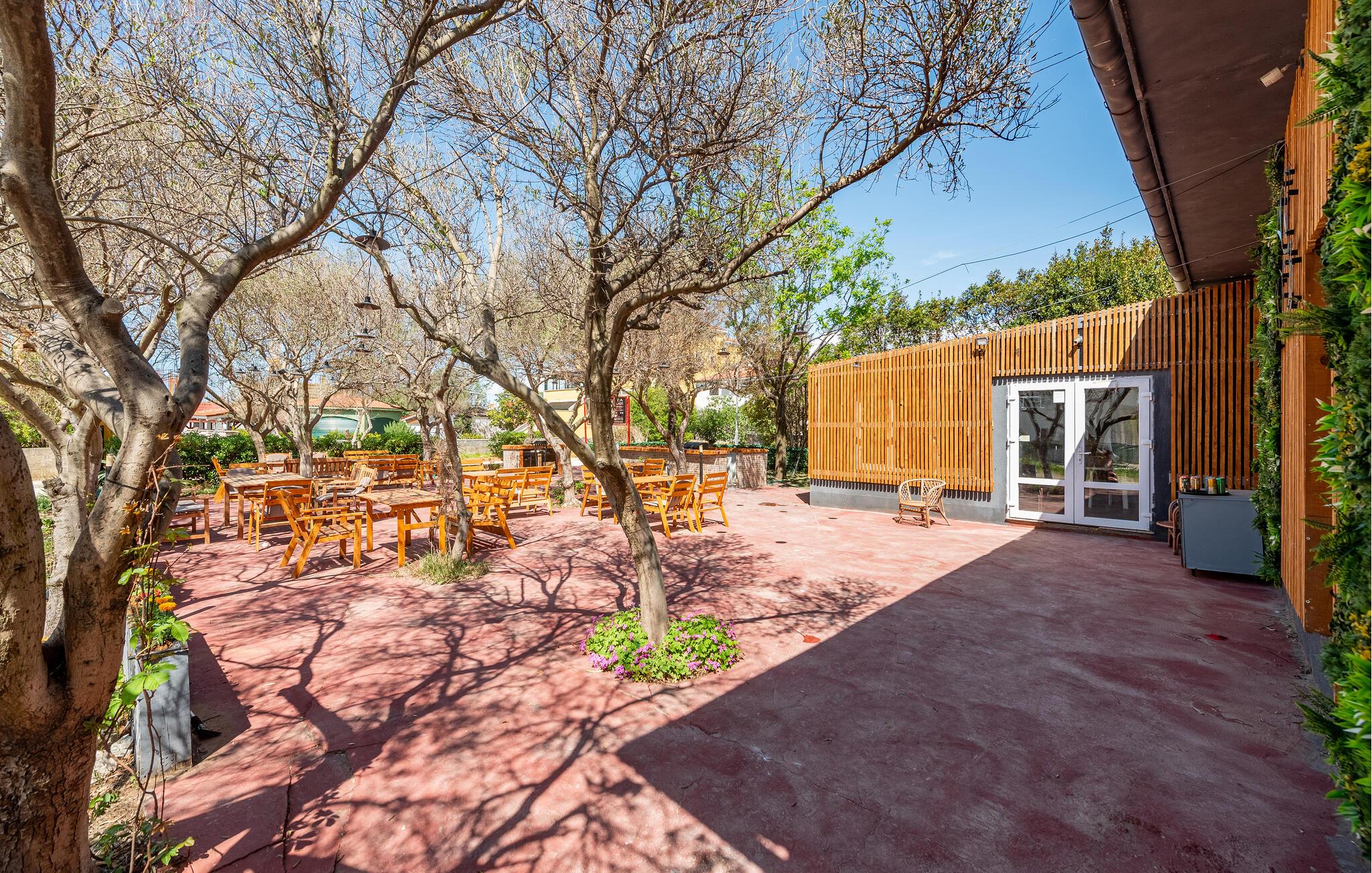 Der Außenbereich ist durchdacht gestaltet. Unter schattenspendenden Bäumen laden zahlreiche Sitzgelegenheiten zum Verweilen ein. Lassen Sie den Tag bei einem Getränk oder einer Mahlzeit im hauseigenen Restaurant ausklingen, ideal für kulinarische Ausflüge ohne weite Wege.