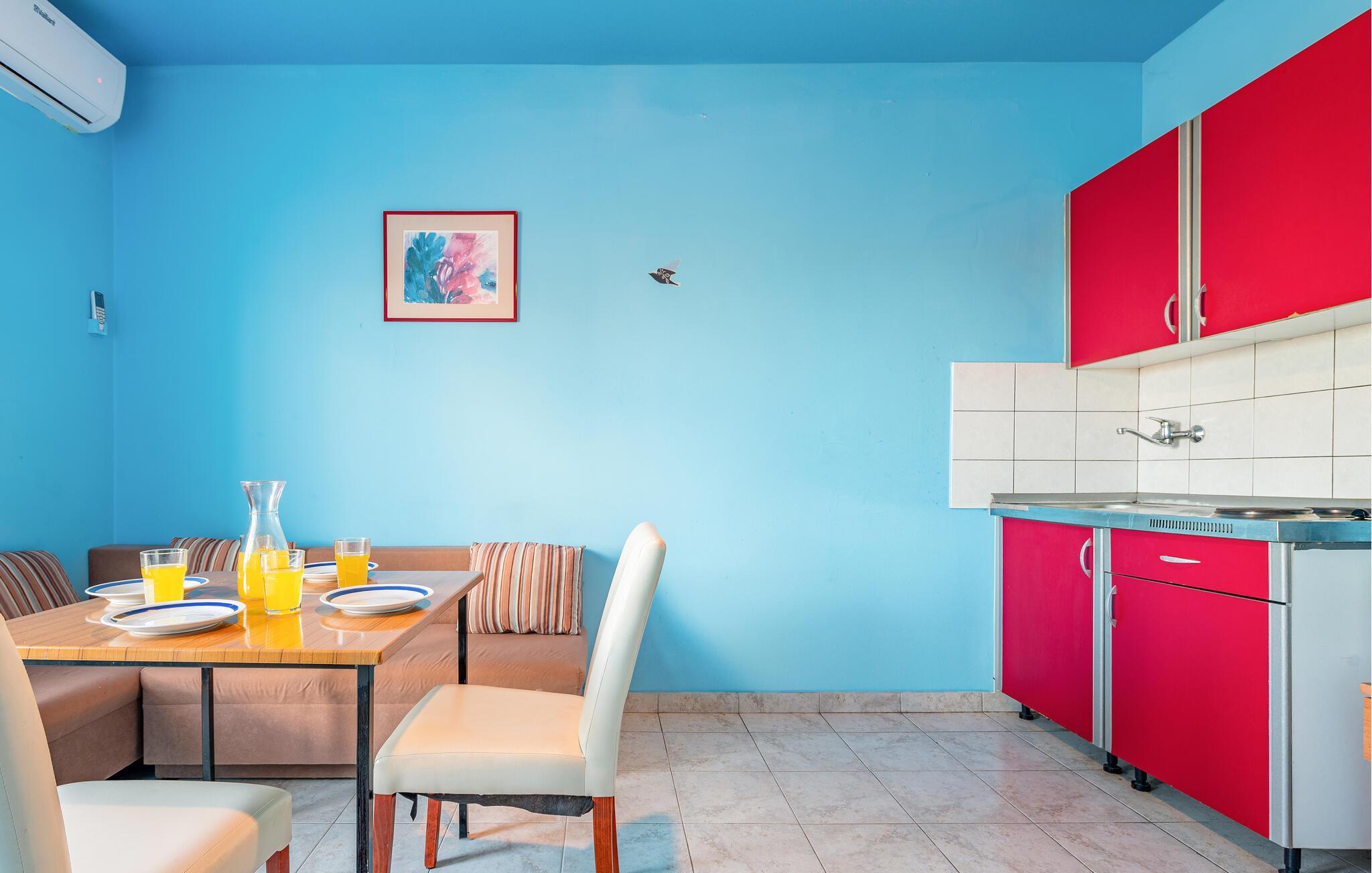 Nur wenige Schritte vom nächsten Sandstrand entfernt, erwartet Sie diese praktische Unterkunft zu einem unkomplizierten Badeurlaub mit gutem Essen und naturnaher Umgebung. Die helle Ferienwohnung ist kompakt, funktional und bietet Ihnen alles, was Sie für entspannte Urlaubstage benötigen. Bereiten Sie in der kleinen Küchenzeile leichte Mahlzeiten und Snacks für Ihre Ausflüge zu. Entspannen Sie anschließend auf dem Sofa und lassen Sie die Seele baumeln.