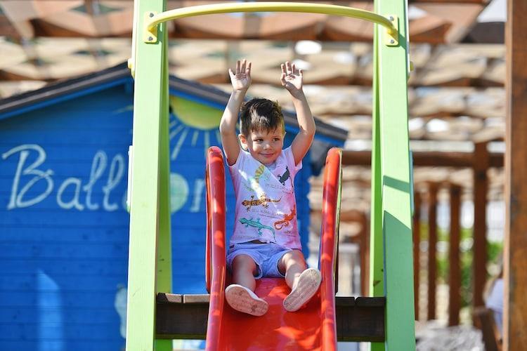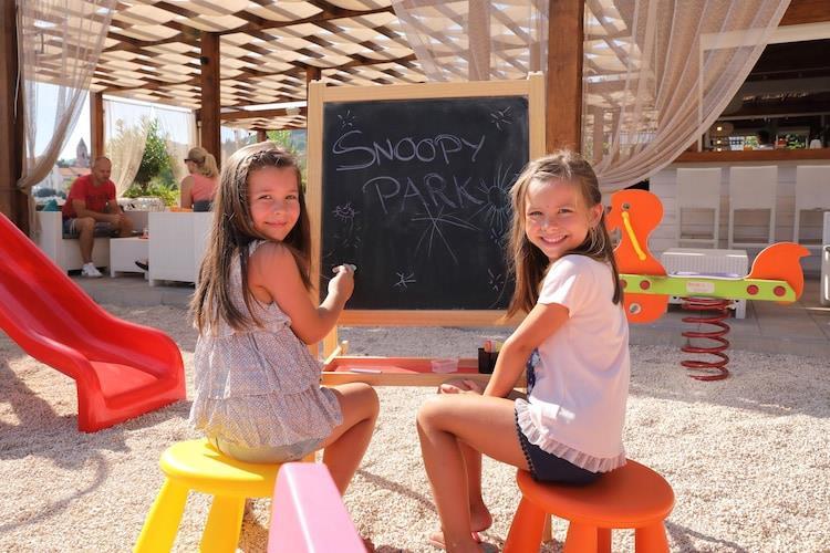 On the 1st floor: (Kitchenette(dining table, hob(2 ring stoves, ceramic), electric kettle, coffee machine, microwave, dishwasher, fridge), Living/diningroom(double sofa bed, TV(flatscreen, satellite), seating area), bedroom(double bed), bathroom(shower, toilet, hairdryer)) Restaurant, Play area, bar, receptions, balcony, air conditioning, garden furniture, sun loungers, parking, parasol, swimming pool(shared with other guests, heated), play equipment, awning, baby crib(free)