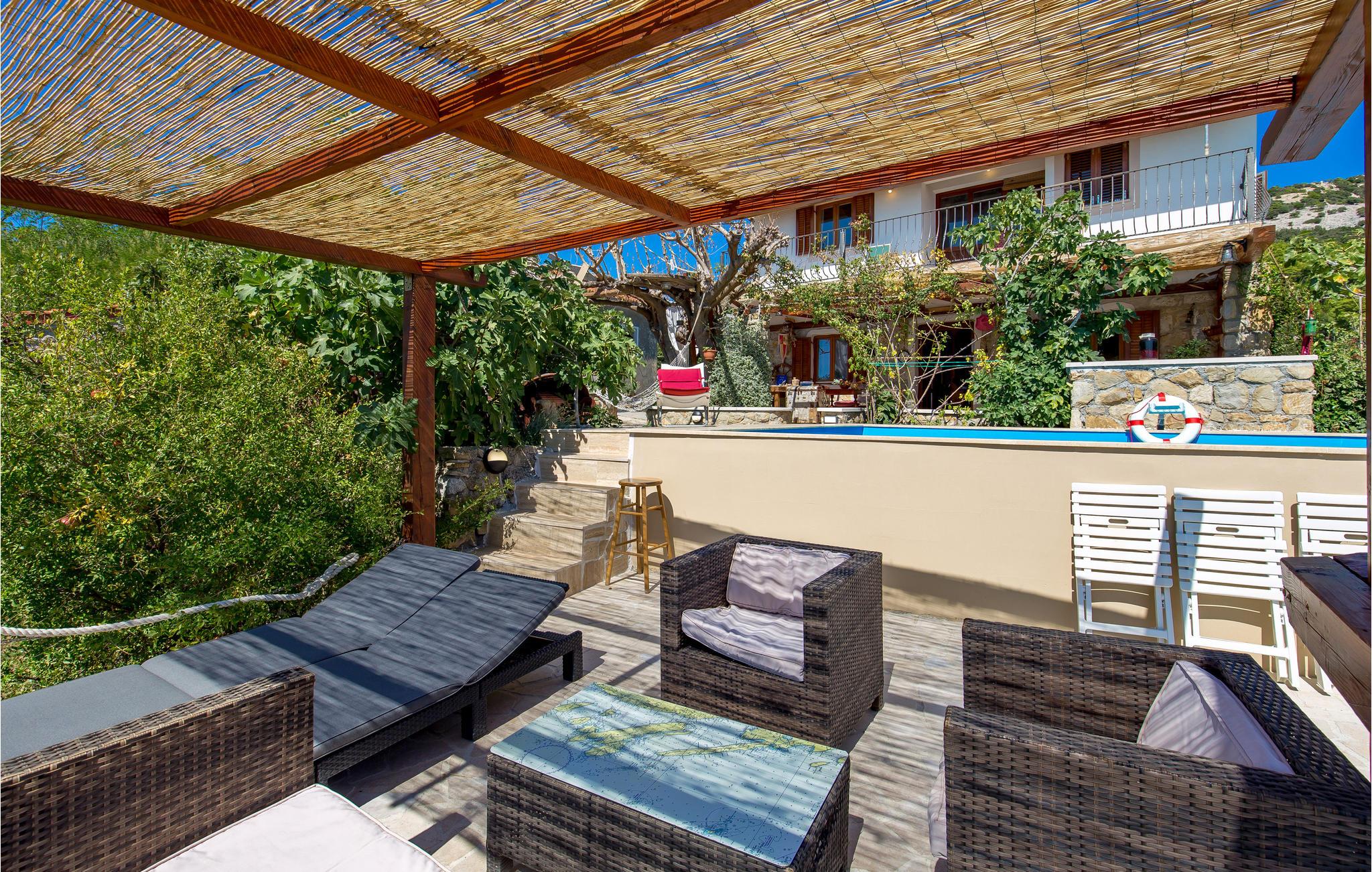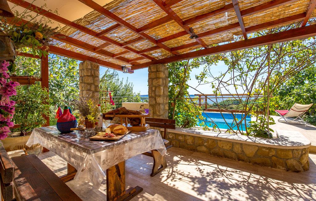 In diesem zweistöckigen Steinhaus finden Sie Ruhe und eine ländliche Atmosphäre fernab vom Alltagsstress. Mit einem privaten, gemütlichen Garten und den drei Schlafzimmern bietet Ihnen dieses Haus viel Platz. In der kombinierten Küche und Esszimmer können Sie neben rustikalen Steinwänden und dem offenen Kamin gemeinsam essen. Am Esstisch auf der Terrasse können Sie ebenso gemeinsam essen und den Blick auf das Meer und die Insel genießen. Im Garten können Sie sich in die Hängematte legen, in den privaten Pool springen, grillen oder sich am Ende des Tages auf die teilweise überdachte Terrasse setzen und ein Glas Wein und den Meerblick genießen.