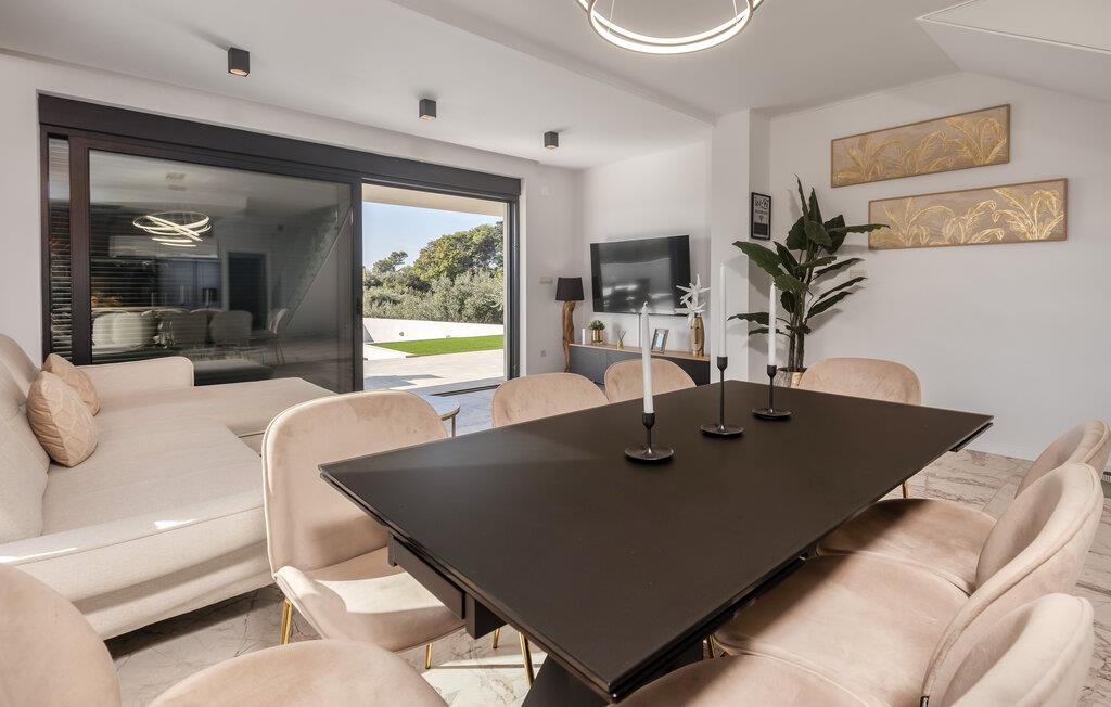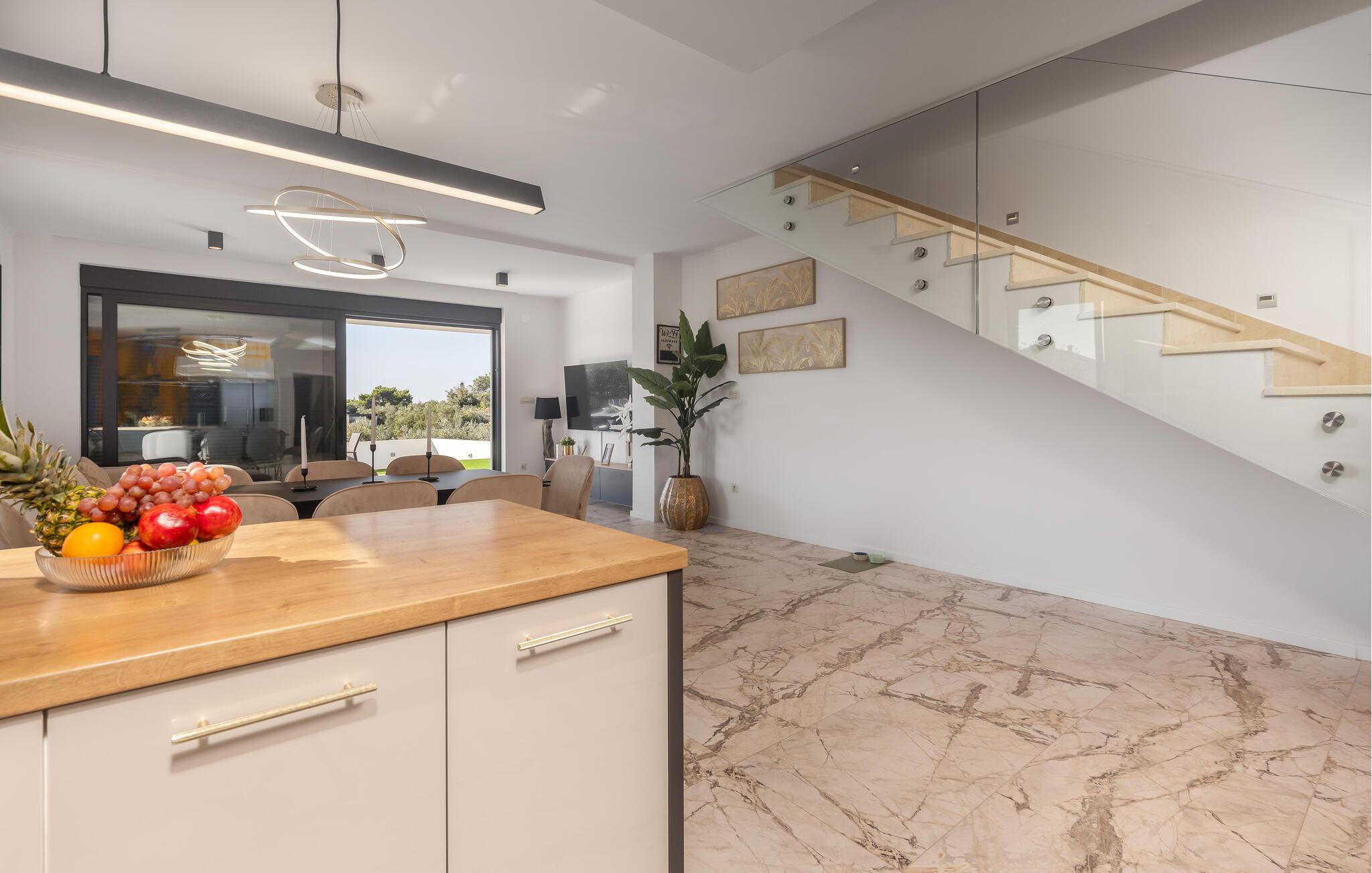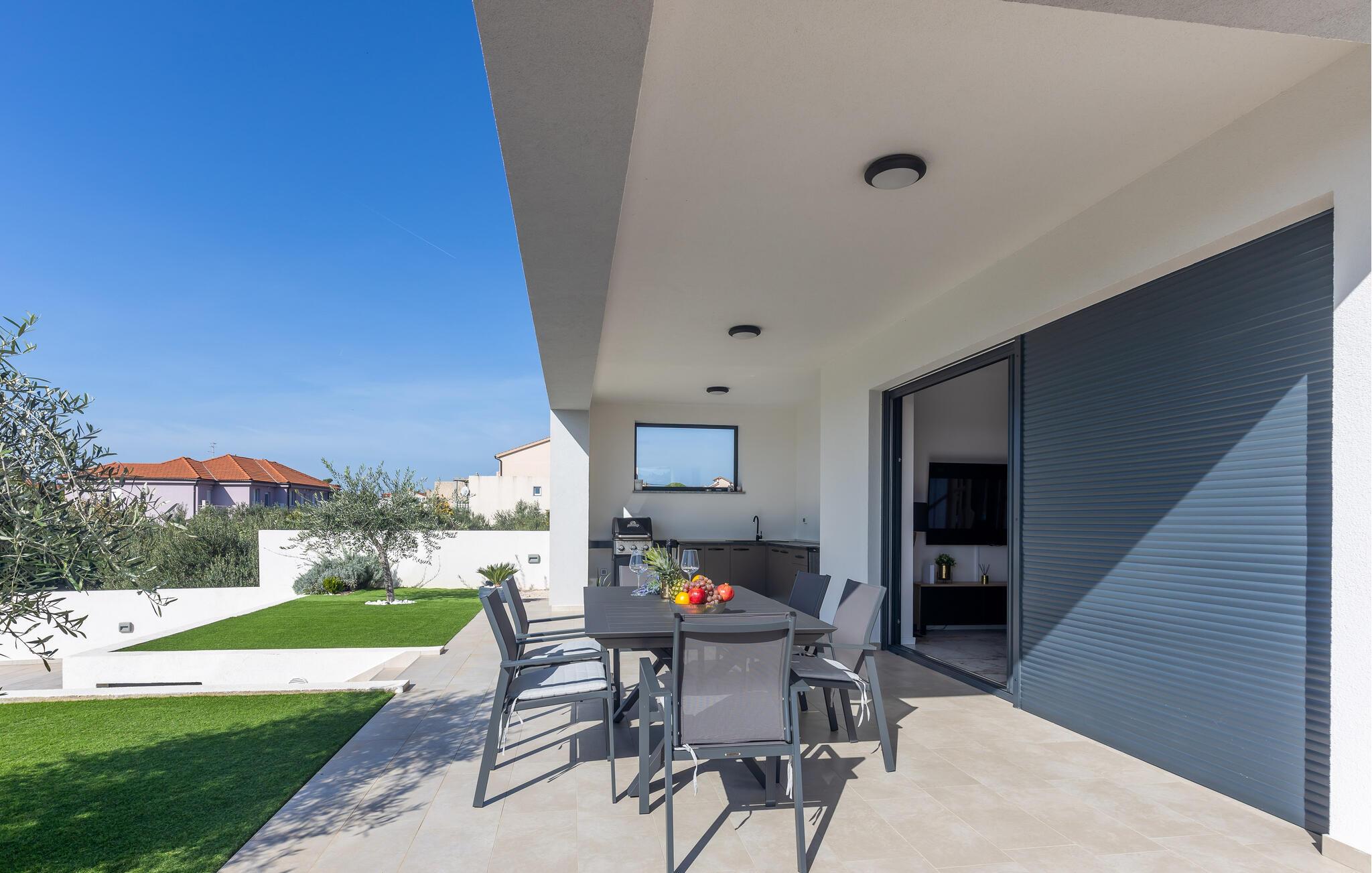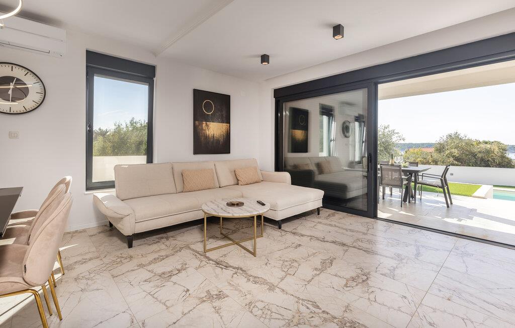 Dieses moderne Ferienhaus in Banjol bietet Ihnen und Ihrer Familie oder Freunden auf zwei Etagen ein stilvolles Ambiente und herrlichen Blick auf das Meer. Die hochwertigen, individuell eingerichteten Schlafzimmer sorgen für Komfort und Entspannung, während der offene Wohnbereich Raum zum gemeinsamen Kochen, Essen und Relaxen bietet. Die Sommerküche im Freien lädt Sie zu geselligen Abenden ein, und der beheizte Außenpool sorgt für Erfrischung und Entspannung. Umgeben von einem gepflegten, umzäunten Garten mit hochwertigen Gartenmöbeln können Sie hier die Sonne genießen.
