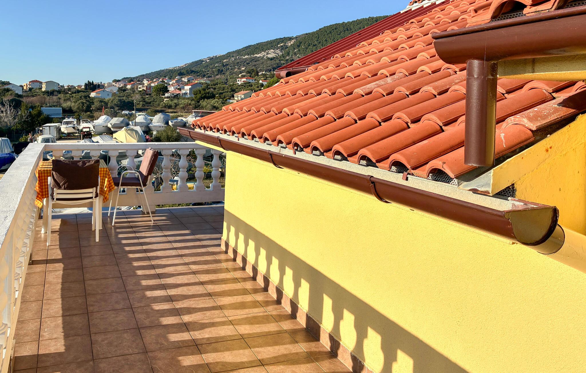Treten Sie morgens auf die schöne Terrasse und genießen Sie den Panoramablick aufs Meer und die sanft hügelige Landschaft. Frühstücken Sie in aller Ruhe umgeben von der mediterranen Stimmung, lassen Sie die Seele baumeln oder vertiefen Sie sich in ein gutes Buch.