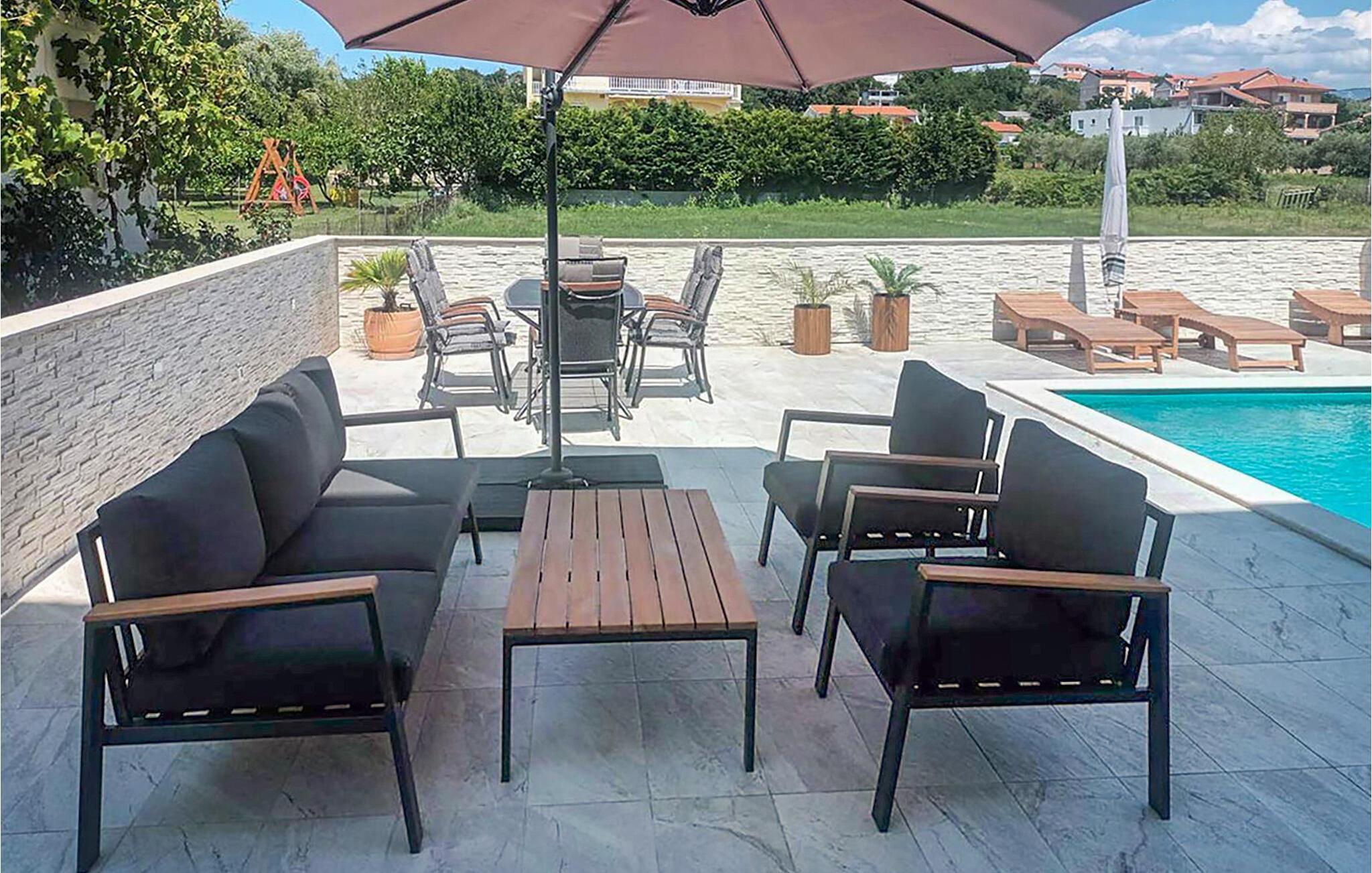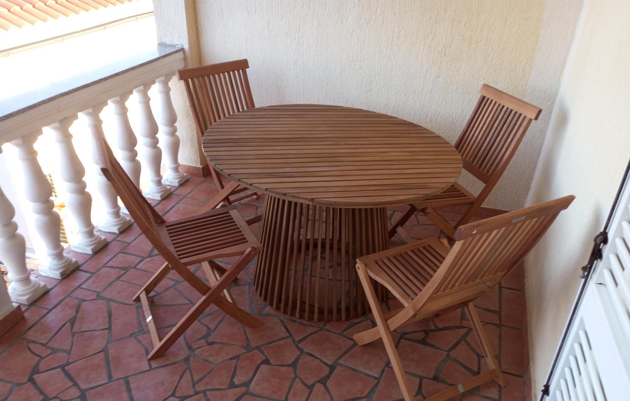 Nutzen Sie Ihre Terrasse, um das mediterrane Ambiente zu jeder Tageszeit zu genießen. Freuen Sie sich auf laue Sommernächte bei Kerzenschein und Wein. Entspannen Sie sich auf einer der hübschen Holzliegen und machen Sie ein Nickerchen im Schatten der Sonnenschirme. Erfrischen Sie sich am gemeinschaftlich genutzten Pool oder knüpfen Sie bei geselligen Grillabenden nette Kontakte mit anderen Gästen.