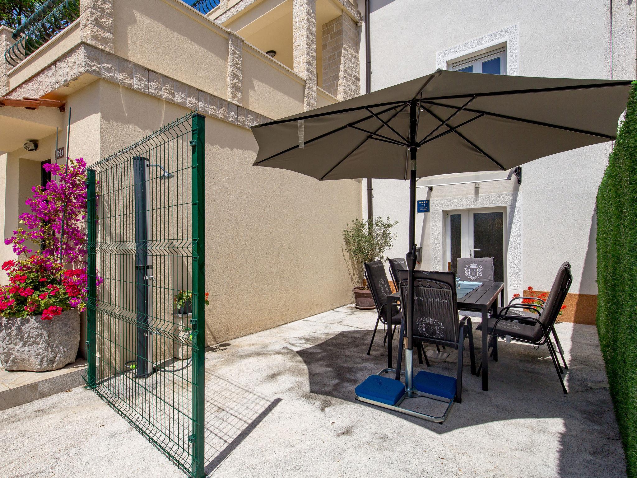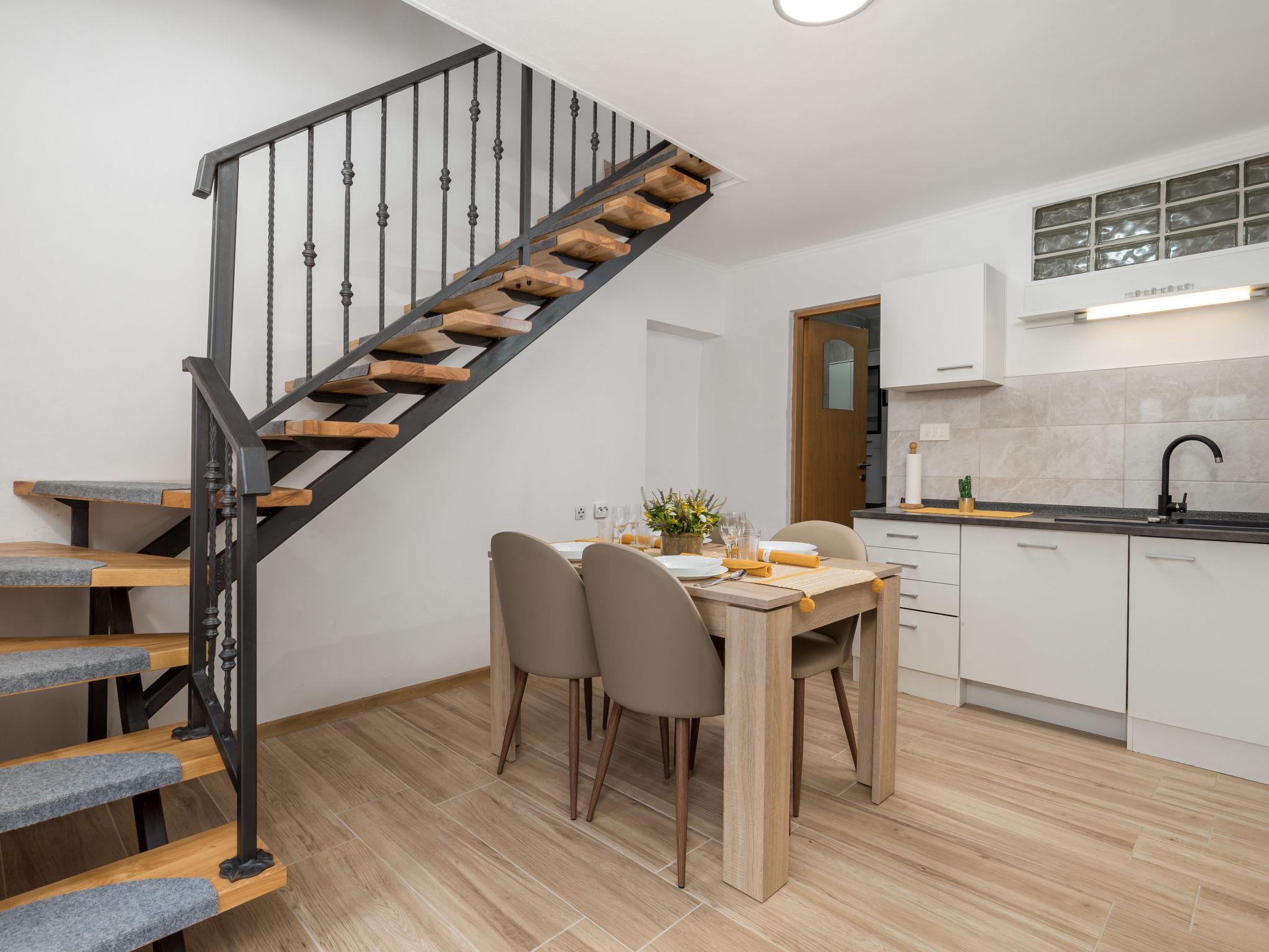 3-room terraced house 80 m2 on 3 levels. Object suitable for 4 adults + 1 child. Beautiful and modern furnishings: dining room. Open kitchen (oven, dishwasher, 4 induction hot plates, toaster, kettle, microwave, freezer, electric coffee machine). Shower/WC. Upper floor: living room with 1 sofabed (140 cm, length 220 cm), satellite TV. Exit to the terrace. Shower/WC. Top floor: 2 rooms with sloping ceilings, ceiling height 150 - 250 cm with rooflight, each room with 1 double bed (2 x 90 cm, length 200 cm), satellite TV. Forced-air heating. Terrace 20 m2, terrace 8 m2. Terrace furniture. Partial view of the sea. Facilities: safe, iron, children's high chair, baby cot (extra), hair dryer. Internet (WiFi, free). Please note: non-smoking house. Fire extinguisher. Max. occupancy: 4 adults, 1 child up to 12 years old.