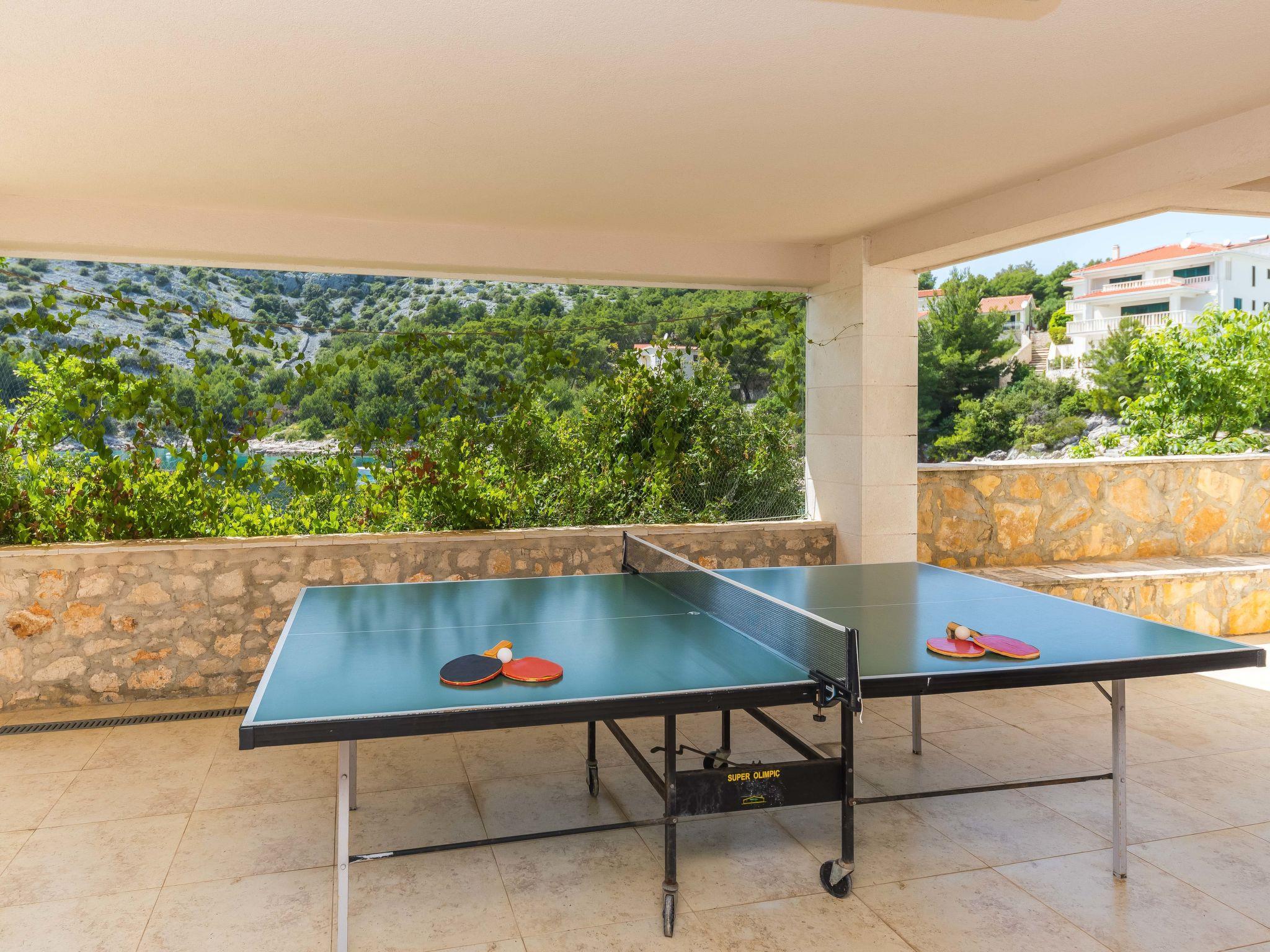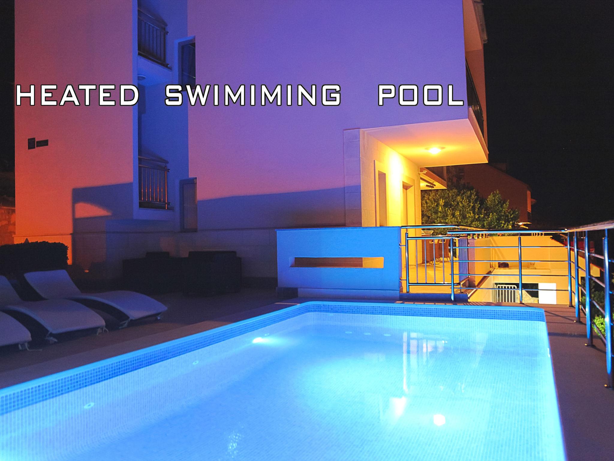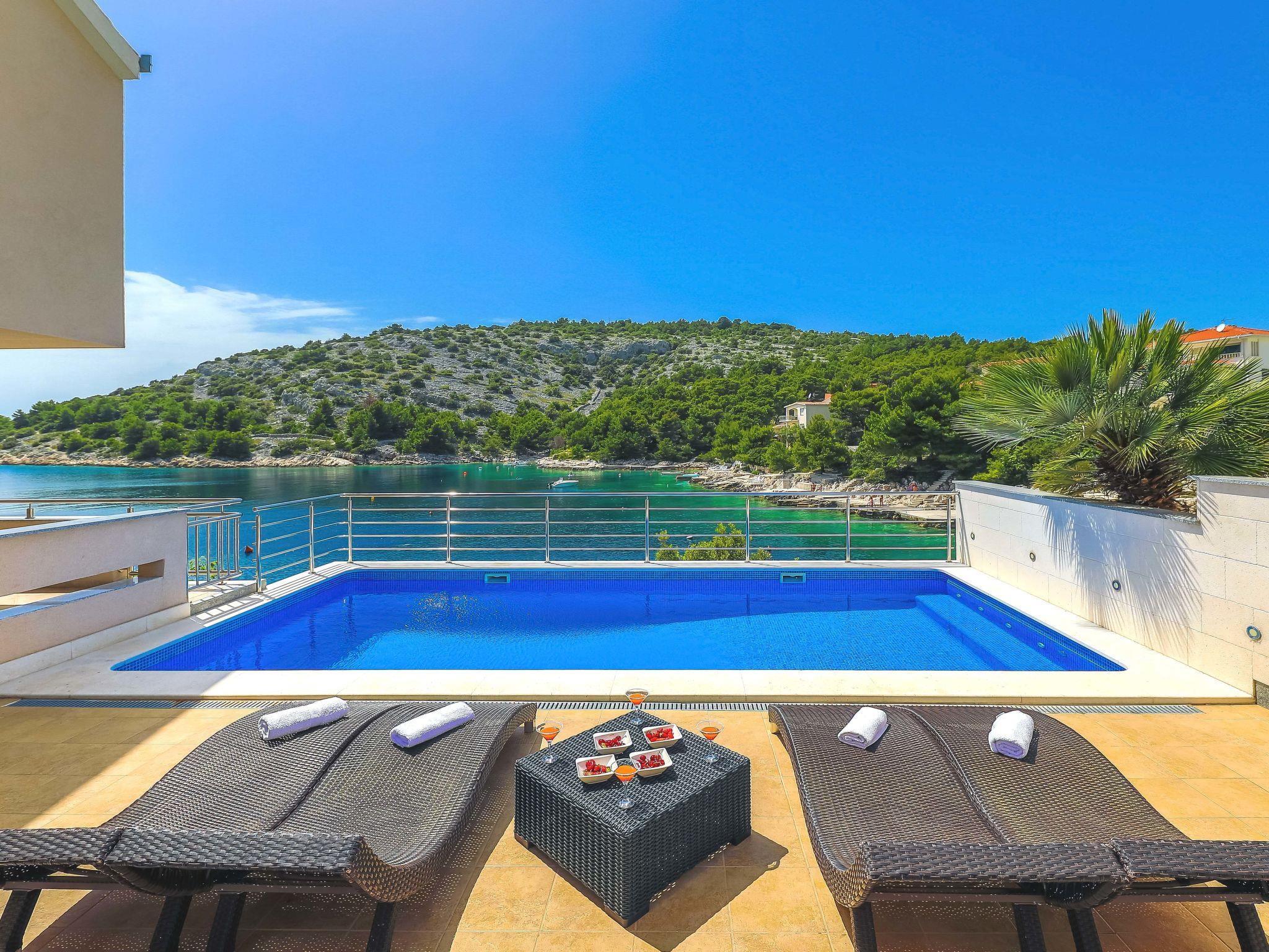 Ražanj 10 km from Rogoznica: Beautiful single-family house "Villa Silvana", 3 storeys. In a quiet, sunny position, at the seaside, on the beach, direct access to the beach. Private: property 300 m2 (fenced), terraced garden, swimming pool angular, heated (8 x 3 m, depth 100 - 180 cm, seasonal availability: 01.Jan. - 31.Dec.). Barbecue. In the house: internet access. Roofed, parking at the house on the premises. Shop, restaurant 500 m, bus stop 6.1 km, rocky beach 10 m.