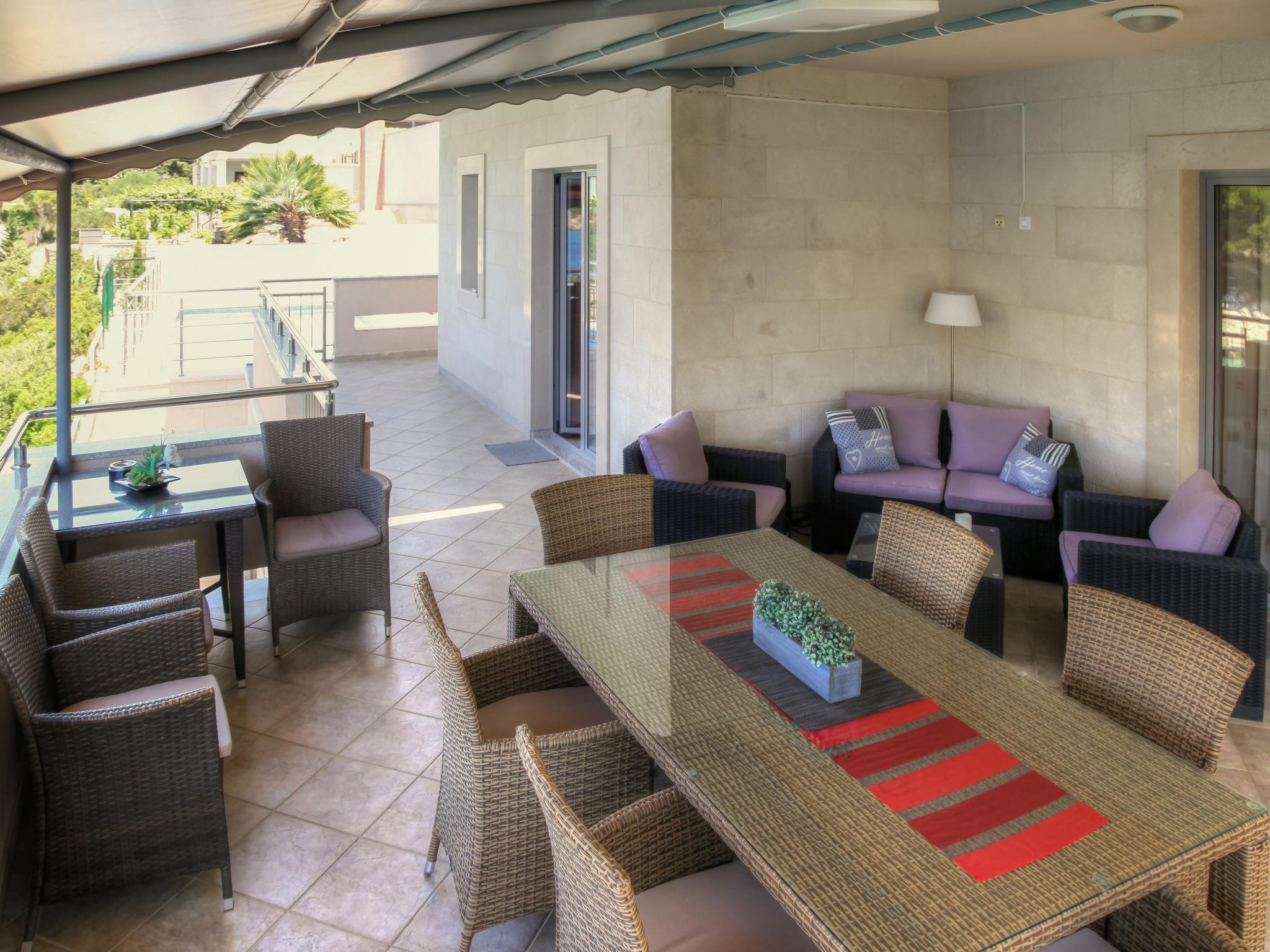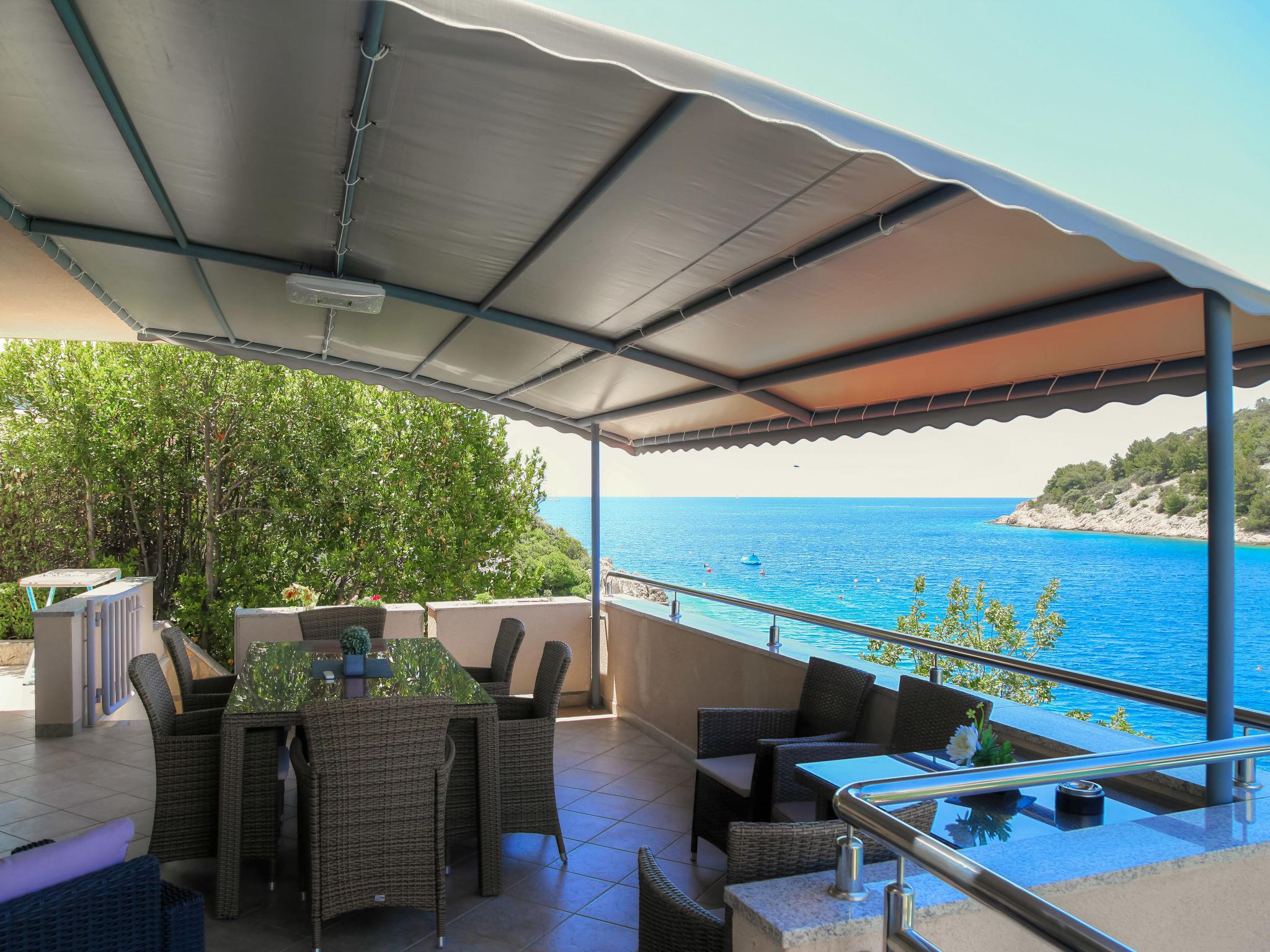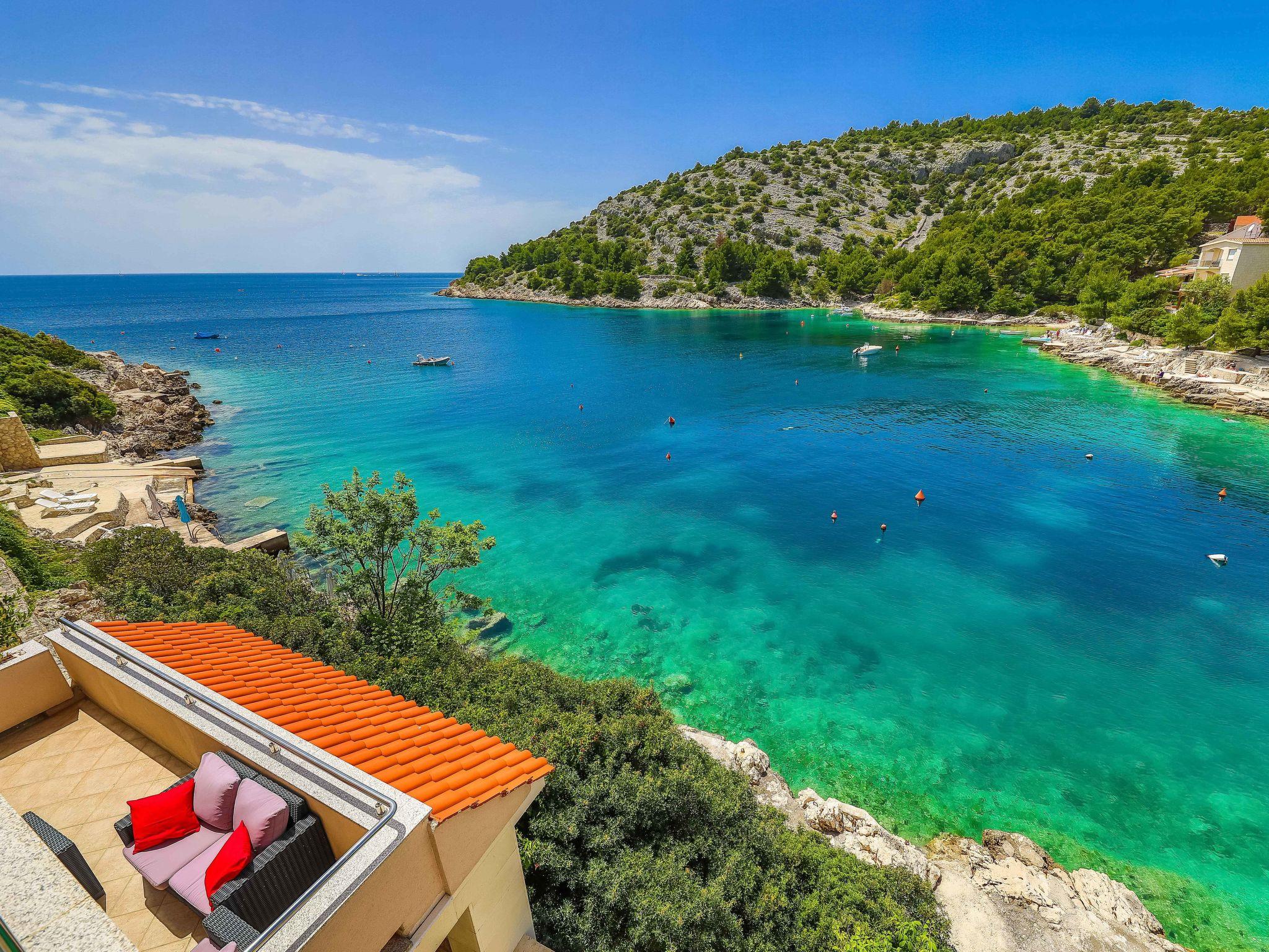 Ražanj 10 km from Rogoznica: Beautiful single-family house "Villa Silvana", 3 storeys. In a quiet, sunny position, at the seaside, on the beach, direct access to the beach. Private: property 300 m2 (fenced), terraced garden, swimming pool angular, heated (8 x 3 m, depth 100 - 180 cm, seasonal availability: 01.Jan. - 31.Dec.). Barbecue. In the house: internet access. Roofed, parking at the house on the premises. Shop, restaurant 500 m, bus stop 6.1 km, rocky beach 10 m.