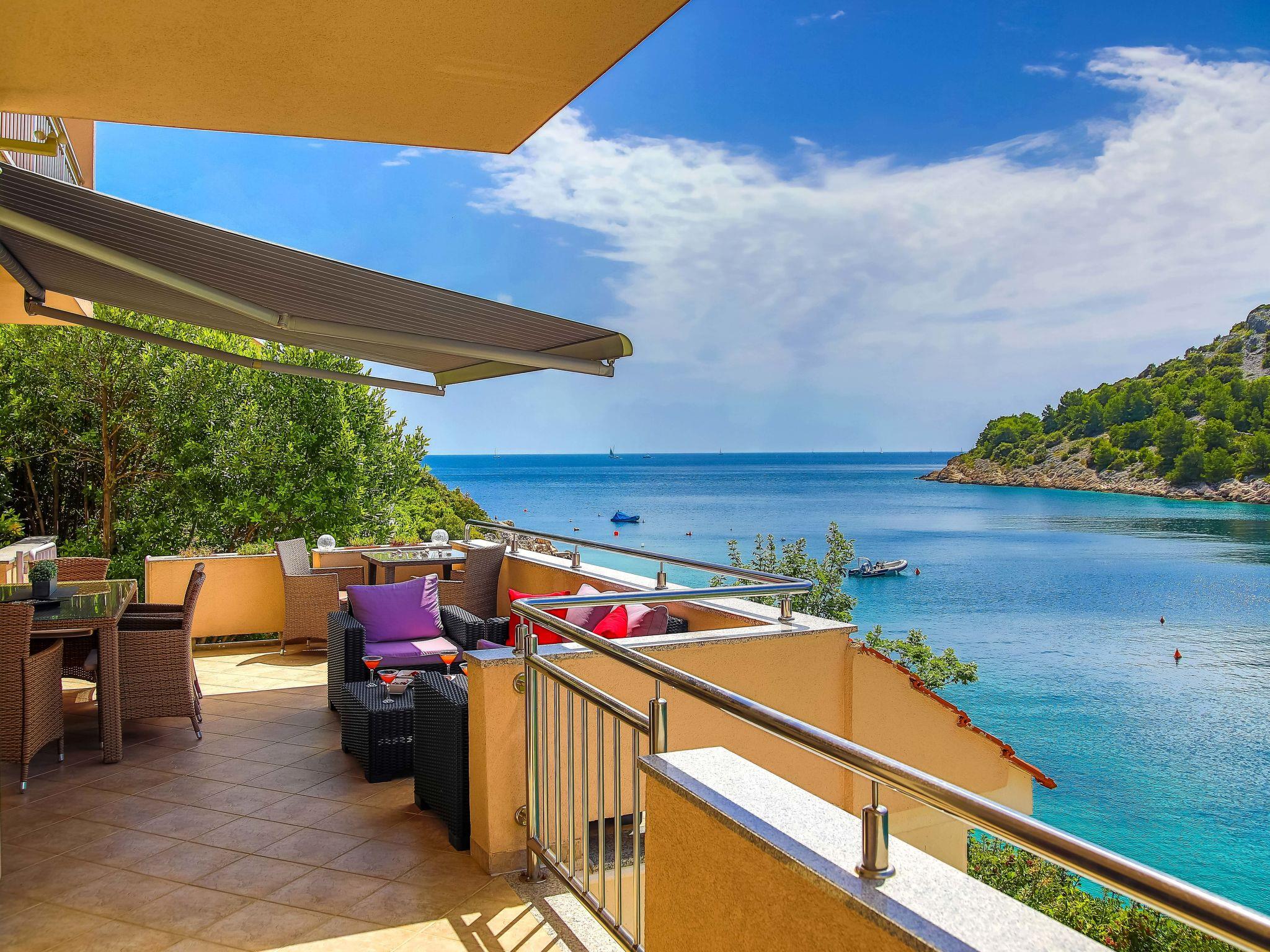 5-room house 180 m2 on 3 levels, south facing position. Tasteful and cosy furnishings: living room with satellite TV (flat screen), air conditioning. Exit to the terrace. Dining room. Open kitchen (4 hot plates, oven, dishwasher). Sep. WC. Upper floor: 2 rooms, each room with 1 double bed (2 x 80 cm, length 200 cm). Exit to the terrace. 1 room with 2 beds (90 cm, length 200 cm). Exit to the terrace. Bath/WC. Top floor: 1 room, ceiling height 120 - 370 cm with 1 bed (90 cm, length 190 cm). Exit to the balcony. Shower/WC. Balcony 2 m2, terrace 40 m2, roofed, 2 terraces 10 m2. Terrace furniture. Marvellous view of the sea. Facilities: washing machine, baby cot. Internet (WiFi, free). Parking (roofed, 3 cars). Please note: private mooring.