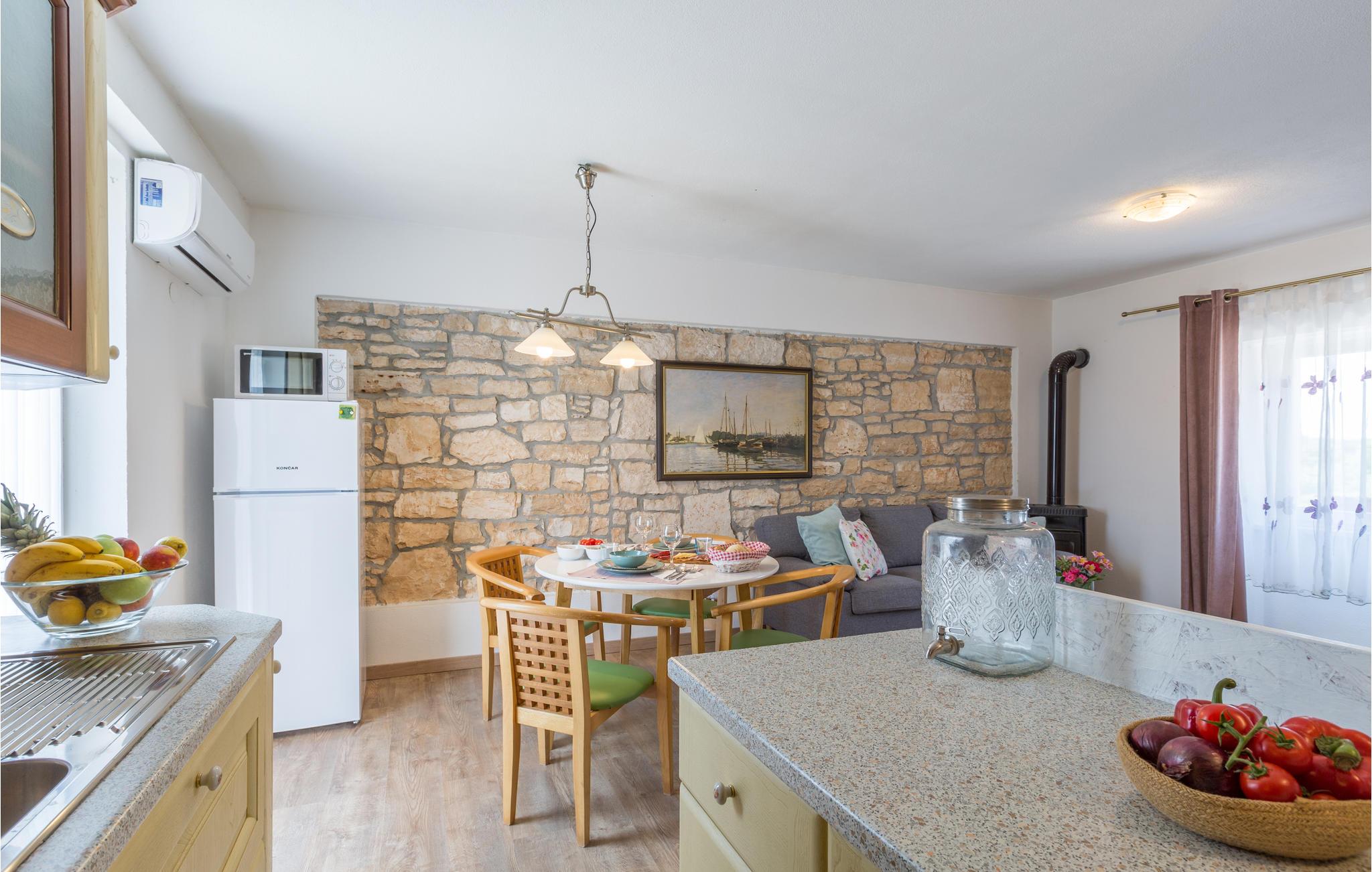 Machen Sie es sich in dem attraktiven Haus so richtig gemütlich, das mit wohnlichem Interieur den idealen Rahmen für eine erholsame Auszeit bietet. Hier treffen unverputztes Mauerwerk und dekorative Holzdecken auf moderne Möbel, eine überaus stilvolle Mischung, die es Ihnen leicht macht, zu entspannen. Nach einem herrlichen Urlaubstag, den Sie vielleicht mit einem Ausflug verbracht haben, lädt das bequeme Sofa dazu ein, noch lange gemütlich zusammen zu sitzen, lassen Sie Ihre Erlebnisse Revue passieren und schmieden Sie schon einmal Pläne für den nächsten Tag.