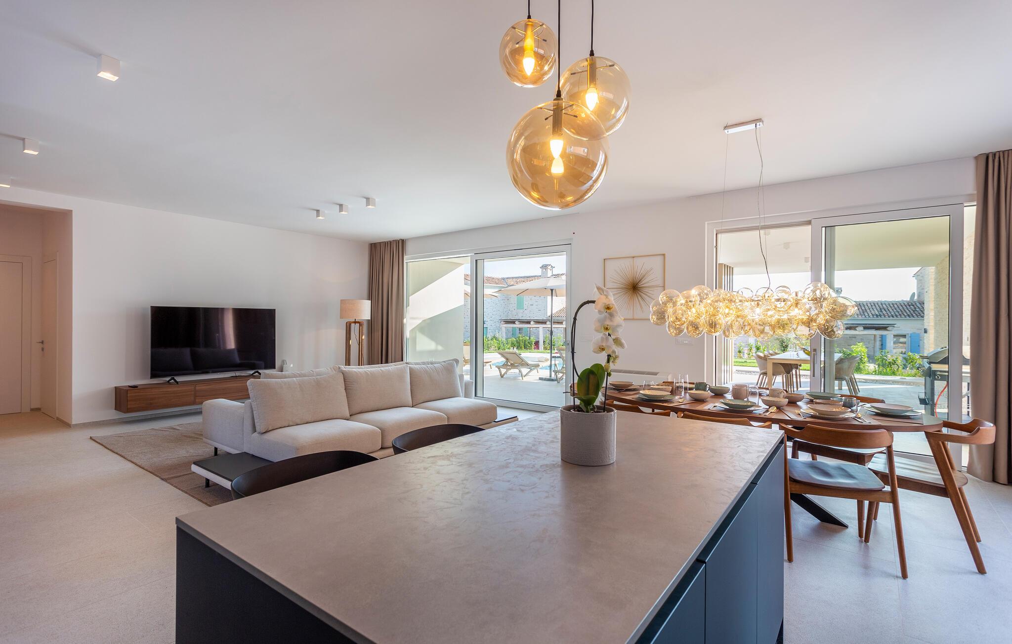 Verbringen Sie eine unvergessliche Zeit in diesem komfortablen und modernen Haus, das seine Gäste nur eine kurze Fahrt vom Strand empfängt und alles bietet, was Sie für einen erholsamen Urlaub brauchen. Entspannen Sie in stilvollem Ambiente, genießen Sie schon beim Aufwachen den Blick auf den Pool und machen Sie es sich nach einem spannenden Tag gemeinsam auf bequemen Sofas gemütlich, sehen Sie gemeinsam einen Film oder plaudern Sie noch lange.