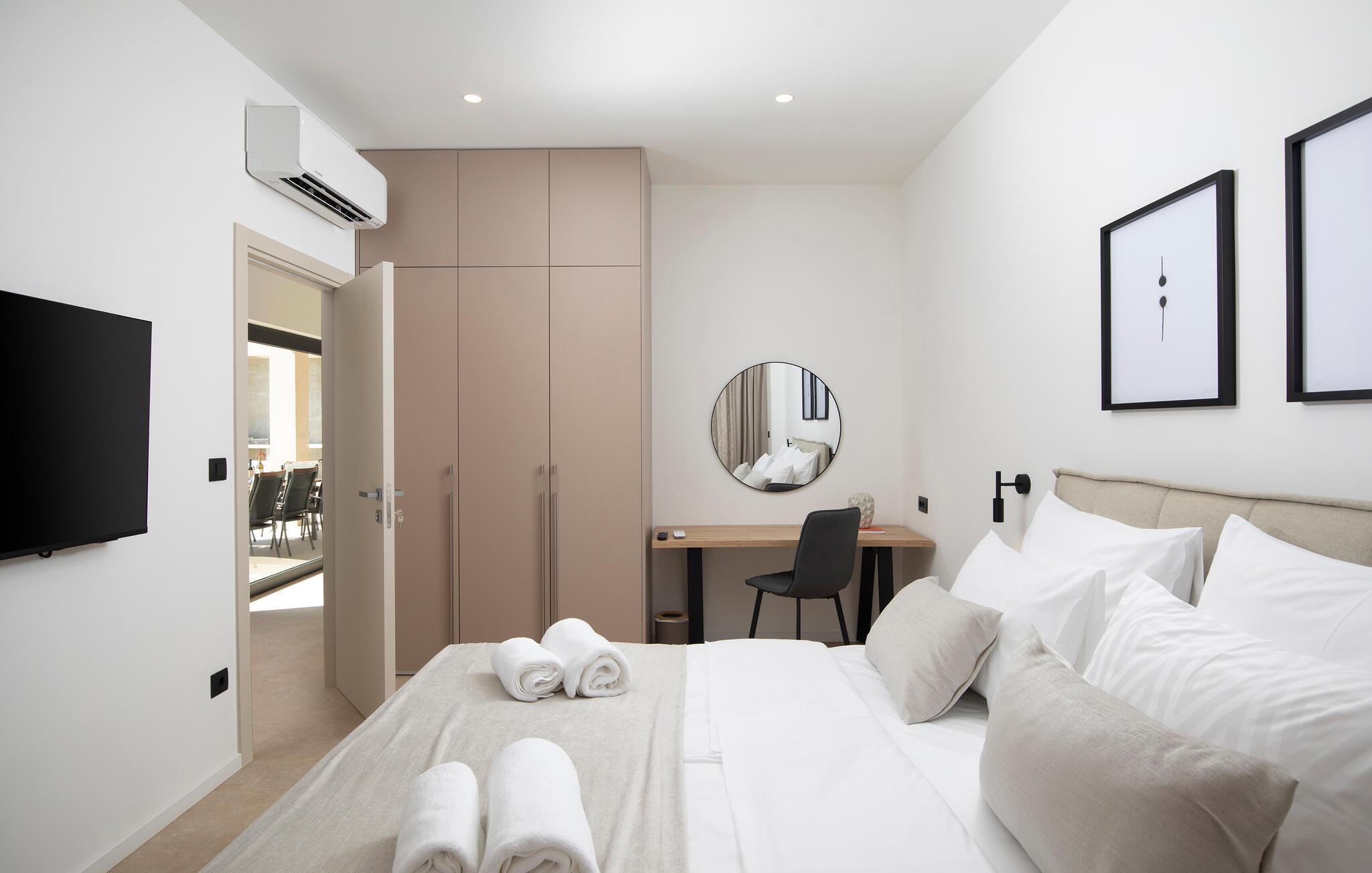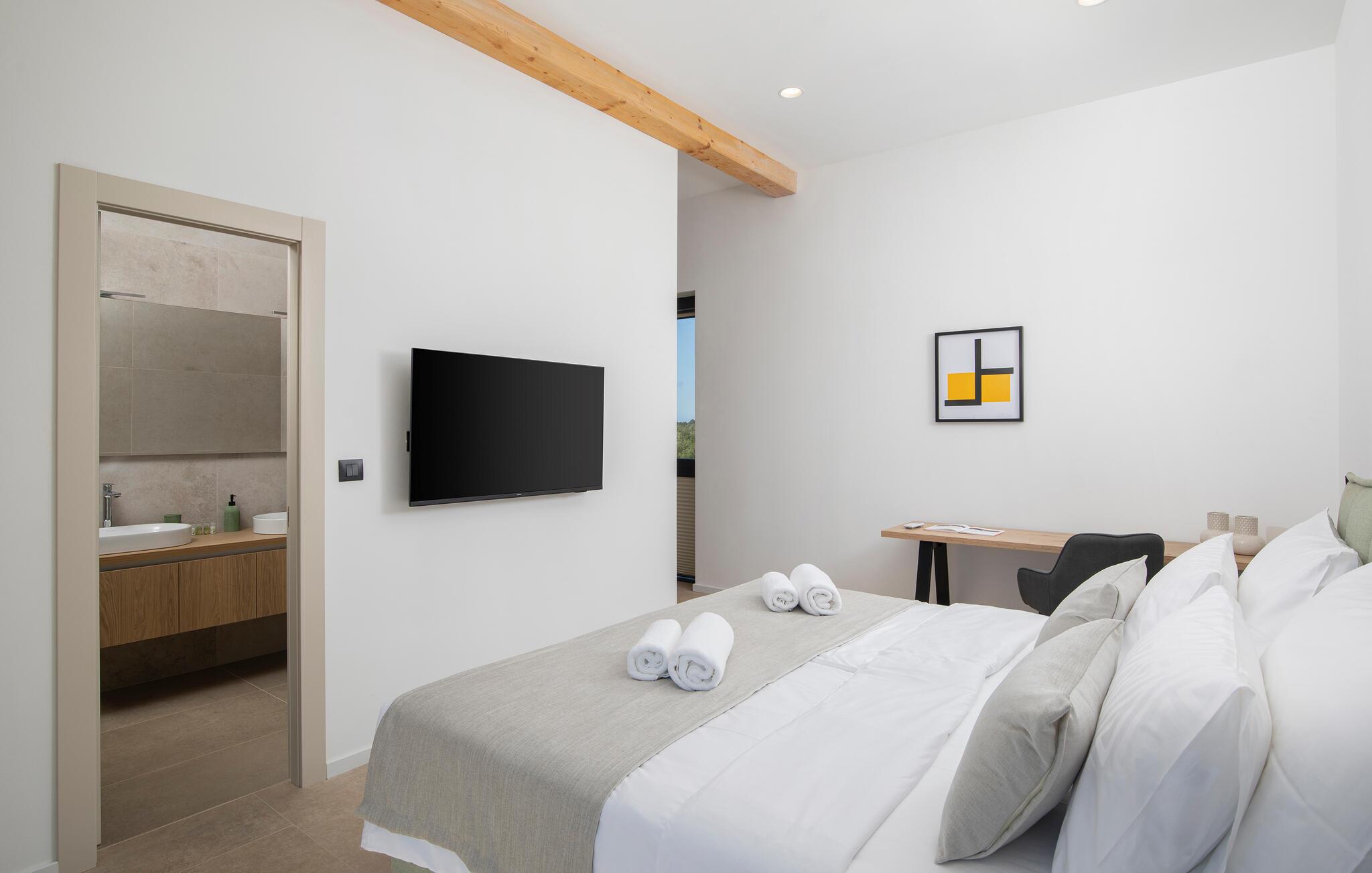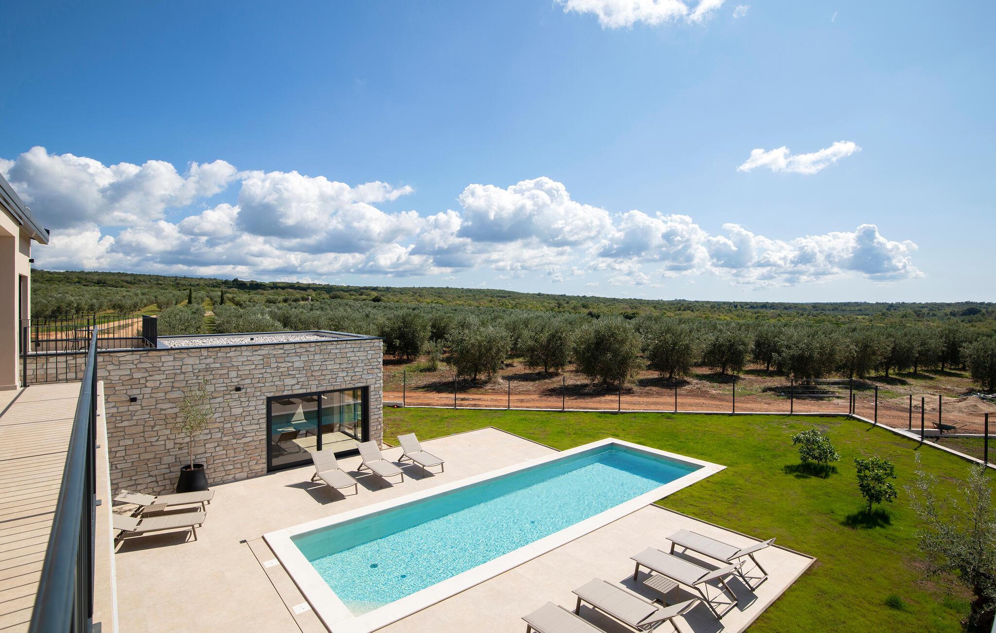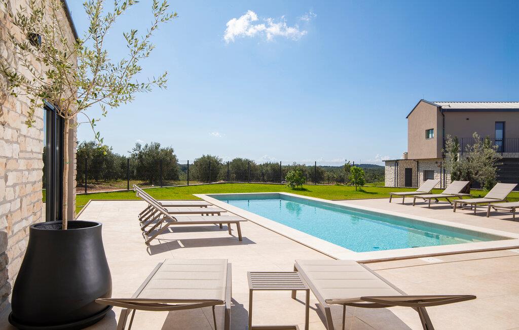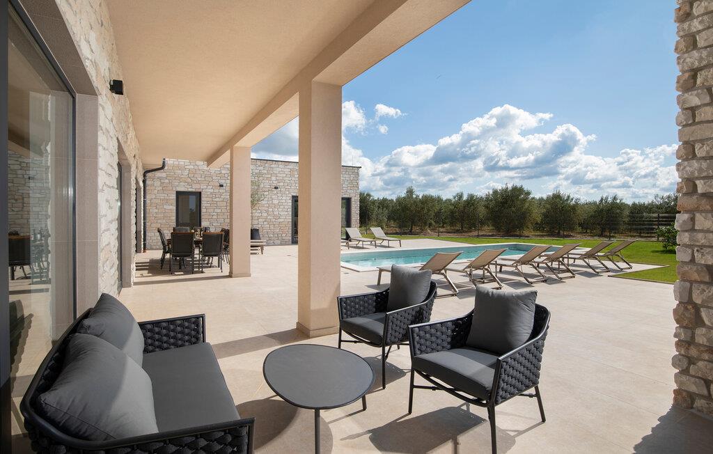 Verbringen Sie auch sonnige Stunden am großen privaten Pool, schwimmen Sie ein paar Bahnen oder entspannen Sie auf den zahlreichen Liegestühlen. Nutzen Sie die überdachten Terrassenbereiche für Mahlzeiten im Freien oder ruhige Nachmittage im Schatten und lassen Sie den Blick über die umliegende Landschaft schweifen. Genießen Sie laue Abende auf der Dachterrasse und beobachten Sie den Sonnenuntergang in entspannter Umgebung.