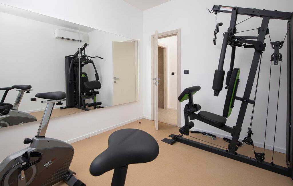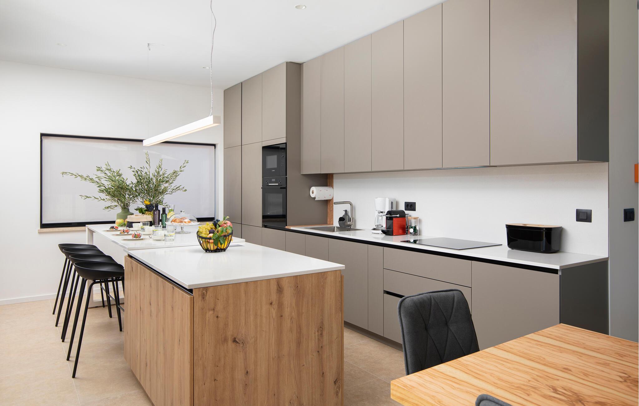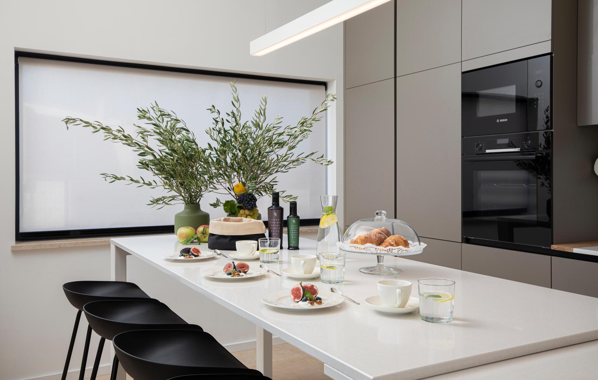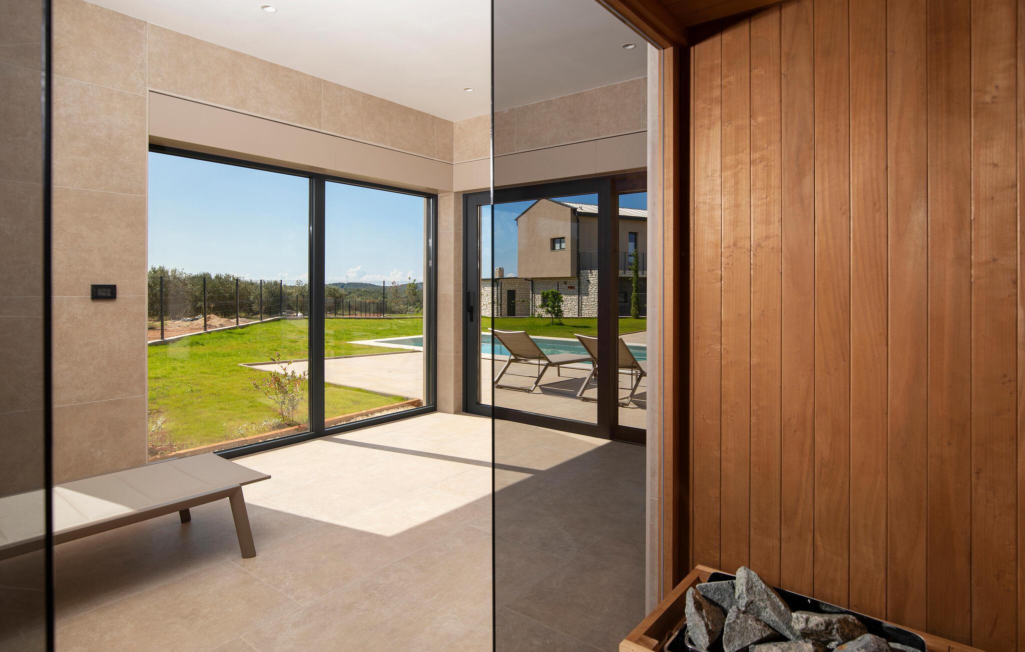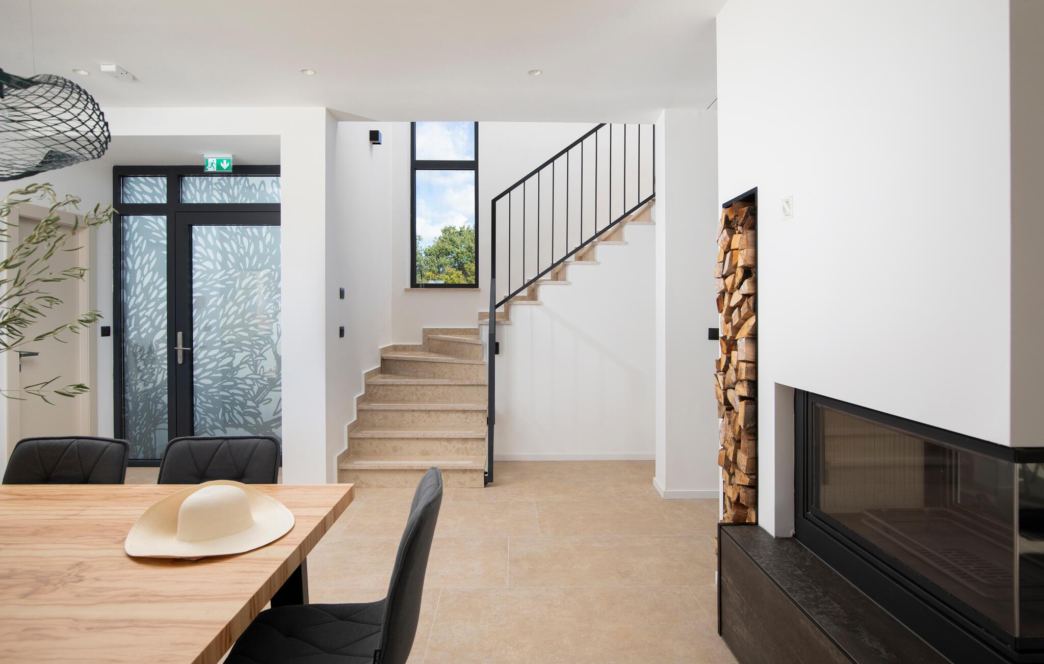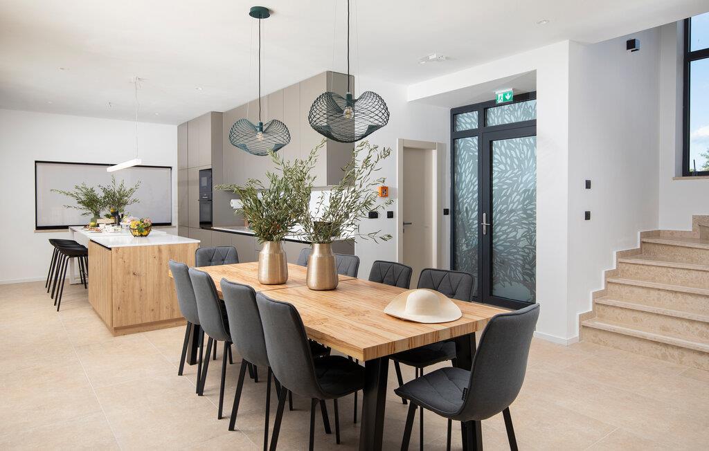 Betreten Sie den großzügigen Innenbereich und genießen Sie das klare, elegante Design. Nehmen Sie im stilvollen Wohnzimmer auf dem komfortablen Sofa Platz und genießen Sie entspannte Stunden mit einem guten Film. Nutzen Sie den langen Esstisch für gemeinsame Mahlzeiten oder gesellige Abende. Bereiten Sie Ihre Speisen in der hochwertig ausgestatteten Küche mit Kochinsel zu, die modernes Design mit Funktionalität verbindet. Ziehen Sie sich nach aktiven Tagen zum Relaxen in die Sauna zurück oder trainieren Sie im Fitnessraum.