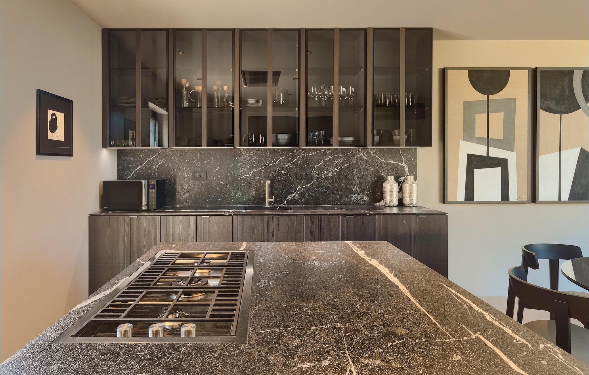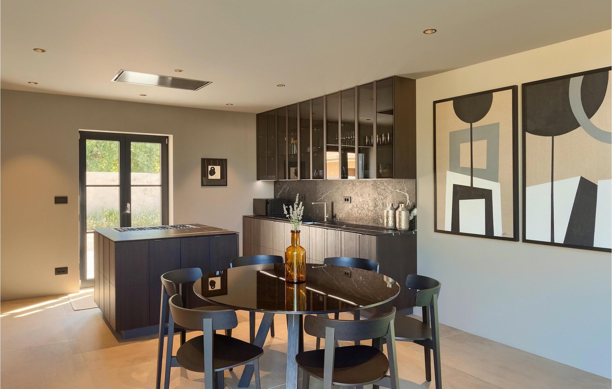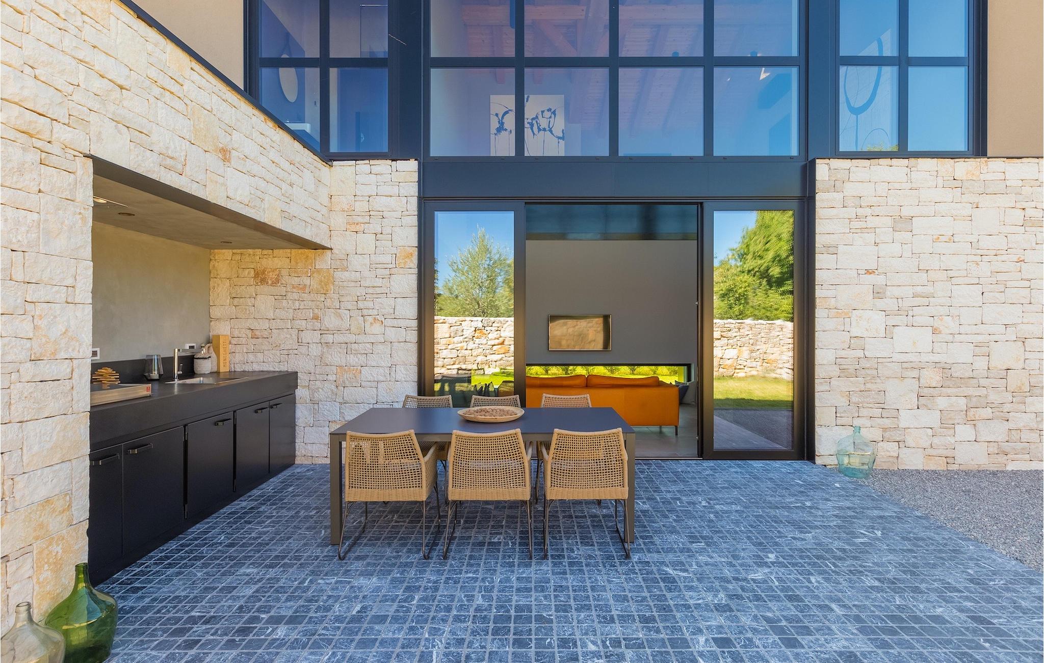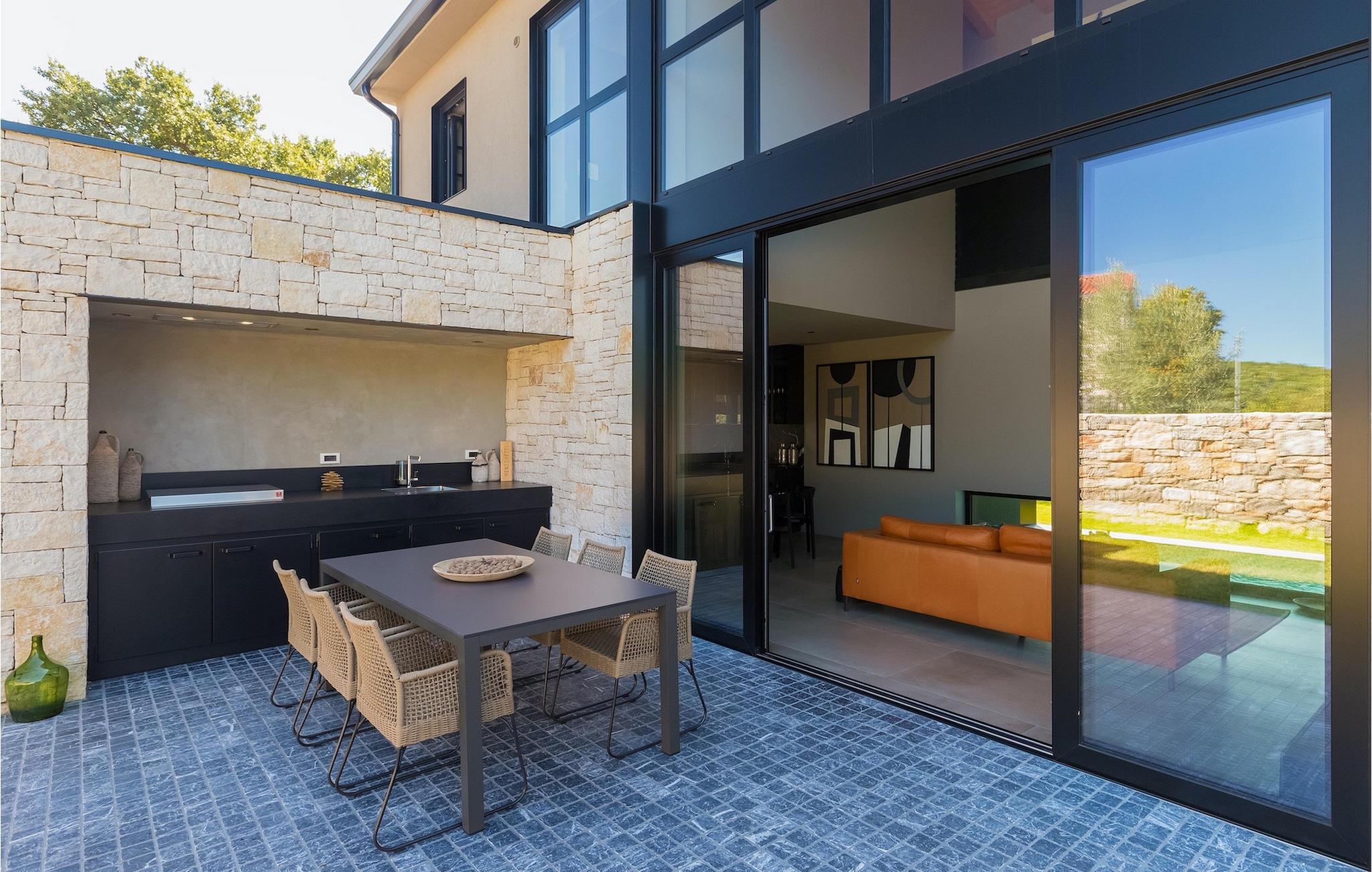 Wenn Sie die Treppe hinunter ins Erdgeschoss nehmen, gelangen Sie in den Wohn- und Essbereich und die voll ausgestattete Küche. Wenn Sie lieber im Freien speisen, stehen Ihnen ein Gasgrill und eine Außenküche mit einem Esstisch für 6 Personen zur Verfügung, nur wenige Schritte vom Wohnzimmer entfernt. Ein attraktives Merkmal der Villa ist die Glasfläche, die das Wohnzimmer und den Pool trennt. Der einladende Pool ist sowohl vom Garten als auch von innen durch den Wellnessbereich, in dem eine Sauna zur Verfügung steht, leicht zugänglich.
