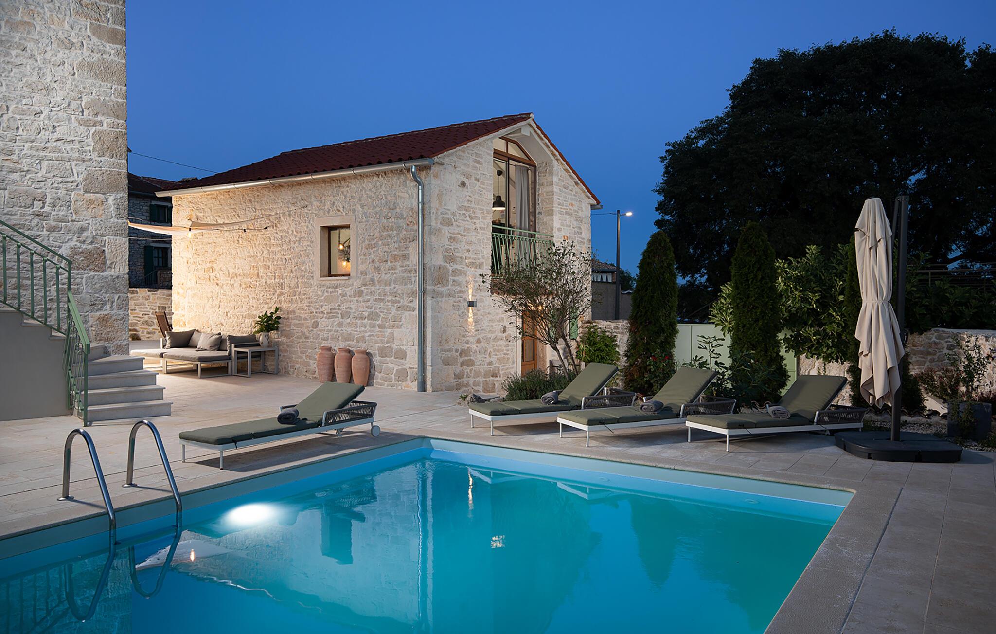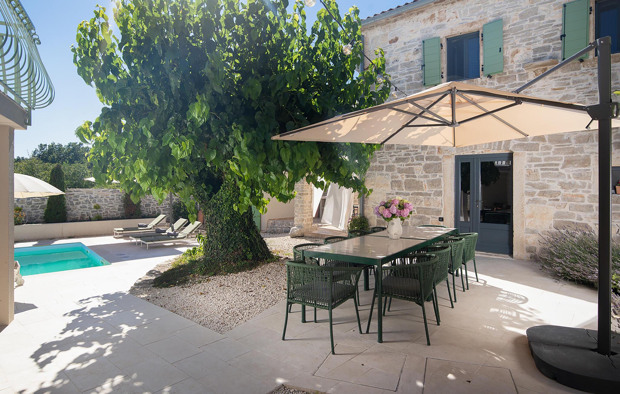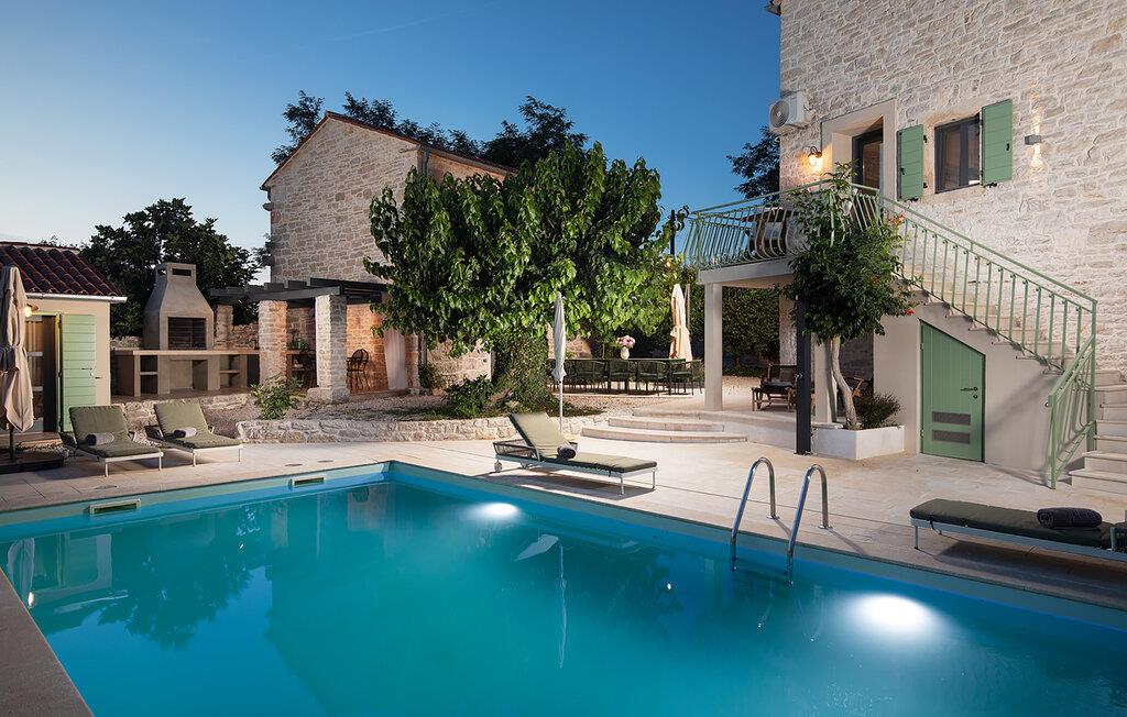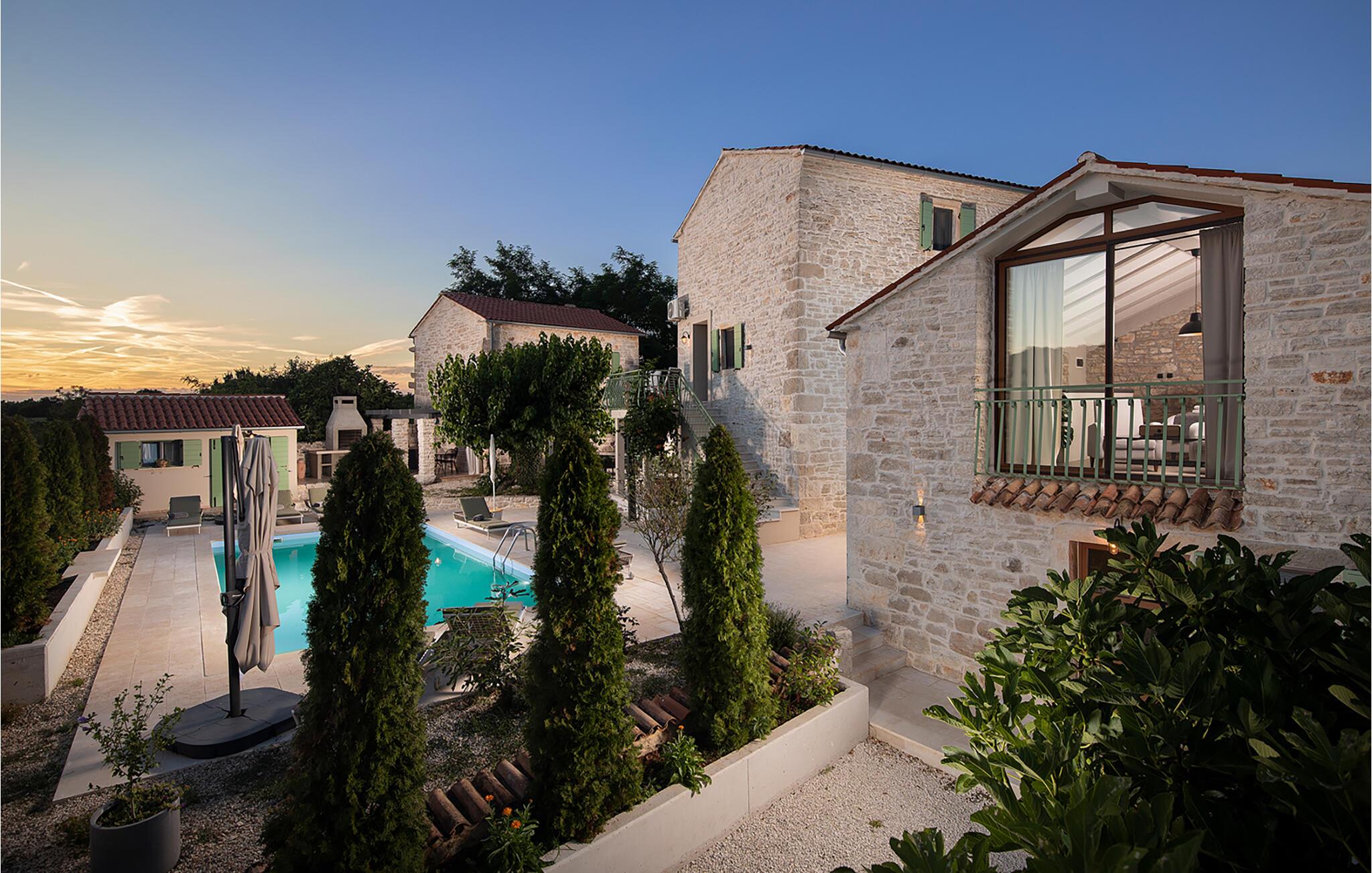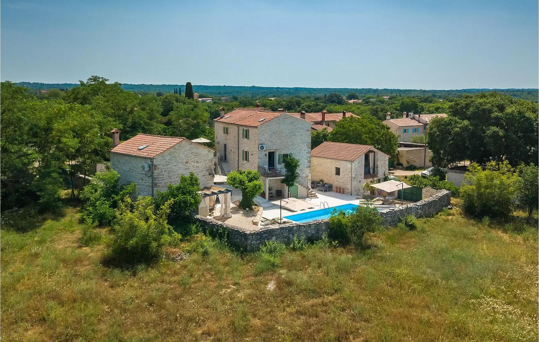 Die Villa Stanza Campitelli ist eine große Steinvilla in der Nähe von Rovinj, die über einen eigenen Pool und vier separate Häuser verfügt, die als eine Einheit vermietet werden. Das Haus ist hell und luftig, ein altes renoviertes Anwesen, das mit modernen Möbeln eingerichtet ist, die nicht im Widerspruch zu den alten Wurzeln stehen. Während der Renovierung wurden absichtlich viele Ziegel, Steine ??und Holzbalken in den Häusern zurückgelassen, und das Farbschema des Innenraums ist natürlich und entspannend.