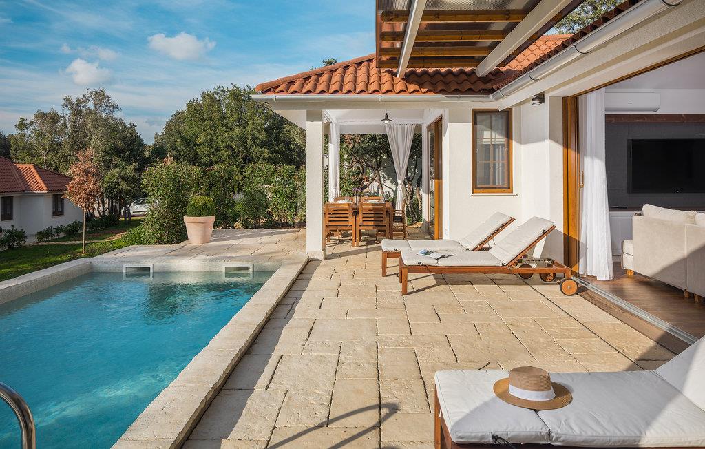 Wunderschöne Villa Luxury Villas Porto Bus befindet sich auf einem großen Grundstück in der zweiten Reihe zum Meer neben anderen Luxusvillen mit privatem Pool. Hinter der Villa finden Sie atemberaubende Natur, daher ist diese Villa die perfekte Wahl für einen ruhigen Familienurlaub. Diese Villa befindet sich auf einem Campingplatz an der Westküste Istriens, wo Sie alles finden, was Sie für einen erholsamen Urlaub benötigen. Vor der Villa genießen Sie sonnige Tage beim privaten Pool. Im Außenbereich steht Ihnen auch eine Terrasse mit Esstisch zur Verfügung, wo Sie angenehme Sommerabende und romantische Atmosphäre mit Familie und Freunden in vollen Zügen genießen können.