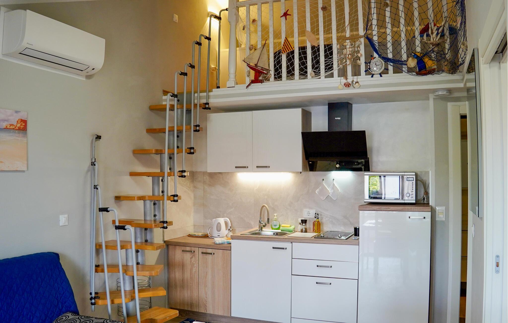 Dieses gemütliche Studio-Apartment befindet sich im zweiten Stock eines Hauses mit mehreren Ferienwohnungen und eignet sich wunderbar für einen Familie mit älteren Kindern, da die Wohnung über eine offene Galerie verfügt, die über die Treppe im Wohnzimmer erreichbar ist. Das helle Ambiente und die gute Ausstattung schaffen für Sie einen Ort der Erholung und des Wohlbefindens. Auf der Terrasse können Sie den Tag mit einem Frühstück beginnen oder einem bei einem Glas Wein ausklingen lassen und sich auf Ihre nächsten Erlebnisse freuen.
