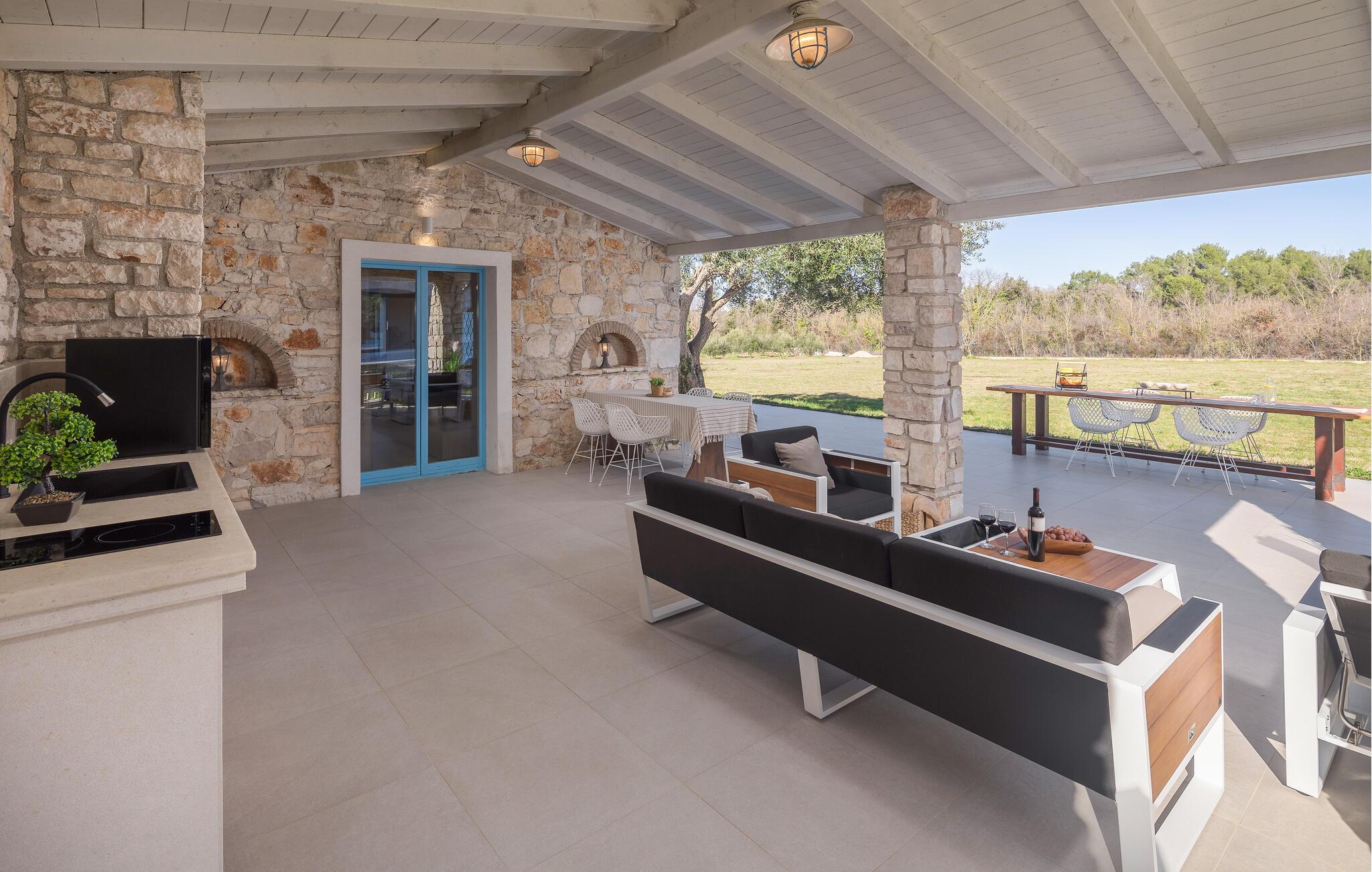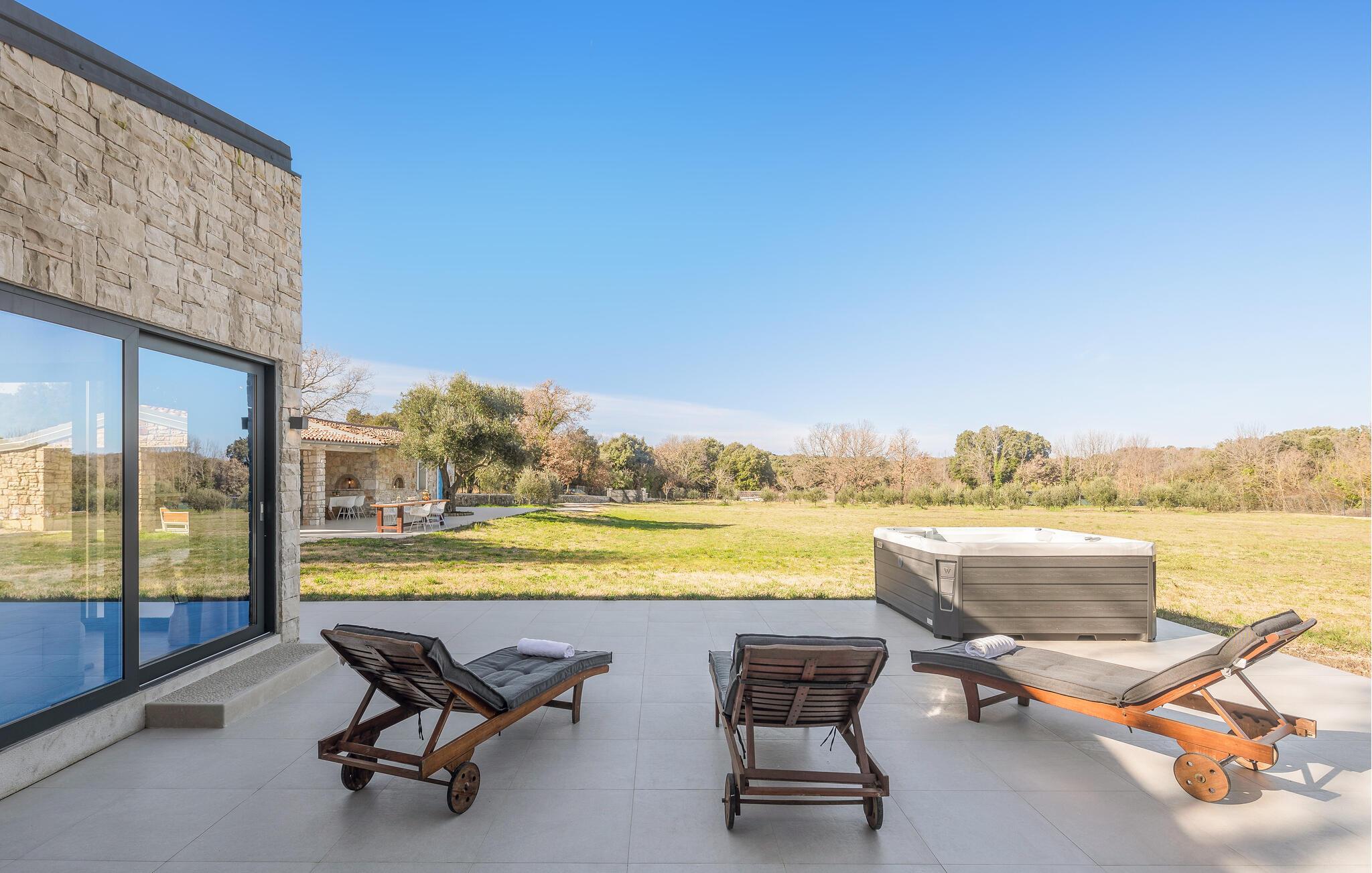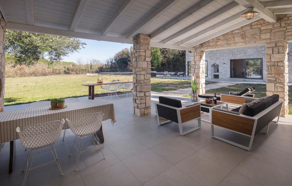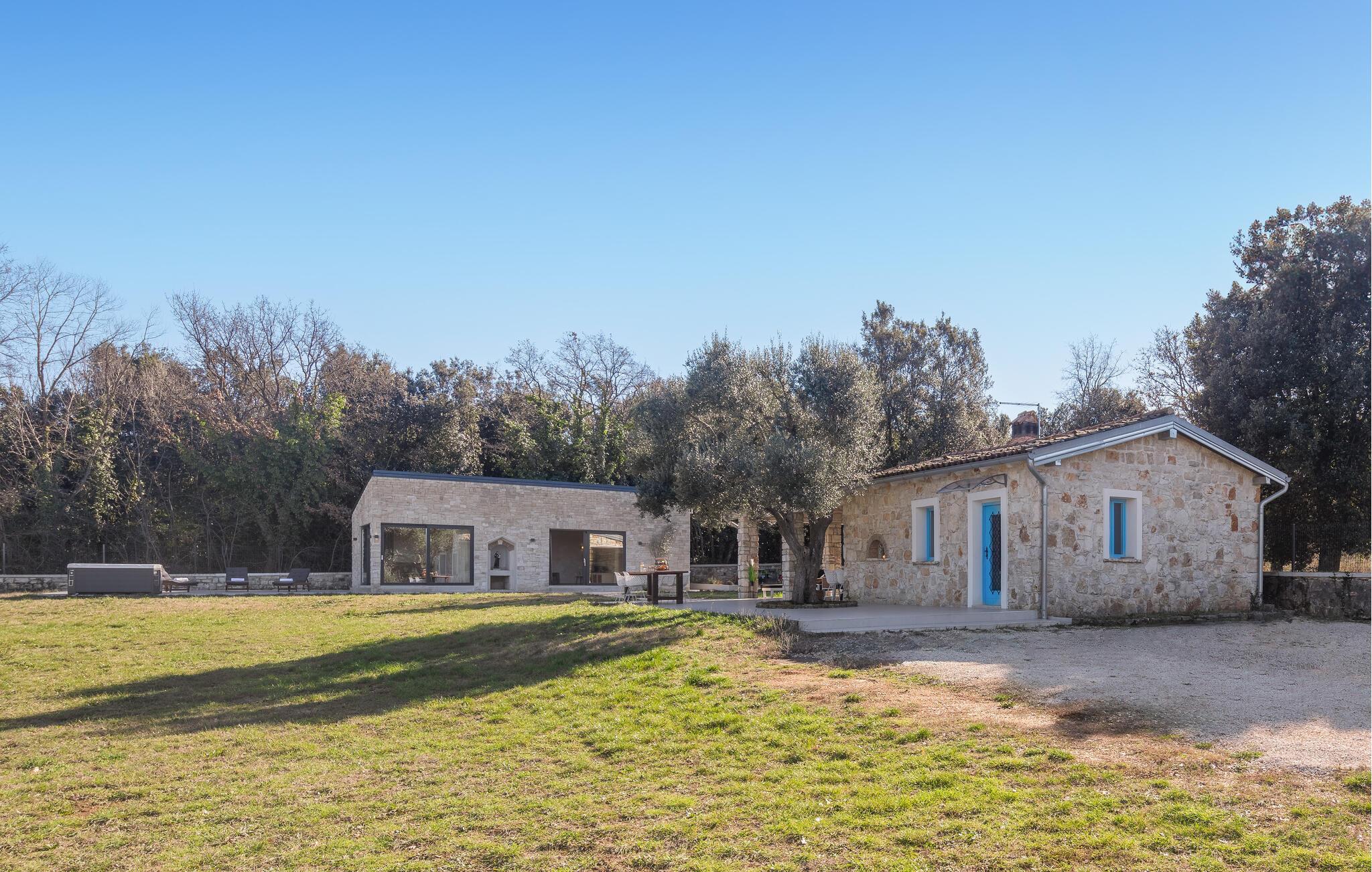 Nahe der Küste, südlich von Rovinj, empfängt Sie diese komfortable Unterkunft mit zwei eleganten Steingebäuden, die keine Ihrer Wünsche unerfüllt lässt. Zwei Paare können hier gemeinsam Ihren Urlaub genießen, aber dennoch Ihre Privatsphäre auskosten. Die hochwertige Einrichtung und das schöne Dekor schaffen eine wahre Wohlfühloase, die Sie zur Ruhe kommen lässt. Blicken Sie durch die bodentiefen Fenster hinaus in den Garten und auf die Landschaft und treten hinaus auf die beiden Terrassen. Während die eine ganz im Zeichen von Wellness steht und Sie zum Sonnenbaden oder Relaxen im Whirlpool einlädt, bietet Ihnen die zweite, überdachte eine Sommerküche und einen wunderschönen Ort für Ihre Mahlzeiten. Fordern Sie sich auch zu einer Partie Tischtennis heraus und planen Ihre nächsten Ausflüge.