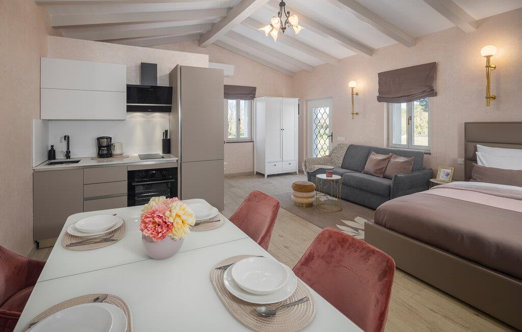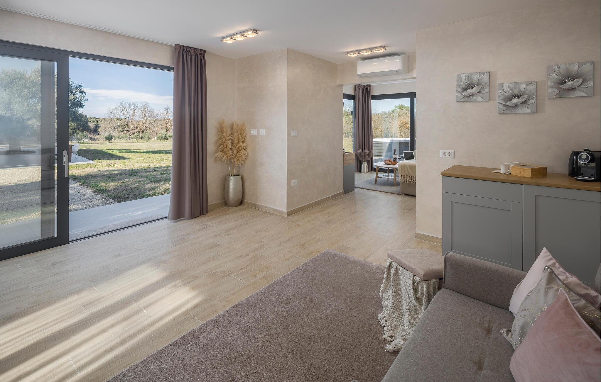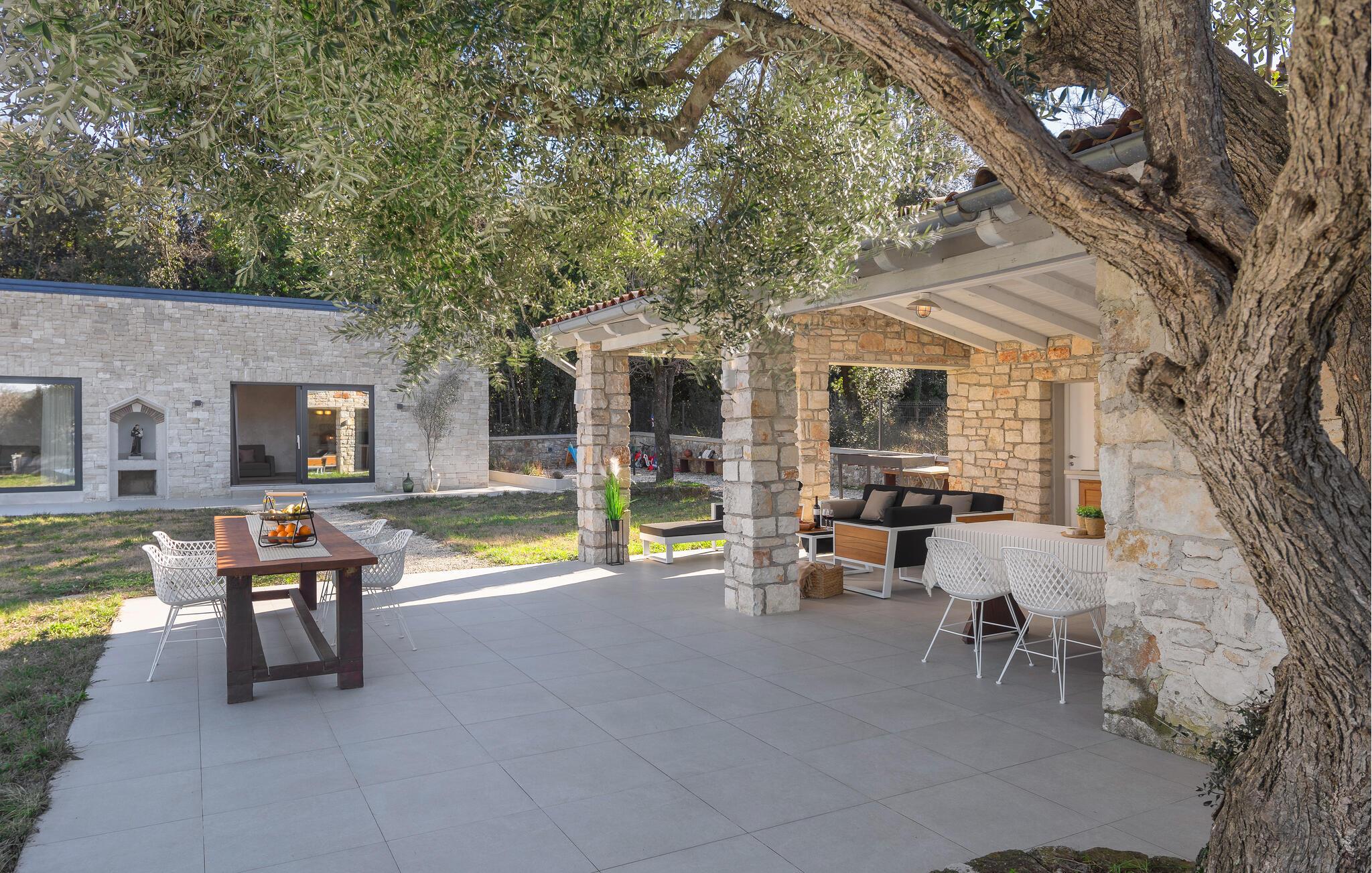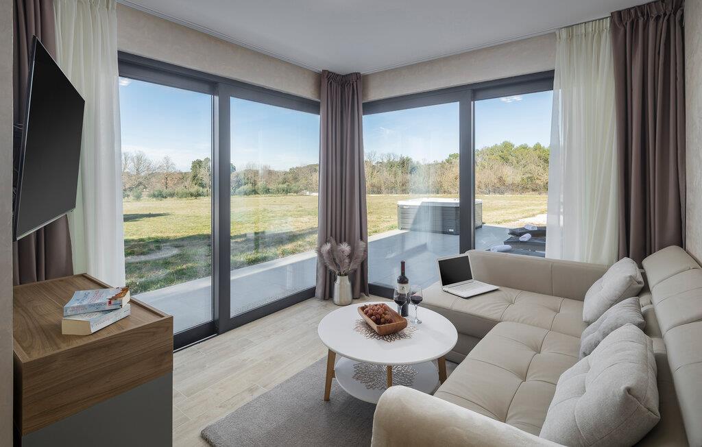 Nahe der Küste, südlich von Rovinj, empfängt Sie diese komfortable Unterkunft mit zwei eleganten Steingebäuden, die keine Ihrer Wünsche unerfüllt lässt. Zwei Paare können hier gemeinsam Ihren Urlaub genießen, aber dennoch Ihre Privatsphäre auskosten. Die hochwertige Einrichtung und das schöne Dekor schaffen eine wahre Wohlfühloase, die Sie zur Ruhe kommen lässt. Blicken Sie durch die bodentiefen Fenster hinaus in den Garten und auf die Landschaft und treten hinaus auf die beiden Terrassen. Während die eine ganz im Zeichen von Wellness steht und Sie zum Sonnenbaden oder Relaxen im Whirlpool einlädt, bietet Ihnen die zweite, überdachte eine Sommerküche und einen wunderschönen Ort für Ihre Mahlzeiten. Fordern Sie sich auch zu einer Partie Tischtennis heraus und planen Ihre nächsten Ausflüge.