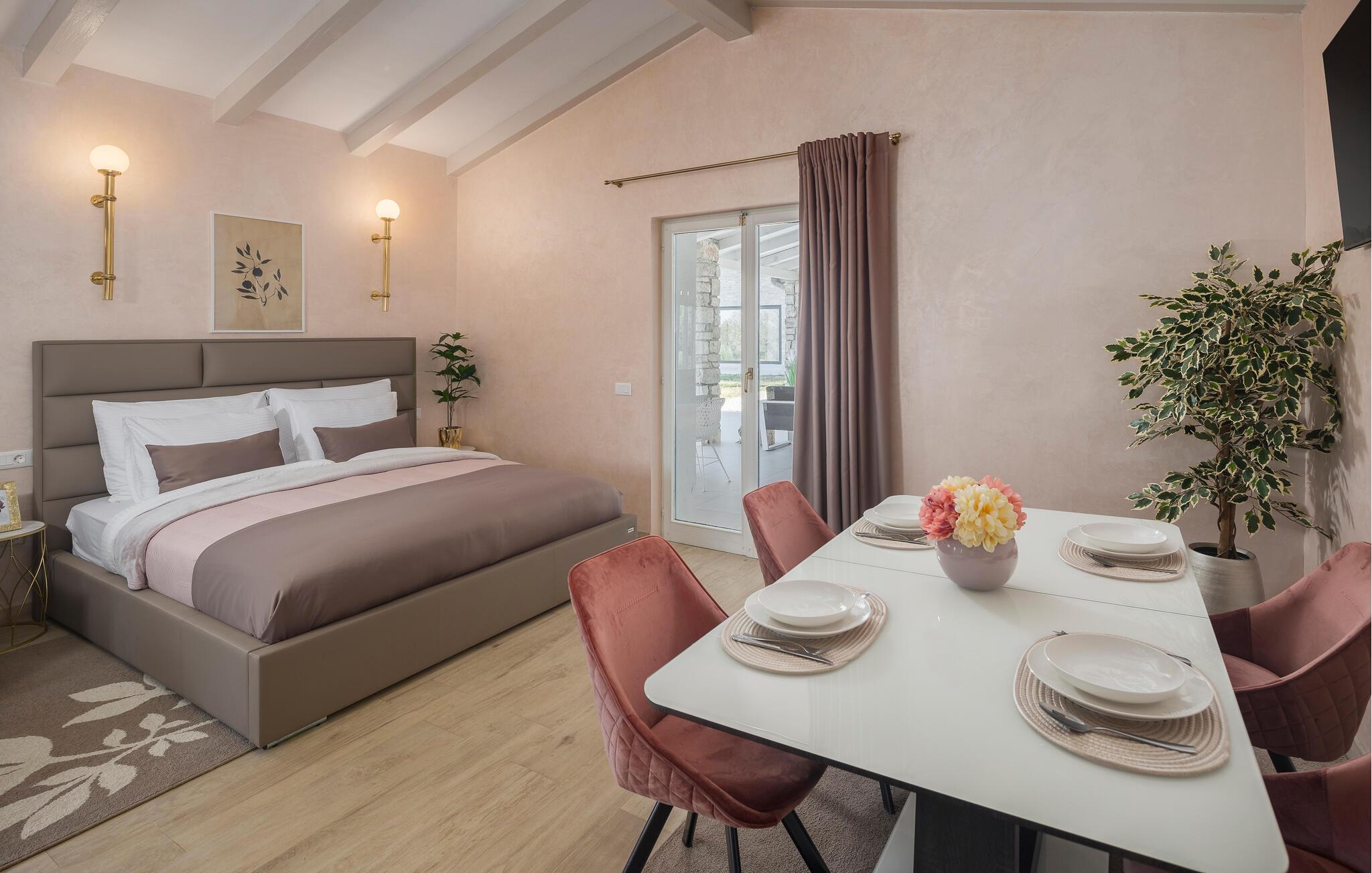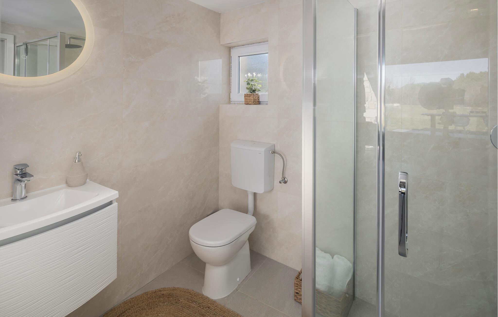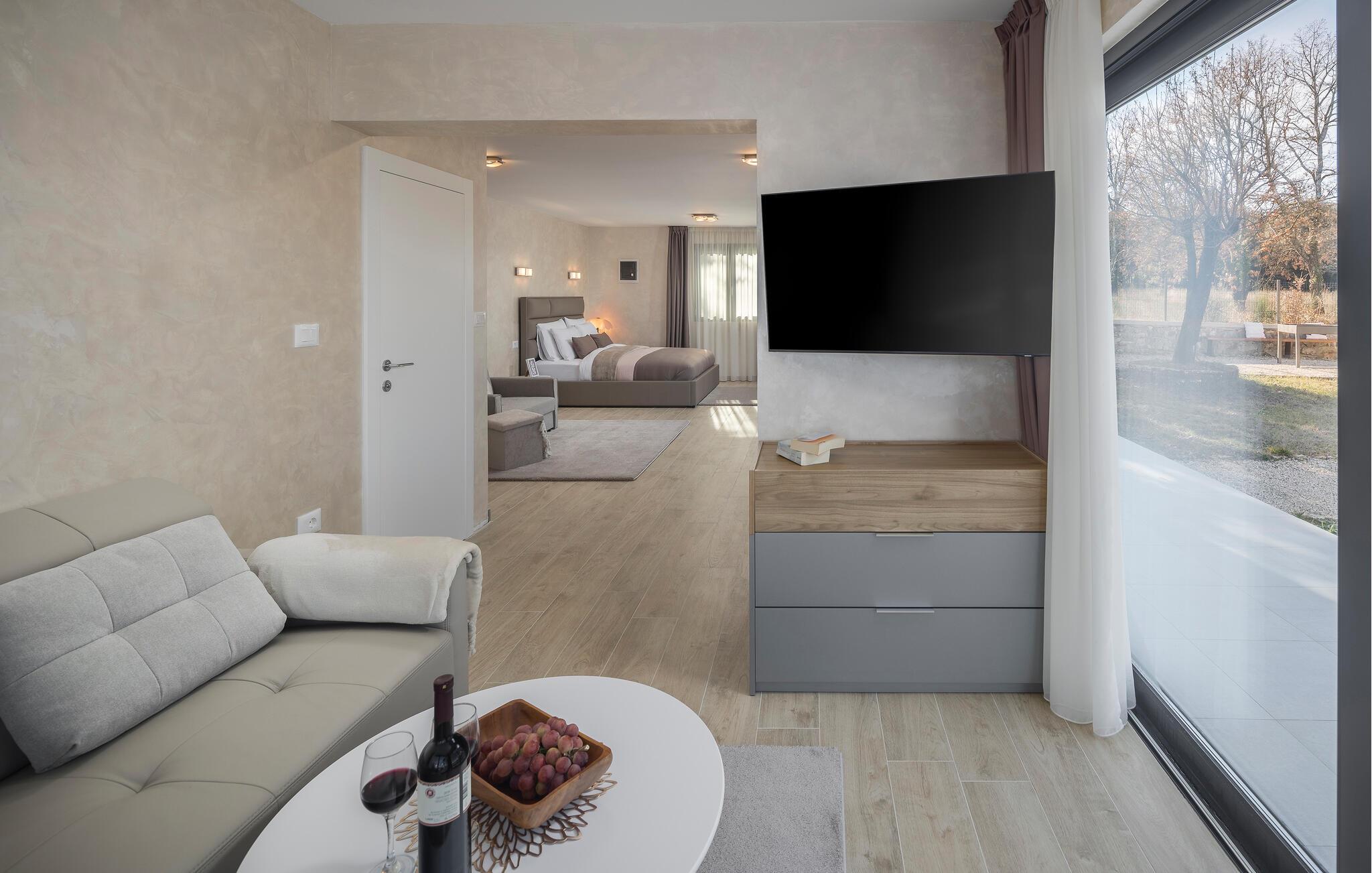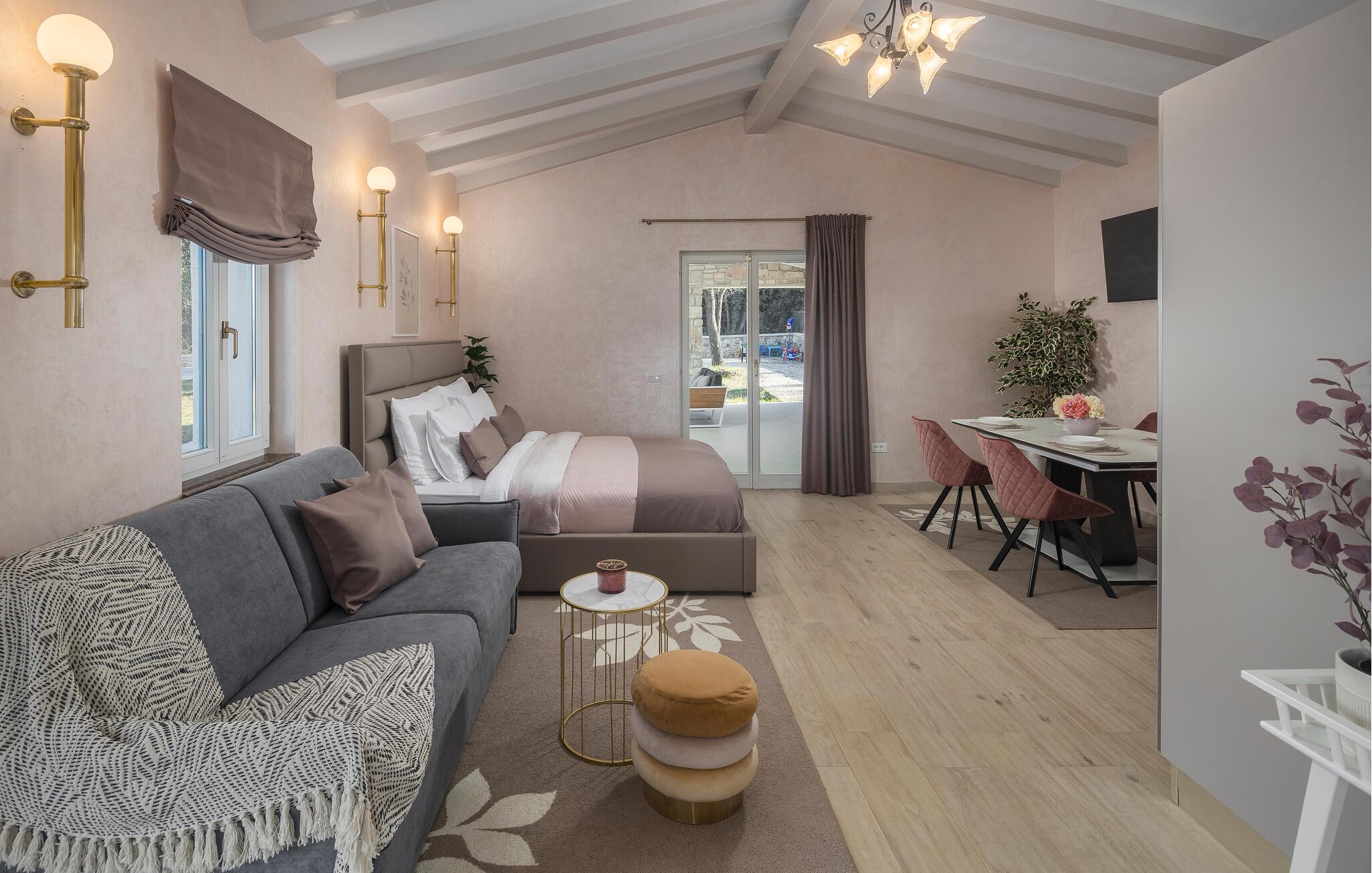 Nahe der Küste, südlich von Rovinj, empfängt Sie diese komfortable Unterkunft mit zwei eleganten Steingebäuden, die keine Ihrer Wünsche unerfüllt lässt. Zwei Paare können hier gemeinsam Ihren Urlaub genießen, aber dennoch Ihre Privatsphäre auskosten. Die hochwertige Einrichtung und das schöne Dekor schaffen eine wahre Wohlfühloase, die Sie zur Ruhe kommen lässt. Blicken Sie durch die bodentiefen Fenster hinaus in den Garten und auf die Landschaft und treten hinaus auf die beiden Terrassen. Während die eine ganz im Zeichen von Wellness steht und Sie zum Sonnenbaden oder Relaxen im Whirlpool einlädt, bietet Ihnen die zweite, überdachte eine Sommerküche und einen wunderschönen Ort für Ihre Mahlzeiten. Fordern Sie sich auch zu einer Partie Tischtennis heraus und planen Ihre nächsten Ausflüge.