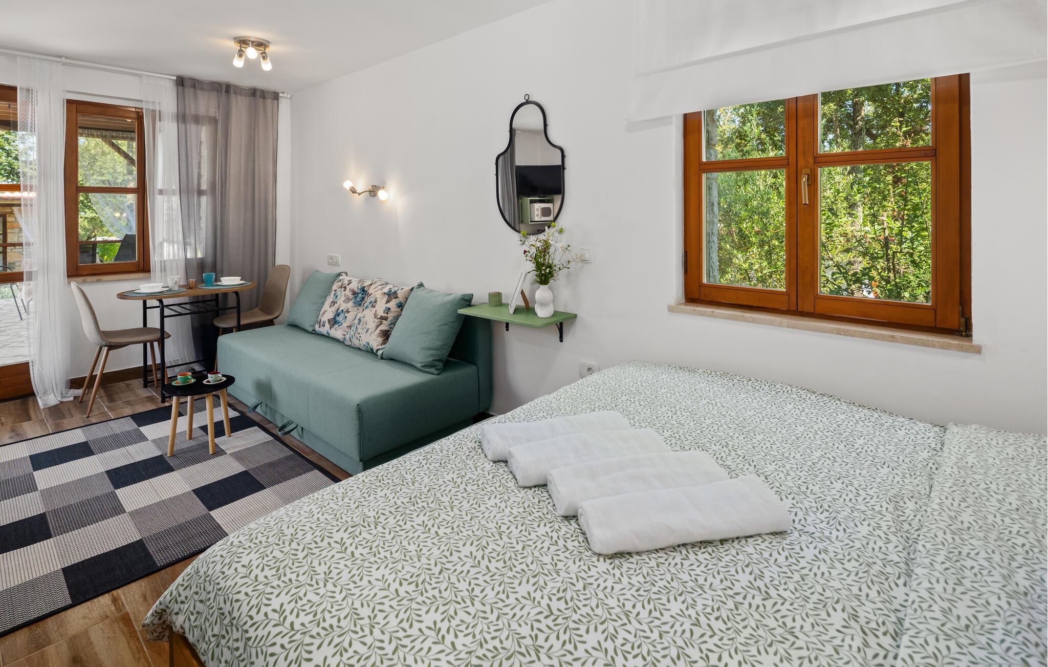 Dieses gemütlich eingerichtete Steinhaus begrüßt Sie als Teil einer gepflegten Anlage und lädt zu entspannten Tagen inmitten der Natur ein. Planen Sie bei einem ausgedehnten Frühstück die Unternehmungen für den bevorstehenden Tag und lassen Sie den Abend auf dem einladenden Sofa ausklingen – beim Streamen eines Films oder bei gemeinsamer Zeit mit einem Brettspiel.
