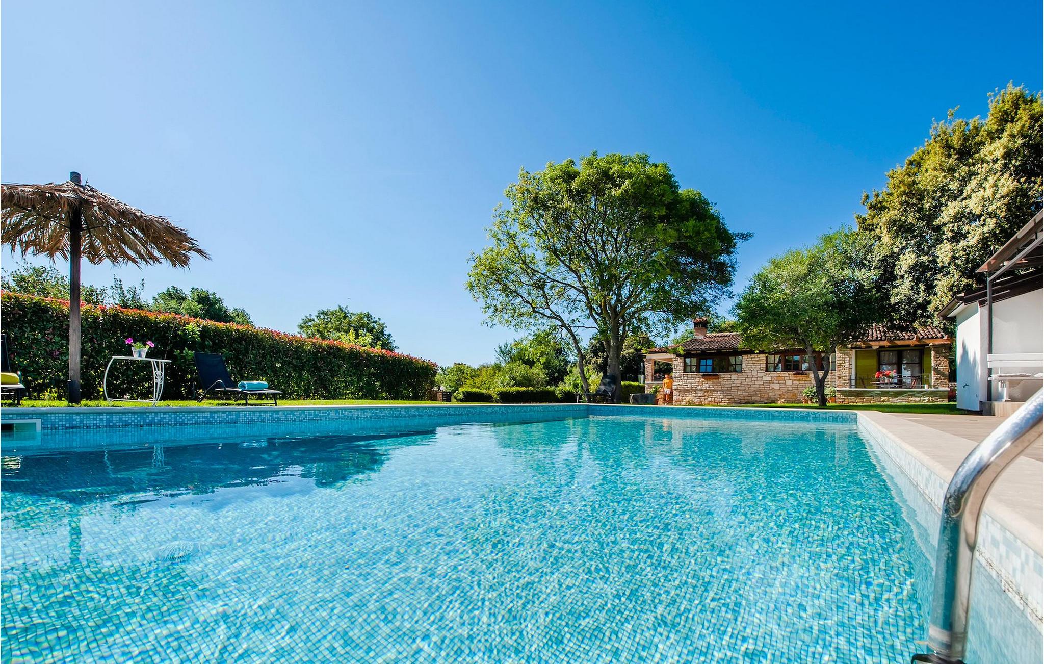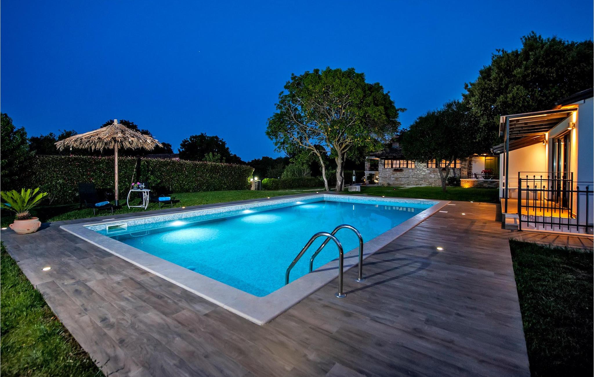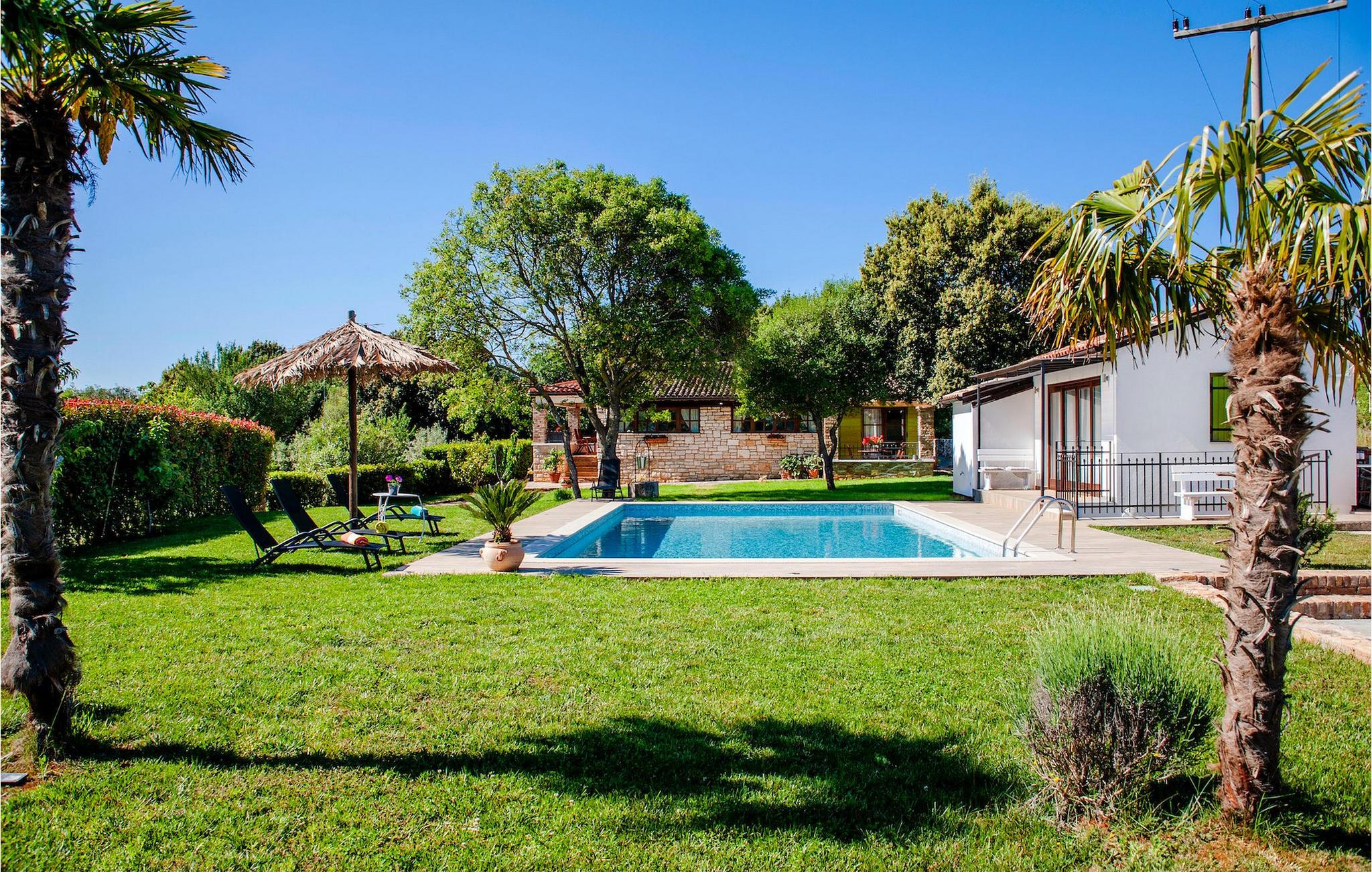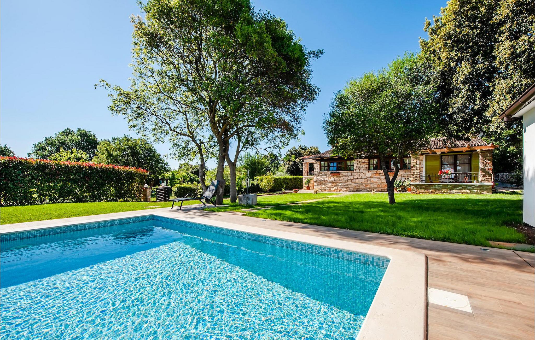 Die schöne moderne Villa Antica befindet sich in Meeresnähe in der Peripherie des alten Rovinj. Eine ihrer schönsten Eigenschaften ist der große Pool im Innenhof. Die Villa selbst bietet Platz für bis zu sieben Personen. Sie besteht aus zwei Häusern, dem Haupthaus und einem Studio-Apartment. Das Haupthaus verfügt über einen offenen Wohn- und Essbereich, sowie drei Schlafzimmer. Ein Schlafzimmer ist mit einem Doppelbett ausgestattet, während in den anderen beiden Zimmern jeweils ein Einzelbett steht. Außerdem gibt es ein großes Badezimmer mit Badewanne, in der Sie sich entspannen können. Draußen können Sie mit einem kalten Getränk auf der Terrasse oder auf den Sonnenliegen am Pool entspannen oder im 72 m² großen Pool schwimmen. Es gibt auch einen Grill, auf dem Sie großartige Mahlzeiten zubereiten können. Das Studio-Apartment bietet im Vergleich zum Haupthaus etwas mehr Privatsphäre. Es besteht aus einem Wohnzimmer mit einem Doppelbett für zwei Personen und verfügt über ein Badezimmer mit Dusche. Buchen Sie die Villa Antica für Ihren erholsamen Urlaub!Die Villa Antica befindet sich in einem Vorort der antiken Stadt Rovinj, einer der schönsten und romantischsten Städte Kroatiens. Sie ist nur wenige Gehminuten vom Strand Polari und wenige Autominuten vom Stadtzentrum entfernt. Im Zentrum können Sie das alte Netz von Steinstraßen erkunden, die auf die Spitze des Hügels führen, wo sich die schöne alte Kirche St. Euphemia befindet. Von der Spitze des Kirchturms aus können Sie die Aussicht genießen, die sich über die ganze Stadt erstreckt und niemanden gleichgültig lässt. Vom Zentrum aus können Sie in Richtung des Parkwaldes Zlatni Rt gehen, einer der schönsten Landschaften Westisstriens. Lassen Sie sich auf keinen Fall die Fahrt zum Lim-Kanal entgehen, einer der attraktivsten natürlichen Ressourcen in West-Istrien, der sich nur 15 Kilometer außerhalb von Rovinj befindet.