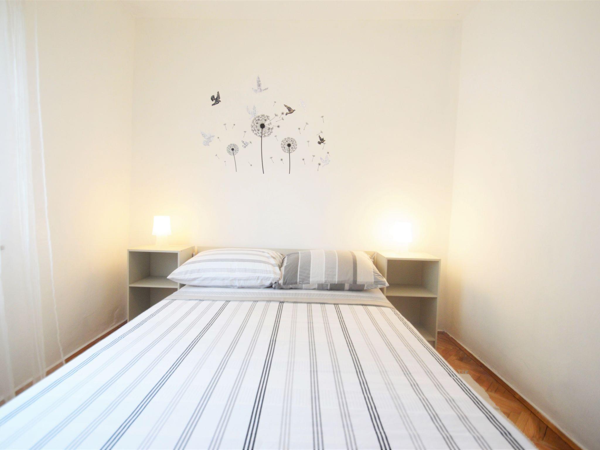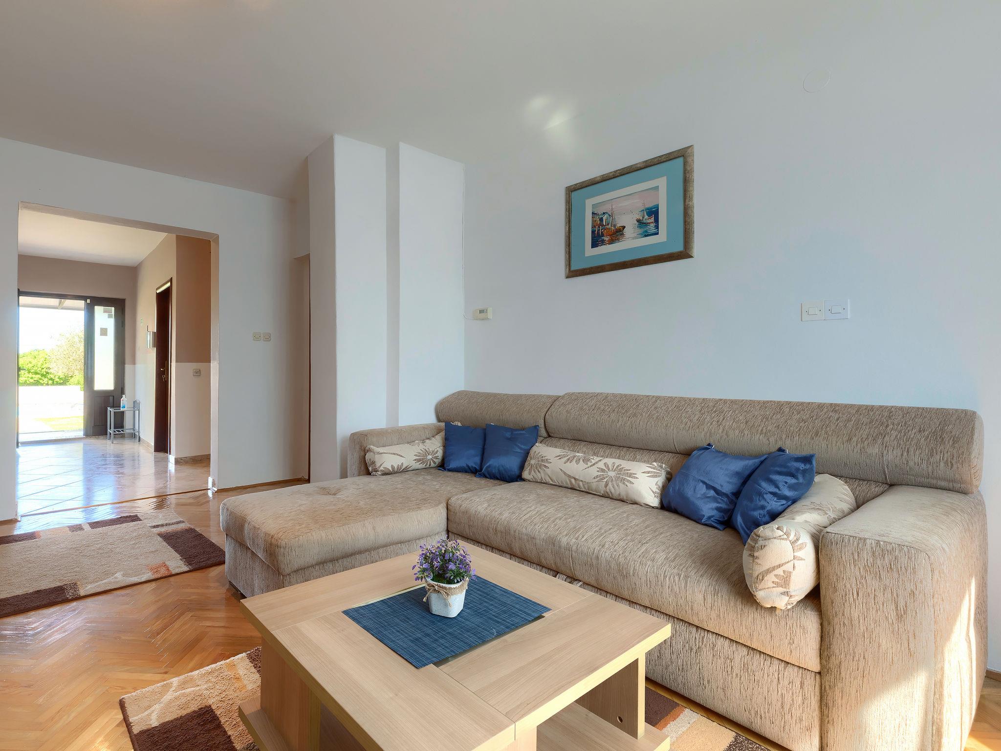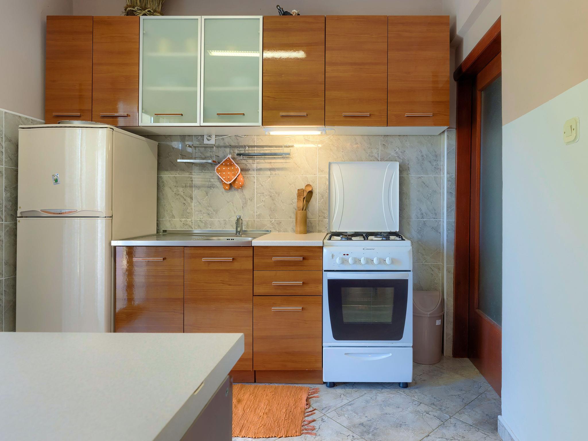 4-room house 100 m2. Living room with satellite TV (flat screen), air conditioning. Entrance hall. Exit to the balcony. 2 rooms, each room with 1 french bed. Exit to the balcony. 1 room with 1 french bed. Open kitchen (4 hot plates, dishwasher, toaster, kettle, microwave, freezer, electric coffee machine) with dining table. Exit to the terrace. Bath/WC. No heating option. 2 balconies, terrace 21 m2 partly roofed. Terrace furniture, barbecue (portable), deck chairs. Facilities: iron, children's high chair. Internet (WiFi, free). Please note: non-smoking house.