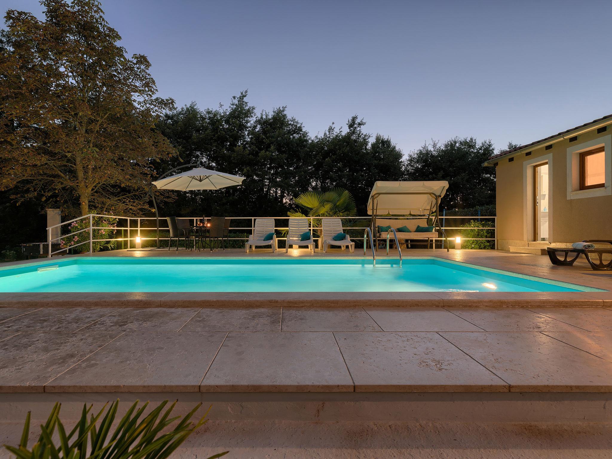 4-room house 100 m2. Living/dining room with 1 double sofabed and satellite TV (flat screen), air conditioning. Exit to the swimming pool. Entrance hall with air conditioning. 2 rooms, each room with 2 beds (90 cm, length 200 cm). 1 room with 1 french bed (160 cm, length 200 cm). Entrance hall with air conditioning. Open kitchen (1 hot plate, oven, dishwasher, 3 gas rings, toaster, kettle, microwave, freezer, electric coffee machine). 2 showers/WC. Forced-air heating. Deck chairs. View of the swimming pool. Facilities: iron, baby cot. Internet (WiFi, free). Please note: non-smoking house.