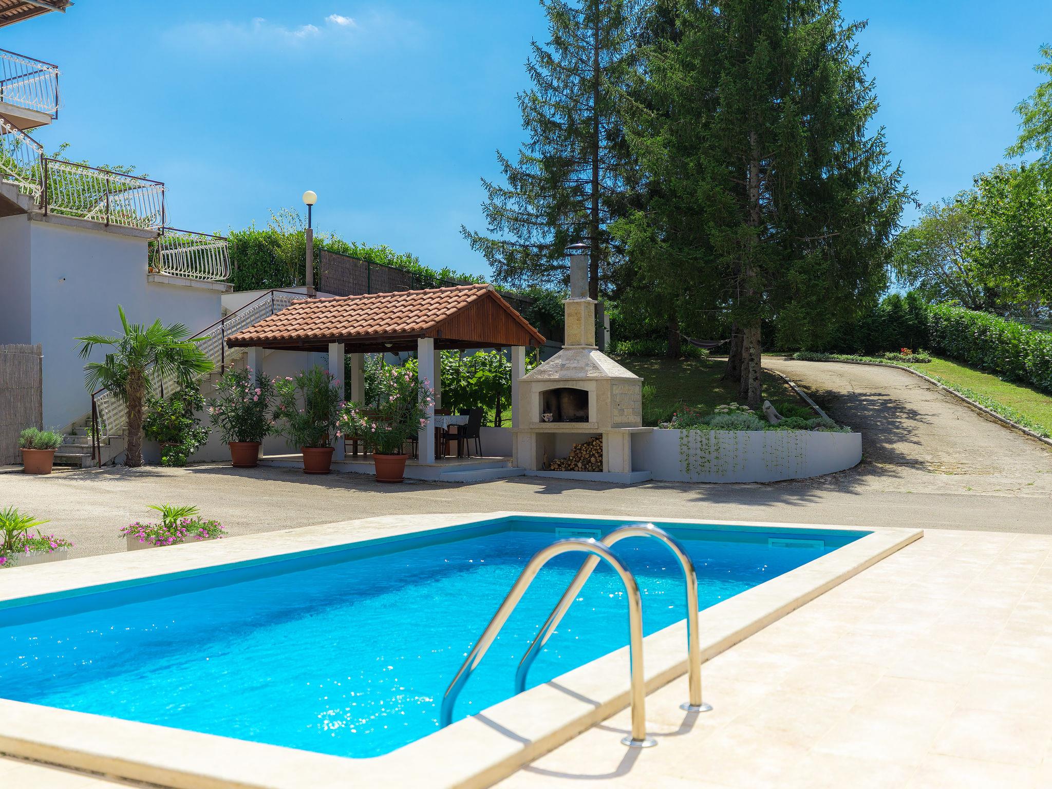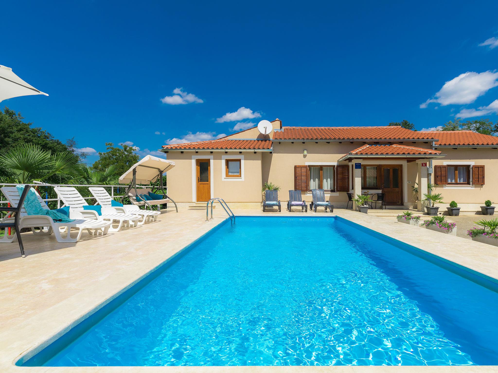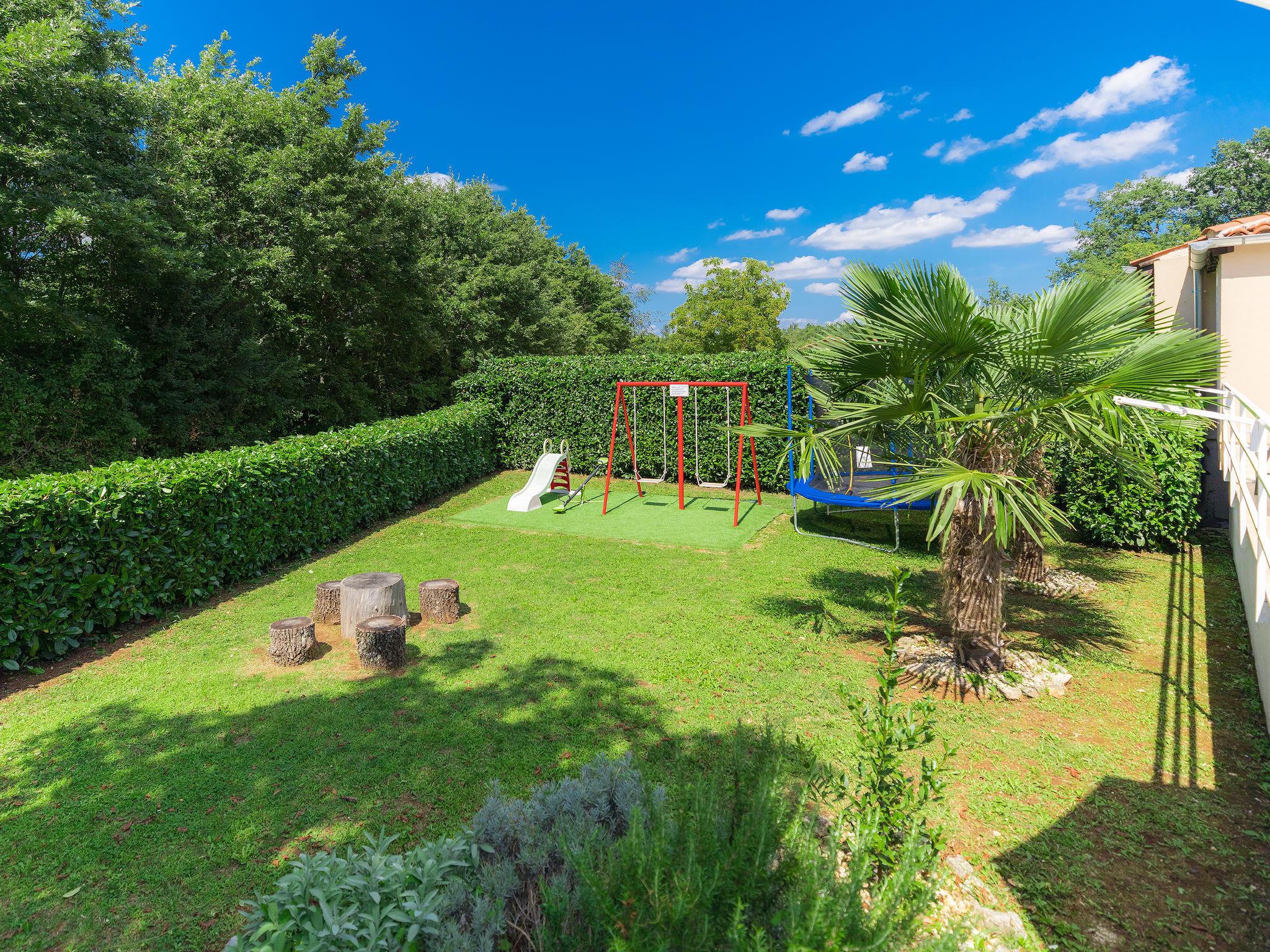 Single-family house "Liberat". In the hamlet Zgrablici 3 km from the centre of Žminj, 20 km from the sea. For shared use: property 5'000 m2 with lawn and plants. Private: swimming pool angular (7 x 3 m, 23 m2, depth 130 cm, seasonal availability: 15.May. - 30.Sep.). WC in the pool area, outdoor shower, arbour, terrace, garden furniture, barbecue, children's playground (slide, swing). In the house: internet access, washing machine. Parking on the premises. Shop 3 km, supermarket 3 km, restaurant 1 km, bus stop 4 km, rocky beach 28 km. Please note: the owner lives on the same property.
